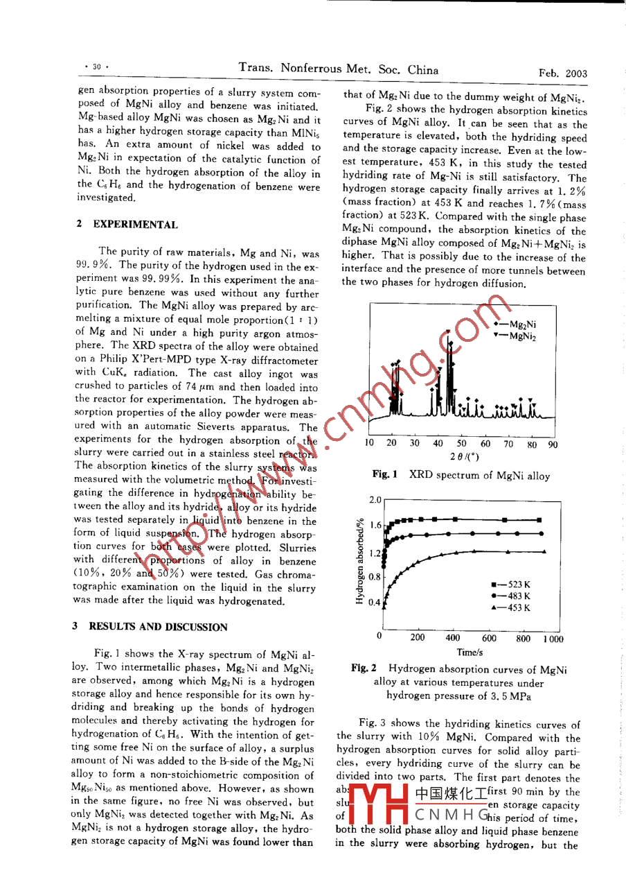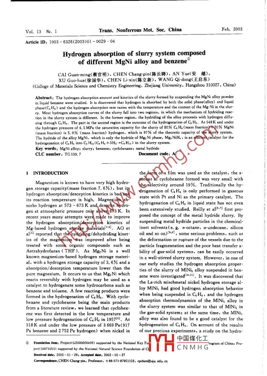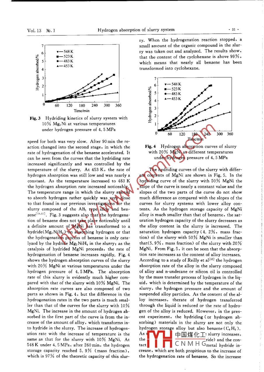 Vol.13 No. 1Trans. Nonferrous Met. Soc. ChinaFeb.2003Article ID: 1003 - 6326(2003)01 - 0029 - 04Hydrogen absorption of slurry system composedof different MgNi alloy and benzeneCAI Guan-ming(蔡官明), CHEN Chang pin(陳長(zhǎng)聘),AN Yue(安趣),XU Guo-hua(徐國(guó)華),CHEN Li-xin(陳立新), WANG Qi-dong(王啟東)(ollege of Materials Science and Chemistry Engineerng, Zhejiang University, Hangzhou 310027, China)Abstract: The hydrogen absorption anount and kinetics o[ the slurry formed by suspending the MgNi aly powderin liquid benzene were studied. It is discovered that hydrogen is absorbed by both the solid phase(ally) and liquidphase(C% He) and the hydrogen absorption rate varies with the temperature and the content of the Mg Ni in the slur-ry. Most hydrogen absorption curves of the slurry fall into two regijions, in which the mechanism of hydriding reac-tion in the slurry system is dfferent. In the former region, the bhydriding of the alloy proceeds with hydrogen diffu-sing through C% H. The part in the second region is the outcome of the hydrogenation of Cs H&. At 548K and underthe hydrogen pressure of 4.5 MPa the saturation capacity for the slurry of 80% Co Hs (mass fraction) + 20% MgNi(mass fraction) is 5. 9% (mass fraction) hydrogen, which is 97% of the theoretic capacity of the slurry system,The bydride of the alloy MgNi, which is only the hydride of Mgz Ni phase, Mgz NiH&, is an eficient catalyst for thehydrogenation of C。H, into C; Hx (C。Hs +3H2- +CHu2) in the slurry system.Key words: MgNi alloy ; slurry, benzene; eyclohexane; metal hydrideCLC number: TG 139.7Document code: A1 INTRODUCTIONthe form of a film was used as the catalyst, the a-mount of cyclohexene formed was very small withMagnesium is known to have very high hydro-the selectivity around 19%. Traditionally the hy-gen storage capacity(mass fraction 7. 6%), but itsdrogenation of CH。is only performed in gaseoushydrogen absorption/ desorption kinetics is bad andstate with Pt and Ni as the primary catalyst. Theits reaction temperature is high. Magnesium ab-sorbs hydrogen at 573 - 673 K and desorbs hydro-hydrogenation of C% H; in liquid state has not evengen at atmospheric pressure only above 673 K. Inbeen extensively studied. Reilly et al[6.7J first pro-recent years many attempts were made to improveposed the concept of the metal hydride slurry. B:the bydrogen absorption/ desorption kinetics ofsuspending metal hydride particles in the chemical-Mg-based hydrogen storage materials10. AO etinert solvents(e. g. n-octane, rundecane ,siliconal[6] reported that the hydriding/ dehydriding kinet-oil and so on)[8.9], some serious problems, such asics of the magnesium was improved after beingthe deformation or rupture of the vessels due to thetreated with some organic compounds such asparticle fragmentation and the poor heat transfer a-Aetrabydrofuran ( THF ). As Mg2Ni is a wellbility of gas-solid systems, can be easily occurredknown magnesium-based hydrogen storage materi-in a wel-stirred slurry system. However, in one ofal, with a hydrogen storage capacity of 3.6% and aour early studies the hydrogen absorption proper-absorption/ desorption temperature lower than theties of the slurry of MINis alloy suspended in ben-pure magnesium. It occurs to us that Mg: Ni whichzene were investigated d.1. It was discovered thatreacts reversibly with hydrogen may be used as athe La-rich mischmetal nickel hydrogen storage al-catalyst to hydrogenate some hydrocarbons such asloy MINi; had good hydrogen absorption behaviorbenzene and toluene. A few reacting products wereformed in the hydrogenation of Cr Hs. With cyclo-when being suspended in C; Hg, and the hydrogenhexane and cyclohexene being the main productsabsorption thermodynamics of the MINis alloy infrom a literature review, we learned that cyclohex-the slurry system was similar to that of MINis inene was first detected in the low temperature andthe gas-solid system; at the same time, the MINislow pressure hydrogenation of CgH。in 1957[6]. Atalloy was also found to be a good catalyst for the318K and under the low pressure of 3 669 Pa(917hydrogenation of C.H6. On account of the resultsPa benzene and 2752 Pa hydrogen) when nickel inof our precious experiments, a study on the hydro-中國(guó)煤化工D Foundation item: Projct(2000026406)0 suprted by the Nationalrogram of Chinal Pro-jc(500701053) supporied by the National Natural Science Foundation of CHYHCNMHG'Recelved datc; 2002 -01 - 281 Accepted date: 2002 -05 -27Correspondence .CHEN Chang-pin, Professor, + 86-571-87951152, cepchen@zju. edu. cn.30●Trans. Nonferrous Met. Soc. ChinaFeb. 2003gen absorption properties of a slurry system com-that of Mgz Ni due to the dummy weight of MgNi.posed of MgNi alloy and benzene was initiated.Fig. 2 shows the hydrogen absorption kineticsMg- based alloy MgNi was chosen as Mg2Ni and itcurves of MgNi alloy. It can be seen that as thehas a higher hydrogen storage capacity than MINigtemperature is elevated, both the hydriding speedhas. An extra amount of nickel was added toand the storage capacity increase. Even at the low-Mg:Ni in expectation of the catalytic function oest temperature, 453 K, in this study the testedNi. Both the hydrogen absorption of the alloy inhydriding rate of Mg-Ni is still satisfactory. Thethe CiHe and the hydrogenation of benzene werehydrogen storage capacity finally arrives at 1. 2%investigated.(mass fraction) at 453 K and reaches 1. 7% (massfraction) at 523 K. Compared with the single phase2 EXPERIMENTALMg: Ni compound, the absorption kinetics of thediphase MgNi alloy composed of Mg:Ni + MgNiz isThe purity of raw materials, Mg and Ni, washigher. That is possibly due to the increase of the99. 9%. The purity of the hydrogen used in the ex-interface and the presence of more tunnels betweenperiment was 99. 99%. In this experiment the ana-the two phases for hydrogen diffusion.lytic pure benzene was used without any furtherpurification. The MgNi alloy was prepared by arcm