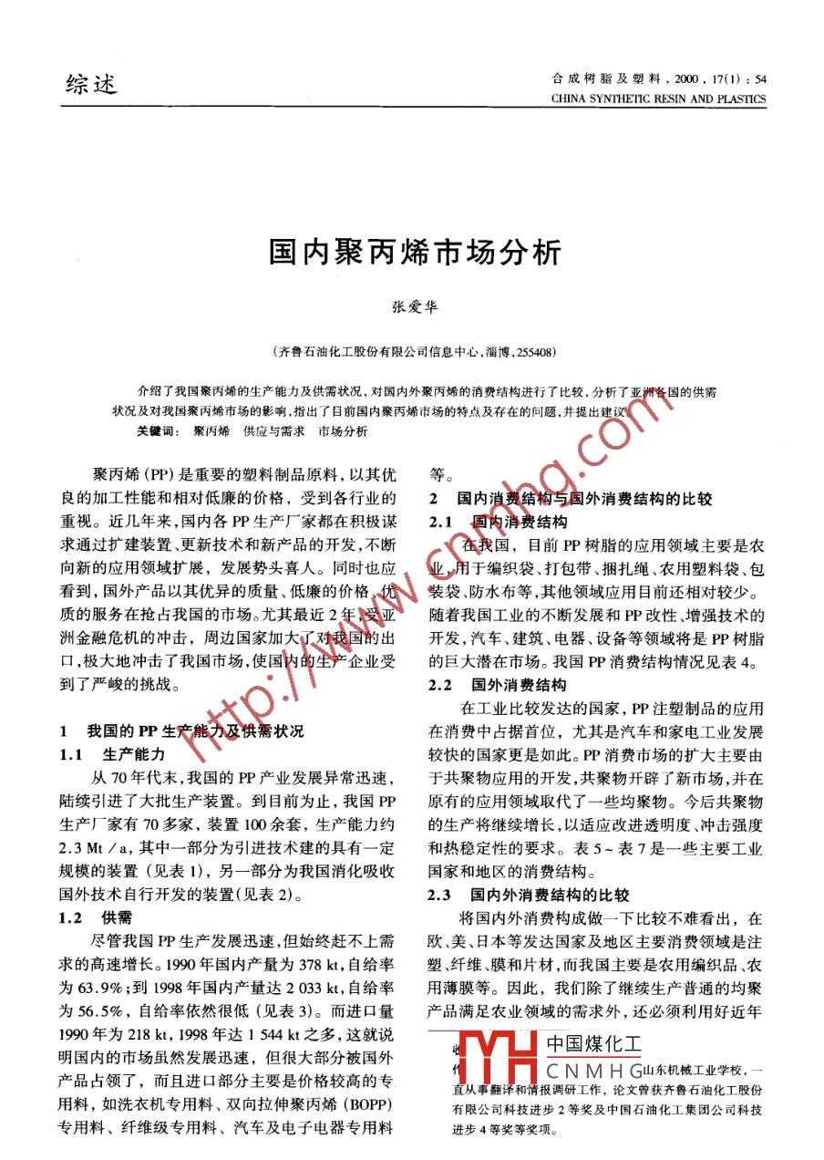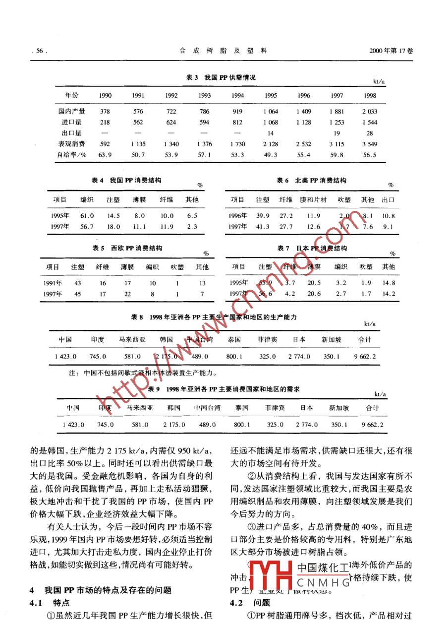 綜述合成樹脂及塑料,2000,17(1):54CHINA SYNTHETIC RESIN AND PLASTICS國內(nèi)聚丙烯市場分析張愛華(齊魯石油化工股份有限公司信息中心,淄博,255408)介紹了我國聚丙烯的生產(chǎn)能力及供需狀況,對國內(nèi)外聚丙烯的消費(fèi)結(jié)構(gòu)進(jìn)行了比較,分析了亞洲各國的供需狀況及對我國聚丙烯市場的影響,指出了目前國內(nèi)聚丙烯市場的特點(diǎn)及存在的問題,并提出建議。關(guān)鍵詞:聚丙烯供應(yīng)與需求市場分析聚丙烯(PP)是重要的塑料制品原料,以其優(yōu)等。良的加工性能和相對低廉的價格,受到各行業(yè)的2國內(nèi)消費(fèi)結(jié)構(gòu)與國外消費(fèi)結(jié)構(gòu)的比較重視。近幾年來,國內(nèi)各PP生產(chǎn)廠家都在積極謀2.1國內(nèi)消費(fèi)結(jié)構(gòu)求通過擴(kuò)建裝置、更新技術(shù)和新產(chǎn)品的開發(fā),不斷在我國,目前PP樹脂的應(yīng)用領(lǐng)域主要是農(nóng)向新的應(yīng)用領(lǐng)域擴(kuò)展,發(fā)展勢頭喜人。同時也應(yīng)業(yè),用于編織袋、打包帶、捆扎繩、農(nóng)用塑料袋、包看到,國外產(chǎn)品以其優(yōu)異的質(zhì)量、低廉的價格、優(yōu)裝袋防水布等,其他領(lǐng)域應(yīng)用目前還相對較少。質(zhì)的服務(wù)在搶占我國的市場。尤其最近2年,受亞隨著我國工業(yè)的不斷發(fā)展和PP改性、增強(qiáng)技術(shù)的洲金融危機(jī)的沖擊,周邊國家加大了對我國的出開發(fā),汽車建筑、電器、設(shè)備等領(lǐng)域?qū)⑹荘P樹脂口,極大地沖擊了我國市場,使國內(nèi)的生產(chǎn)企業(yè)受的巨大潛在市場。我國PP消費(fèi)結(jié)構(gòu)情況見表4到了嚴(yán)峻的挑戰(zhàn)2.2國外消費(fèi)結(jié)構(gòu)在工業(yè)比較發(fā)達(dá)的國家,P注塑制品的應(yīng)用1我國的PP生產(chǎn)能力及供需狀況在消費(fèi)中占據(jù)首位,尤其是汽車和家電工業(yè)發(fā)展1.1生產(chǎn)能力較快的國家更是如此。PP消費(fèi)市場的擴(kuò)大主要由從70年代末,我國的P產(chǎn)業(yè)發(fā)展異常迅速,于共聚物應(yīng)用的開發(fā),共聚物開辟了新市場,并在陸續(xù)引進(jìn)了大批生產(chǎn)裝置。到目前為止,我國PP原有的應(yīng)用領(lǐng)域取代了一些均聚物。今后共聚物生產(chǎn)廠家有70多家,裝置100余套,生產(chǎn)能力約的生產(chǎn)將繼續(xù)增長,以適應(yīng)改進(jìn)透明度、沖擊強(qiáng)度2.3Mt/a,其中一部分為引進(jìn)技術(shù)建的具有一定和熱穩(wěn)定性的要求。表5~表7是一些主要工業(yè)規(guī)模的裝置(見表1),另一部分為我國消化吸收國家和地區(qū)的消費(fèi)結(jié)構(gòu)國外技術(shù)自行開發(fā)的裝置(見表2)。2.3國內(nèi)外消費(fèi)結(jié)構(gòu)的比較1.2供需將國內(nèi)外消費(fèi)構(gòu)成做一下比較不難看出,在盡管我國PP生產(chǎn)發(fā)展迅速,但始終趕不上需歐、美、日本等發(fā)達(dá)國家及地區(qū)主要消費(fèi)領(lǐng)域是注求的高速增長。1990年國內(nèi)產(chǎn)量為378kt,自給率塑、纖維、膜和片材,而我國主要是農(nóng)用編織品、農(nóng)為63.9%;到1998年國內(nèi)產(chǎn)量達(dá)2033kt,自給率用薄膜等。因此,我們除了繼續(xù)生產(chǎn)普通的均聚為56.5%,自給率依然很低(見表3)。而進(jìn)口量產(chǎn)品滿足農(nóng)業(yè)領(lǐng)域的需求外,還必須利用好近年1990年為28kt,1998年達(dá)1544k之多,這就說明國內(nèi)的市場雖然發(fā)展迅速,但很大部分被國外中國煤化工產(chǎn)品占領(lǐng)了,而且進(jìn)口部分主要是價格較高的專CNMHG山東機(jī)械工業(yè)學(xué)校,直從事報(bào)調(diào)研工作,論文曾獲齊魯石油化工股份用料,如洗衣機(jī)專用料、雙向拉伸聚丙烯(BOPP)有限公司科技進(jìn)步2等獎及中國石油化工集團(tuán)公司科技專用料、纖維級專用料、汽車及電子電器專用料進(jìn)步4等獎等獎項(xiàng)。張愛華.國內(nèi)聚丙烯市場分析表1我國引進(jìn)的PP裝置生產(chǎn)能力企業(yè)名稱投產(chǎn)日期/年設(shè)計(jì)能力kt·a1現(xiàn)有能力At·a使用技術(shù)上海石油化工股份有70海蒙特 Spheripol工藝限公司塑料事業(yè)部(環(huán)管)液相本體-氣相法撫順乙烯化工有限公司海蒙特 Spheripol工藝(環(huán)管)液相本體-氣相法天津聯(lián)合化學(xué)有限公司海蒙特 SpheripoL藝(環(huán)管)液相本體一氣相法中原石油化工有限海蒙特 Spheripol藝責(zé)任公司(環(huán)管)液相本體一氣相法茂名石化乙烯工業(yè)海蒙特 Spheric工藝公司(環(huán)管)液相本體-氣相法齊魯石油化工股份海蒙特 Spheripol工藝有限公司(環(huán)管)液相本體一氣相法大連西太平洋石油海蒙特$ phenicol藝化工有限公司(環(huán)管)液相本體-氣相法新獨(dú)山子石油化海蒙特 Spheripol工藝工總廠乙烯廠(環(huán)管)液相本體一氣相法揚(yáng)子石油化工股三井油化 HypoL藝份有限公司(釜式)液相本體一氣相法盤錦乙烯工業(yè)公1990(釜式)液相本體-氣相法廣州石油化工總廠乙烯廠1996井油化Hyo藝(釜式)液相本體一氣相法廣州石油化工總廠北京燕山石油化工有限公司三井油化溶劑法遼陽石油化纖公司Amoco液相法合計(jì)1270表2我國自行設(shè)計(jì)的PP生產(chǎn)能力在新產(chǎn)品開發(fā)方面的研究成果,大力開發(fā)共聚產(chǎn)企業(yè)名稱投產(chǎn)日期年設(shè)計(jì)能力/品和進(jìn)行PP改性,以提高PP樹脂的性能,適應(yīng)注塑