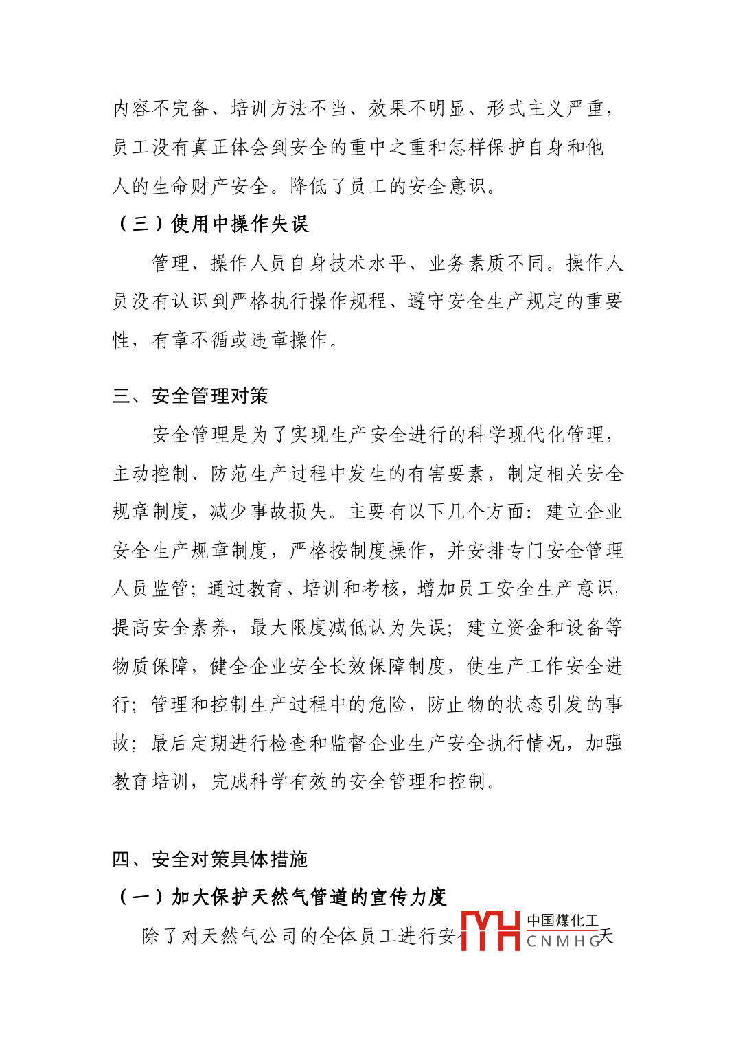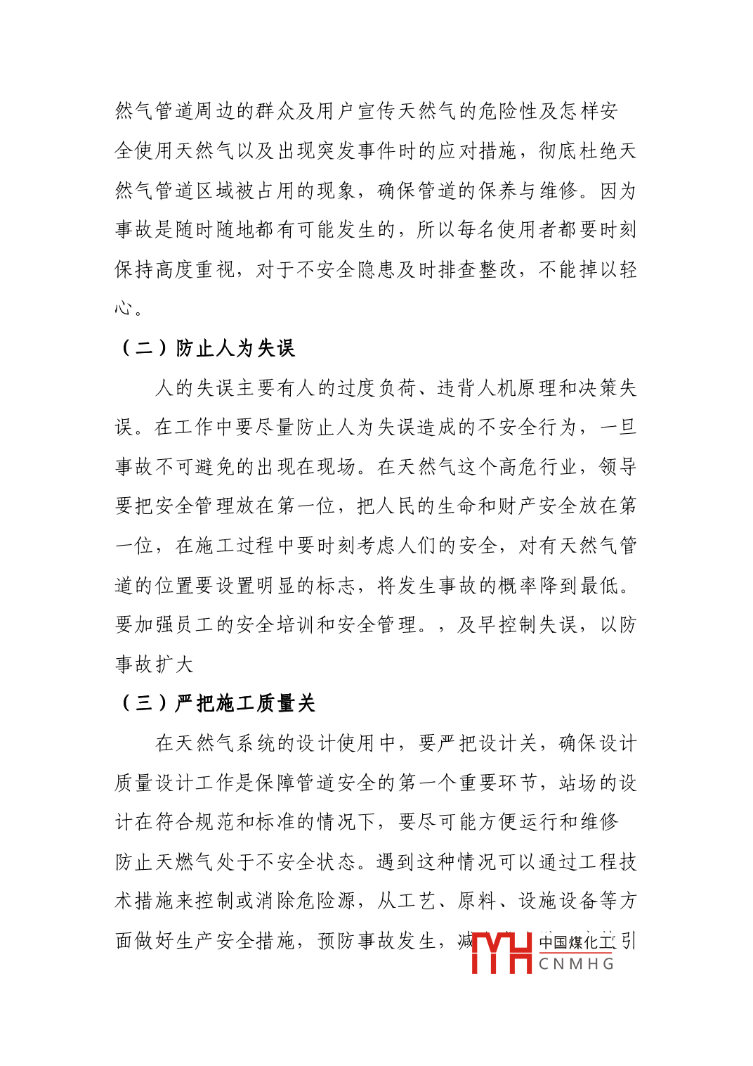 天然氣安全管理的探討研究林春先撫順中燃燃?xì)獍l(fā)展有限公司遼寧撫順113008【摘要】天然氣使用發(fā)展進(jìn)入繁榮時(shí)期,管道長(zhǎng)度的日益增加,讓天燃?xì)庀到y(tǒng)安全問(wèn)題顯得日益嚴(yán)峻。探討天燃?xì)獾陌踩珜?duì)策與預(yù)案,能進(jìn)一步提高能源使用的安全與效率?!娟P(guān)鍵詞】天然氣對(duì)策安全當(dāng)前,天然氣已為重要能源。天然氣有連續(xù)供應(yīng)性,旦主遭到破壞,容易造成天然氣持續(xù)大量泄漏,引起大火或爆炸,火勢(shì)蔓延迅速,使事故的波及范圍不斷擴(kuò)大。因此,加強(qiáng)天然氣的安全管理,是一項(xiàng)重要而艱巨的任務(wù)。文章通過(guò)對(duì)天然氣管道進(jìn)行風(fēng)險(xiǎn)評(píng)價(jià)結(jié)果,具體針對(duì)天然氣泄漏、閥組工藝區(qū)泄漏管道發(fā)生嚴(yán)重的外輸中斷等引發(fā)的火災(zāi)、爆炸事故原因進(jìn)行了分析。并提出相應(yīng)的安全策略。從而將引發(fā)的風(fēng)險(xiǎn)水平控制和管理在一定的范圍內(nèi),從而達(dá)到達(dá)到降低事故發(fā)生頻率,實(shí)現(xiàn)資源合理利用和優(yōu)化配置的目的。天然氣的不安全行為的表現(xiàn)天然氣的不安全行為主要表現(xiàn)天然氣大量泄漏、閥組工藝區(qū)泄漏引起火和管道發(fā)生嚴(yán)重的外輸中天然氣大量泄漏可能會(huì)岀現(xiàn)兩種情況,一種是普通的泄漏,另一種是因天然氣的大量泄漏導(dǎo)致的爆炸H中國(guó)煤化工因CNMHG是道路施工挖破天然氣主管道和使用天然氣不當(dāng)?shù)牟话踩袨楫a(chǎn)生的。另外,施工單位或居民不重視天燃?xì)夤艿赖拇嬖诨蚋静恢捞烊粴夤艿赖奈恢?在埋有天然氣管道的地方違章修建建筑物,致使天然氣管道不能正常維修。此外,有些天然氣公司施工時(shí)為了節(jié)約成本購(gòu)買(mǎi)不合格的管道,達(dá)不到實(shí)際使用年限,造成管道過(guò)早被腐蝕而天然氣泄漏天然氣管道中不安全行為原因分析人是生產(chǎn)活動(dòng)中主觀(guān)性最強(qiáng),最活躍的因素,導(dǎo)致天然氣管道人的不安全行為的原因也是多種多樣的,主要有以下幾個(gè)方面(一)安全管理不到位安全管理是利用計(jì)劃、組織、指揮、協(xié)調(diào)、控制等管理機(jī)能控制來(lái)自自然界、機(jī)械和物質(zhì)的不安全因素和人的不安全行為,避免事故發(fā)生,保障職工的生命安全和健康,保證企業(yè)生產(chǎn)順利進(jìn)行。然而安全工作帶來(lái)的效益主要是社會(huì)效益,安全工作的經(jīng)濟(jì)效益往往表現(xiàn)為減少事故經(jīng)濟(jì)損失的隱性效益,不像生產(chǎn)經(jīng)營(yíng)效益那樣直接、明顯。因此,企業(yè)常常忽視安全管理,從而導(dǎo)致作業(yè)人員的不安全行為(二)教育培訓(xùn)不充分對(duì)員工職業(yè)技能和安全培訓(xùn)不充分也是引起不安全行為的又一重要原因,在培訓(xùn)中出現(xiàn)未經(jīng)TYH中國(guó)煤化工的CNMHG內(nèi)容不完備、培訓(xùn)方法不當(dāng)、效果不明顯、形式主義嚴(yán)重,員工沒(méi)有真正體會(huì)到安全的重中之重和怎樣保護(hù)自身和他人的生命財(cái)產(chǎn)安全。降低了員工的安全意識(shí)。三)使用中操作失誤管理、操作人員自身技術(shù)水平、業(yè)務(wù)素質(zhì)不同。操作人員沒(méi)有認(rèn)識(shí)到嚴(yán)格執(zhí)行操作規(guī)程、遵守安全生產(chǎn)規(guī)定的重要性,有章不循或違章操作三、安全管理對(duì)策安全管理是為了實(shí)現(xiàn)生產(chǎn)安全進(jìn)行的科學(xué)現(xiàn)代化管理,主動(dòng)控制、防范生產(chǎn)過(guò)程中發(fā)生的有害要素,制定相關(guān)安全規(guī)章制度,減少事故損失。主要有以下幾個(gè)方面:建立企業(yè)安全生產(chǎn)規(guī)章制度,嚴(yán)格按制度操作,并安排專(zhuān)門(mén)安全管理人員監(jiān)管;通過(guò)教育、培訓(xùn)和考核,增加員工安全生產(chǎn)意識(shí),提高安全素養(yǎng),最大限度減低認(rèn)為失誤;建立資金和設(shè)備等物質(zhì)保障,健全企業(yè)安全長(zhǎng)效保障制度,使生產(chǎn)工作安全進(jìn)行;管理和控制生產(chǎn)過(guò)程中的危險(xiǎn),防止物的狀態(tài)引發(fā)的事故;最后定期進(jìn)行檢查和監(jiān)督企業(yè)生產(chǎn)安全執(zhí)行情況,加強(qiáng)教育培訓(xùn),完成科學(xué)有效的安全管理和控制。四、安全對(duì)策具體措施(一)加大保護(hù)天然氣管道的宣傳力度中國(guó)煤化工除了對(duì)天然氣公司的全體員工進(jìn)行安HCNMHG天然氣管道周邊的群眾及用戶(hù)宣傳天然氣的危險(xiǎn)性及怎樣安全使用天然氣以及出現(xiàn)突發(fā)事件時(shí)的應(yīng)對(duì)措施,徹底杜絕天然氣管道區(qū)域被占用的現(xiàn)象,確保管道的保養(yǎng)與維修。因?yàn)槭鹿适请S時(shí)隨地都有可能發(fā)生的,所以每名使用者都要時(shí)刻保持高度重視,對(duì)于不安全隱患及時(shí)排查整改,不能掉以輕(二)防止人為失誤人的失誤主要有人的過(guò)度負(fù)荷、違背人機(jī)原理和決策失誤。在工作中要盡量防止人為失誤造成的不安全行為,一旦事故不可避免的出現(xiàn)在現(xiàn)場(chǎng)。在天然氣這個(gè)高危行業(yè),領(lǐng)導(dǎo)要把安全管理放在第一位,把人民的生命和財(cái)產(chǎn)安全放在第位,在施工過(guò)程中要