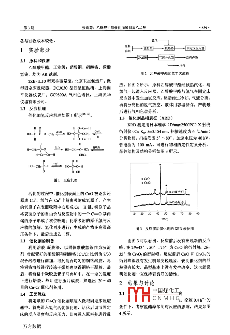 化工進(jìn)展CHEMICAL INDUSTRY AND ENGINEERING PROGRESS2011年第30卷第3期研究開發(fā)乙醇酸甲酯催化加氫制備乙二醇張躍,宗愷,嚴(yán)生虎,劉建武,沈介發(fā)(常州大學(xué)精細(xì)化工研究所,江蘇常州213164)摘要:在微型固定床反應(yīng)器上,以乙醇酸甲酯為原料,使用CuCr催化劑,催化加氫制備了乙二醇.考察了氫酯摩爾比,反應(yīng)溫度、反應(yīng)壓力、床層空速對反應(yīng)的影響,并對加氫催化劑的活性進(jìn)行了XRD的評價。結(jié)果顯示最佳反應(yīng)條件為:氬酯摩爾比40:1、反應(yīng)溫度210℃反應(yīng)壓力35MPa、床層空速04h時,乙醉酸甲酯的轉(zhuǎn)化率達(dá)94%,乙二醇的選擇性達(dá)82%,關(guān)鍵詞:銅鉻(CuCr)催化劑;乙醇酸甲酯;乙二醇;催化加氫中圖分類號:O643.38文獻(xiàn)標(biāo)志碼:A文章編號:1000-6613(2011)03-638-04Catalytic hydrogenation of methyl glycolate to ethylene glycolZHANG Yue, ZoNG Kai, YAN Shenghu, LIU Jianwu, SHEN Jiefa(Research Institute of Fine Chemical Engineering, Changzhou University, Changzhou 213164, Jiangsu, China)Abstract: In a micro fixed-bed reactor, preparation of ethylene glycol by catalytic hydrogenation ofmethyl glycolate using composite copper-based catalyst Cu-Cr was studied. The effects of mole ratio ofhydrogen to methyl glycolate, reaction temperature, pressure, space velocity on the hydrogenationreaction were investigated. The activity of the catalysts was evaluated by XRD. The results showed thatunder optimized conditions of reaction temperature 210 C, reaction pressure around 3.5 MPa, molratio of hydrogen to methyl glycolate close to 40: 1, space velocity about 0. 4 h", the conversion ofmethyl glycolate to ethylene glycol reached 95%, and the molar selectivity of ethylene glycol reachedKey words: catalyst Cu-Cr; methyl glycolate; ethylene glycol; catalytic hydrogenation乙二醇(EG)主要用于生產(chǎn)聚對苯二甲酸乙二19世紀(jì)80年代ARCO公司申請了以草酸酯為酯(聚酯纖維和聚酯塑料的原料)、潤滑劑、非離子原料加氫制備乙二醇的專利,研發(fā)出了CuCr催化表面活性劑以及炸藥,此外還可用于汽車、航空等劑,乙:醇的收率為95%。UCC與竽部興產(chǎn)聯(lián)合又工業(yè)中的重要抗凍劑,純度較高的乙二醇還可用作開發(fā)了CuSO2催化劑,乙二醇收率提高到了過硼酸銨的溶劑和介質(zhì),乙二醇還可用于生產(chǎn)特種97,2%21。但是近年來,乙醇工業(yè)又進(jìn)入了低介質(zhì)和溶劑4。乙醇酸甲酯(HOCH2 COOCH2)是迷的狀態(tài)45。所以開發(fā)新工藝很重要。種非常重要的藥物和有機(jī)合成中間體7本工作以乙醇酸甲酯為原料,利用復(fù)合銅鉻基目前國內(nèi)外大型乙二醇的生產(chǎn)廠家主要是環(huán)催化劑催化加氫制備乙二醇。該工藝原料廉價,催氧乙烷加壓水合法的工藝路線。生產(chǎn)技術(shù)主要由化劑活性較高日不易失活可重復(fù)使用,催化劑的制殼牌(She),美國 Halcon-SD以及美國聯(lián)合碳化中國煤化工物(UUC)3家公司壟斷91,近些年。國外多家收稿日CNMHG2I公司相繼開發(fā)出了環(huán)氧乙烷催化水合法、碳酸乙烯第一作丿,男,賜工,甽兀貝,主要從事廠業(yè)催化化學(xué)工程、有機(jī)金屬化合物方面的研究。聯(lián)系人:劉建武,Emal酯法和合成氣法等新的生產(chǎn)方法第3期張躍等:乙醇酸甲酯催化加氫制備乙二639備與回收成本較低。氫氣原料1實驗部分預(yù)熱器固定床反應(yīng)器溶劑11原料和儀器冷卻器氣液分滿器反應(yīng)產(chǎn)物乙醇酸甲酯,工業(yè)級:硝酸銅、硝酸鉻、碳酸氫銨,均為AR試劑圖2乙醇酸甲酯加氫工藝流程2ZB-1L10型雙柱微量泵,北京卩星制造廠;微型固定床反應(yīng)器:DC3030型低溫恒溫槽,上海衡應(yīng)。如圖2所示,原料乙醇酸甲酯經(jīng)預(yù)熱汽化,與平儀器儀表廠;GC9890A氣相色譜儀,上海靈華氫氣一起通入反應(yīng)器,乙醇酸甲酯與氫氣在固定床反應(yīng)器中發(fā)生加氫反應(yīng),然后過冷卻,氣液分離,儀器有限公司再將分離出的氫氣放空,液體用容器儲存,產(chǎn)物最1.2反應(yīng)機(jī)理后進(jìn)行氣相色譜分析。催化加氫反應(yīng)機(jī)理如圖1所示16115催化劑晶相表征(XRD)XRD測定用日本理學(xué)(D/max2500PC)X射線H OCrEH0-(-0cHx出-10oH,衍射儀(CuKa,A=0.154m,掃描速度為6℃/min)H O-CrH分析物相,掃描范圍5°~80°,加速電壓為40kV,H管電流為100mA。可進(jìn)行物相的定性定量分析,H-CHrC-OHO-CI晶體結(jié)構(gòu)及結(jié)構(gòu)分析如圖3所示u-Cy-HO-CH-C-H E II0圖1反應(yīng)機(jī)理a Cr,O,活化的過程中,催化劑表面上的CuO被逐步還CuCr反應(yīng)后原成Cu°,氫氣在Cu°上解離吸附成氫原子,產(chǎn)生CuCr還原態(tài)的氫原子在表面吸附中心形成Cu-H鍵。銅原子晶格表面原子的自由價與反應(yīng)物中的一個C=O基兩端的原子形成了雙位吸附:化學(xué)吸附的原子氫與反應(yīng)物的氫解、氫化同步進(jìn)行;生成的產(chǎn)物在高溫高圖3反應(yīng)前后催化劑的XRD表征圖壓條件卜,最后生成乙二醇1.3催化劑的制備由圖3可以看出,反應(yīng)前后沒有出現(xiàn)新的反應(yīng)利用溶膠凝膠法,以固體碳酸氫銨作為沉淀峰。在26=43°、50°、75°為CuO的衍射峰,2=劑,對配置好的硝酸銅和硝酸鉻(CuCr比例為7/3)35°為Cr2O3的衍射峰,反應(yīng)前后CuO和C2O3的混合溶液進(jìn)行滴加,得到混合均勻的銅鉻溶膠,再衍射峰都沒有發(fā)生明顯變銳現(xiàn)象,表明催化劑的晶將銅鉻溶膠進(jìn)行冷凍干燥處理制得銅鉻干凝膠。最粒沒有長大,晶型基本上沒有發(fā)牛改變