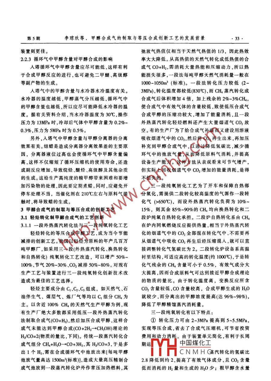 甲醇合成氣的制取與等壓合成創(chuàng)新工藝的發(fā)展前景