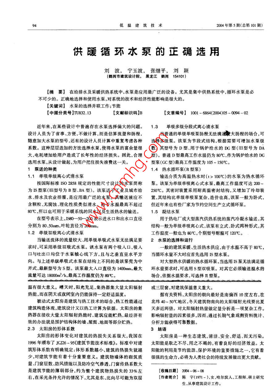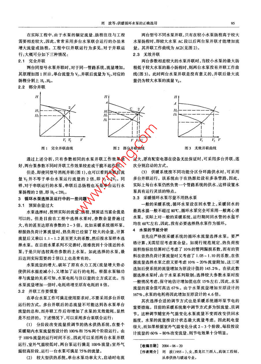 低溫建筑技術(shù)2004年第5期(總第101期)供暖循環(huán)水泵的正確選用劉波,寧玉波,張繼平,劉穎鶴崗市建筑設(shè)計(jì)院,黑龍江鶴崗154101)【摘要】在給排水及采暖供熱系統(tǒng)中,水泵是應(yīng)用最廣泛的設(shè)備。尤其是集中供熱系統(tǒng)中循環(huán)水泵是必不可少的。正確地選擇和使用水泵,對(duì)系統(tǒng)的技術(shù)和經(jīng)濟(jì)性能影響是很大的?!娟P(guān)鍵詞】水泵的選擇并聯(lián)工作;節(jié)能【中圖分類(lèi)號(hào)】TU83213【文獻(xiàn)標(biāo)識(shí)碼】B【文章編號(hào)】1001-6864(2004)05-004-02近年來(lái),在某些設(shè)計(jì)中普遍存在水泵選擇偏大的問(wèn)題。1.3單吸多級(jí)分段式離心清水泵設(shè)計(jì)人員為了省事、方便,不做計(jì)算,而是估算流量和揚(yáng)程,當(dāng)普通的單級(jí)單吸泵揚(yáng)程無(wú)法滿(mǎn)墩大揚(yáng)程的場(chǎng)合,可隨意加大水泵的型號(hào),還有的設(shè)計(jì)人員計(jì)算中重復(fù)考慮各種選擇多級(jí)泵。該泵為節(jié)段式結(jié)構(gòu),根據(jù)需要可增加水泵級(jí)系數(shù)。這種層層迭加的方法選擇水泵,使得水泵的富余量很數(shù)。其型號(hào)為D型、用于鍋爐給水的DG型(舊型號(hào)為DA大,電耗增加給用戶(hù)造成了長(zhǎng)年性的經(jīng)濟(jì)損失。因此,合理型)。普通D型最高工作水溫仍為80℃,作為鍋爐給水的DG選用水泵,從設(shè)計(jì)做起,為用戶(hù)把住損失浪費(fèi)這一關(guān)。型泵(GC型)最高工作溫度為105~150℃。1泵送的種類(lèi)1.4熱水循環(huán)泵(R型泵)1.1單吸單級(jí)離心式清水泵輸送介質(zhì)為高溫?zé)崴畷r(shí)(1>100℃C)的水泵為熱水循環(huán)按國(guó)際標(biāo)準(zhǔn)SO2858規(guī)定的性能尺寸設(shè)計(jì)的水泵簡(jiǎn)稱(chēng)泵。該泵為單級(jí)單吸離心式水泵,最高工作溫度可達(dá)200為I型泵(舊型號(hào)為B型、BA型)。該泵適于工業(yè)及城市給250℃。其密封裝置采用耐高溫密封結(jié)構(gòu),又增加了冷卻裝水、排水及農(nóng)業(yè)排灌,是應(yīng)用最廣泛的水泵。其輸送液應(yīng)不置,其結(jié)構(gòu)比單級(jí)單吸泵復(fù)雜,造價(jià)也高,該泵一般為臥式,含顆粒、無(wú)腐蝕、理化性質(zhì)類(lèi)似清水。由于水溫最高不超過(guò)但近年來(lái)也有些廠(chǎng)家為節(jié)約空間生產(chǎn)立式循環(huán)泵80℃,所以也可用于采暖系統(tǒng)的回水以及生活熱水的輸送。1.5凝結(jié)水泵在型號(hào)表示上,8050-200表示進(jìn)水口和出水口直徑用于熱電廠(chǎng)或大型蒸汽供熱系統(tǒng)的蒸汽冷凝水輸送,其分別為80、50mm,葉輪直徑為200mme結(jié)構(gòu)一般為單級(jí)單吸離心式,該泵有立式、臥式兩種形式,其12單級(jí)雙吸離心式清水泵工作溫度一般也為80℃,個(gè)別型號(hào)耐溫可120℃。當(dāng)輸送流體的流量較大、用單級(jí)單吸式水泵無(wú)法滿(mǎn)足要2水泵的選擇和運(yùn)行求時(shí),可采用單級(jí)雙吸式水泵。該水泵有兩個(gè)吸入口,吸入一般的建筑采暖生活熱水供應(yīng),由于水溫不高于80℃口與吐出口均位于水泵軸心線(xiàn)下方,且與之垂直呈水平方當(dāng)循環(huán)水量不大時(shí)應(yīng)首先選用S型水泵。向。與上述單級(jí)單吸式水泵在結(jié)構(gòu)上不同的是該泵殼為中對(duì)大型熱水供暖的熱水循環(huán)泵,當(dāng)選用Is泵無(wú)法滿(mǎn)足循開(kāi)式,最新型號(hào)為S型。該泵最大入口直徑為140m,最大環(huán)水量要求時(shí),可選用S型雙吸泵。對(duì)其它必須輸送溫水的流量可達(dá)1800m3/h,最高工作溫度仍為80℃。場(chǎng)合,依據(jù)水溫要求,可選擇R型泵溫有很大意義。晴天時(shí),陽(yáng)光充足,集熱器集大量太陽(yáng)輻射或三層窗,對(duì)建筑保溫意義重大。熱能而在陰天或夜間室內(nèi)仍能保持一定舒適溫度。據(jù)有關(guān)資料太陽(yáng)房的朝向最好是南偏西10度左右在被動(dòng)式太陽(yáng)房是建筑與熱工技術(shù)的綜合,熱工性能通過(guò)北緯40~50地區(qū),冬天建筑物南向的太陽(yáng)輻射光線(xiàn)要比夏建筑構(gòu)造體現(xiàn),建筑設(shè)計(jì)又以熱工計(jì)算為依據(jù)。太陽(yáng)房的集天多近兩倍。對(duì)太陽(yáng)輻射熱量做定量分析是一項(xiàng)復(fù)雜工作。熱器在接收大量太陽(yáng)輻射熱能時(shí)建筑應(yīng)能貯熱,最經(jīng)濟(jì)有影響輻射量的因素很多,因而通過(guò)長(zhǎng)期氣象觀測(cè)資料統(tǒng)計(jì)效的辦法就是圍護(hù)結(jié)構(gòu)體的墻、屋面、地面等部分貯熱。分析方能獲得可靠數(shù)據(jù)。23太陽(yáng)房的形體系數(shù)3結(jié)語(yǔ)太陽(yáng)房的形體變化對(duì)建筑的熱損失關(guān)系很大我國(guó)在太陽(yáng)房是一種生態(tài)建筑清潔、安全、舒適、而無(wú)污染。196年頒布了JG26-95《建筑節(jié)能技術(shù)標(biāo)準(zhǔn)》。標(biāo)準(zhǔn)中對(duì)建太陽(yáng)能是取之不盡,用之不竭的,有著良好的經(jīng)濟(jì)效益。太筑形體系數(shù)有明確規(guī)定:體形系數(shù)越小,建筑的熱損失就越陽(yáng)能的利用是節(jié)約能源、保護(hù)環(huán)境的重要措施之一,它有著少,對(duì)建筑節(jié)能有著十分重要意義。建筑物墻體的砌筑質(zhì)很強(qiáng)的生命力必將為人類(lèi)社會(huì)的持續(xù)發(fā)展做出更大貢獻(xiàn)量門(mén)窗層數(shù)