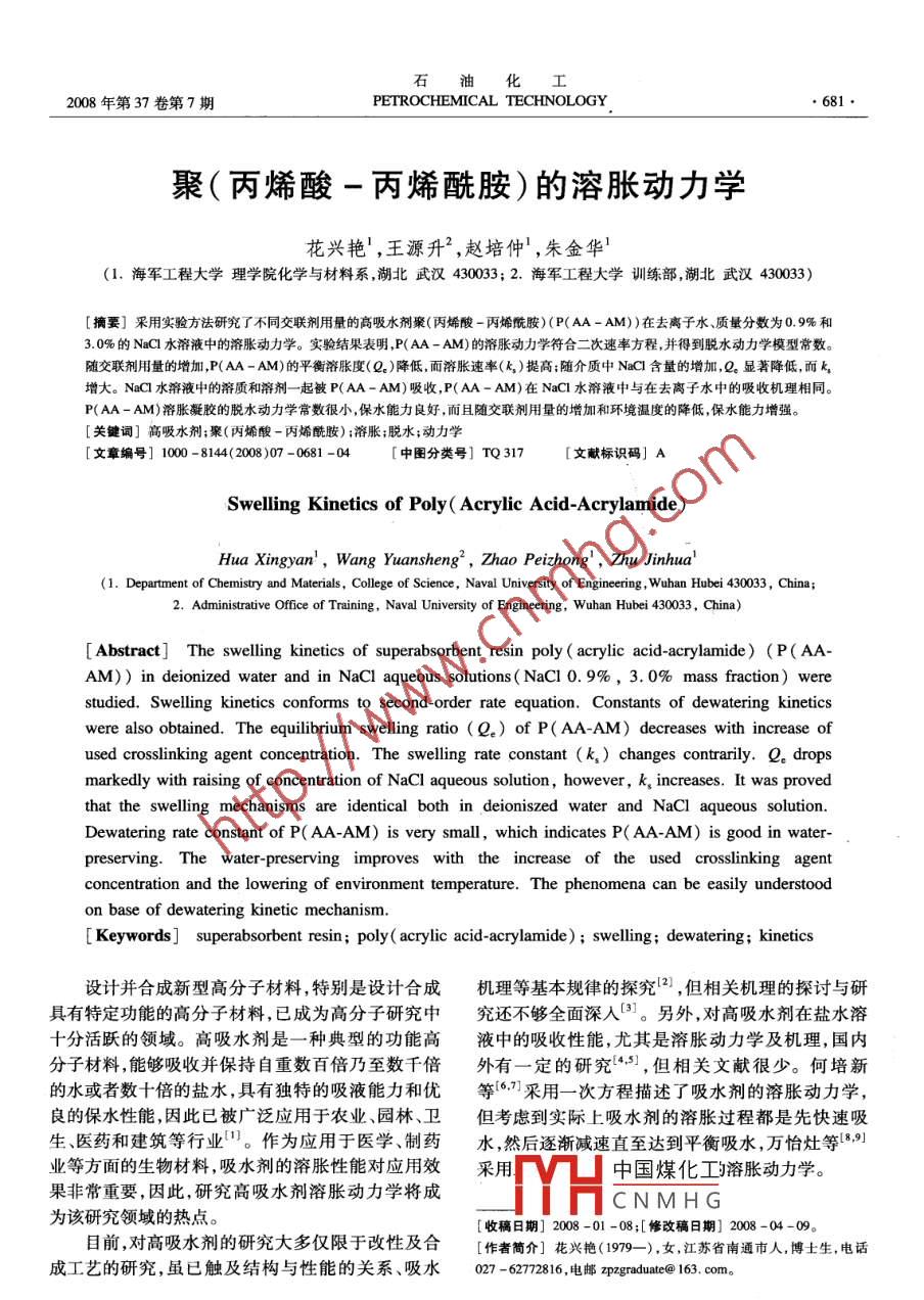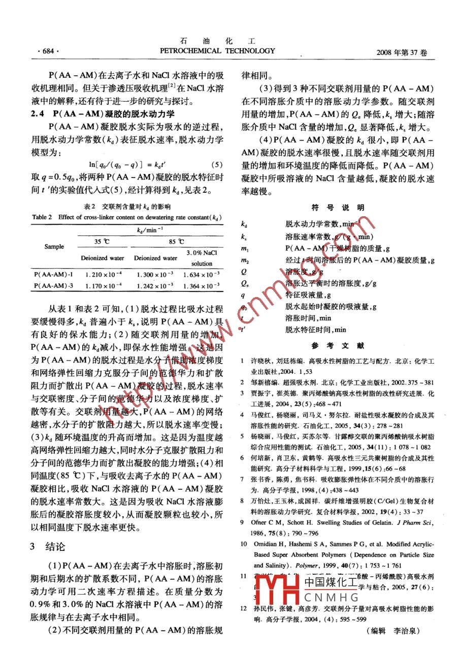 石油化工2008年第37卷第7期PETROCHEMICAL TECHNOLOGY聚(丙烯酸一丙烯酰胺)的溶脹動(dòng)力學(xué)花興艷!,王源升2,趙培仲,朱金華(1.海軍工程大學(xué)理學(xué)院化學(xué)與材料系,湖北武漢430033;2.海軍工程大學(xué)訓(xùn)練部,湖北武漢430033)[摘要]采用實(shí)驗(yàn)方法研究了不同交聯(lián)劑用量的高吸水劑聚(丙烯酸-丙烯酰胺)(P(AA-AM))在去離子水、質(zhì)量分?jǐn)?shù)為0.9%和30%的NaC1水溶液中的溶脹動(dòng)力學(xué)。實(shí)驗(yàn)結(jié)果表明,P(AA-AM)的溶脹動(dòng)力學(xué)符合二次速率方程,并得到脫水動(dòng)力學(xué)模型常數(shù)。隨交聯(lián)劑用量的增加,P(AA-AM)的平衡溶脹度(Q)降低而溶脹速率(k)提高;隨介質(zhì)中NaC1含量的增加,Q。顯著降低,而k增大。NaC1水溶液中的溶質(zhì)和溶劑一起被P(AA-AM)吸收,P(AA-AM)在NaCl水溶液中與在去離子水中的吸收機(jī)理相同。P(AA-AM)溶脹凝膠的脫水動(dòng)力學(xué)常數(shù)很小,保水能力良好,而且隨交聯(lián)劑用量的增加和環(huán)境溫度的降低,保水能力增強(qiáng)關(guān)鍵詞]高吸水劑;聚(丙烯酸-丙烯酰胺);溶脹;脫水;動(dòng)力學(xué)文章編號(hào)]1000-8144(2008)07-0681-04中圖分類號(hào)]TQ317[文獻(xiàn)標(biāo)識(shí)碼]ASwelling Kinetics of Poly( Acrylic Acid-Acrylamide)Hua Xingyan', Wang Yuansheng, Zhao Peizhong, Zhu Jinhua(1. Department of Chemistry and Materials, College of Science, Naval University of Engineering, Wuhan Hubei 430033, China2. Administrative Office of Training, Naval University of Engineering, Wuhan Hubei 430033, China)Abstract The swelling kinetics of superabsorbent resin poly( acrylic acid-acrylamide )(P(AA-AM)) in deionized water and in Nacl aqueous solutions( NaCl 0. 9%mass fraction)werestudied. Swelling kinetics conforms to second-order rate equation. Constants of dewatering kineticswere also obtained. The equilibrium swelling ratio(e) of P(AA-AM)decreases with increase ofused crosslinking agent concentration. The swelling rate constant(ks) changes contrarily. Q dropsmarkedly with raising of concentration of NaCl aqueous solution, however, ks increases. It was provedthat the swelling mechanisms are identical both in deionized water and NaCl aqueous solutionDewatering rate constant of P(AA-AM) is very small, which indicates P(AA-AM) is good in water-preserving. The water-preserving improves with the increase of the used crosslinking agentconcentration and the lowering of environment temperature. The phenomena can be easily understoodon base of dewatering kinetic mechanismI Keywords superabsorbent resin; poly acrylic acid-acrylamide ) swelling dewatering; kinetics設(shè)計(jì)并合成新型高分子材料,特別是設(shè)計(jì)合成機(jī)理等基本規(guī)律的探究12),但相關(guān)機(jī)理的探討與研具有特定功能的高分子材料,已成為高分子研究中究還不夠全面深入3。另外,對(duì)高吸水劑在鹽水溶十分活躍的領(lǐng)域。高吸水劑是一種典型的功能高液中的吸收性能,尤其是溶脹動(dòng)力學(xué)及機(jī)理,國(guó)內(nèi)分子材料能夠吸收并保持自重?cái)?shù)百倍乃至數(shù)千倍外有一定的研究3,但相關(guān)文獻(xiàn)很少。何培新的水或者數(shù)十倍的鹽水,具有獨(dú)特的吸液能力和優(yōu)等6,采用一次方程描述了吸水劑的溶脹動(dòng)力學(xué),良的保水性能,因此已被廣泛應(yīng)用于農(nóng)業(yè)、園林、衛(wèi)但考慮到實(shí)際上吸水劑的溶脹過(guò)程都是先快速吸生醫(yī)藥和建筑等行業(yè)。作為應(yīng)用于醫(yī)學(xué)、制藥水,然后逐漸減速直至達(dá)到平衡吸水,萬(wàn)怡灶等9業(yè)等方面的生物材料吸水劑的溶脹性能對(duì)應(yīng)用效采用中國(guó)煤化工溶脹動(dòng)力學(xué)果非常重要,因此,研究高吸水劑溶脹動(dòng)力學(xué)將成為該研究領(lǐng)域的熱點(diǎn)。CNMHG[收稿日期]200801-08;[修改稿日期】200804-09。目前,對(duì)高吸水劑的研究大多僅限于改性及合[作者簡(jiǎn)介]花興艷(197-),女,江蘇省南通市人,博士生,電話成工藝的研究,雖已觸及結(jié)構(gòu)與性能的關(guān)系、吸水027-62772816,電郵 graduate@e163,com。石油化工682PETROCHEMICAL TECHNOLOGY2008年第37卷高吸水劑在實(shí)際應(yīng)用中大多是鹽水環(huán)境,研究不存在線性關(guān)系;不同交聯(lián)劑含量的3種吸水劑在鹽水介質(zhì)中的溶脹機(jī)理不僅可以促進(jìn)凝P(AA-AM)的溶脹曲線的變化規(guī)律相同,且溶脹度膠學(xué)理論的發(fā)展,而且具有重要的實(shí)際意義。另隨交聯(lián)劑含量的增加而顯著減小。在P(A-AM)外,國(guó)內(nèi)外對(duì)吸水劑凝膠的脫水機(jī)理研究較少,而溶脹的初期和后期,水在P(AA-AM)中的擴(kuò)散系數(shù)這對(duì)高吸水劑的使用效果尤為重要,因?yàn)樽鳛樾滦筒皇浅?shù),這說(shuō)明水在高度溶脹的P(AA-AM)中進(jìn)水緩釋材料的載體基體,要控制釋水速率需要研究一步擴(kuò)散時(shí)的擴(kuò)散系數(shù)與溶脹初期的擴(kuò)散系數(shù)不同。釋放動(dòng)力學(xué)本工作在去離子水和鹽溶液中對(duì)聚(丙烯酸丙烯酰胺)(P(AA-AM)的溶脹動(dòng)力學(xué)和脫水動(dòng)力學(xué)進(jìn)行了研究,采用二次速率方程對(duì)實(shí)驗(yàn)數(shù)據(jù)進(jìn)行處理,得到二次速率方程參數(shù)。1實(shí)驗(yàn)部分1.1試劑丙烯酸(AA):分析純,天津市泰興試劑廠;丙烯酰胺(AM)、NaOH、過(guò)硫酸鉀:分析純,廣州汕頭市西圖1在去離子水中P(AA-AM)的Q~2曲線隴化工廠;N,N-亞甲基雙丙烯酰胺:分析純,天津市Fig. 1 Q-Icur