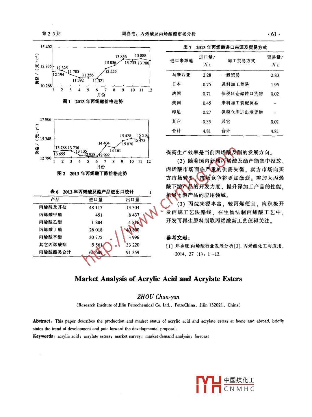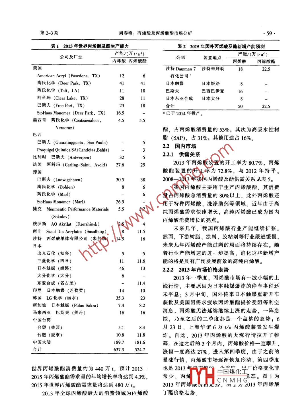 化學(xué)工業(yè)第33卷第2-3期58·CHEMICAL INDUSTRY2015年2-3月丙烯酸及丙烯酸酯市場(chǎng)分析周春艷(中國石油吉林石化公司研究院,吉林市132021)摘要:介紹了國內(nèi)外丙烯酸及丙烯酸酯的生產(chǎn)和市場(chǎng)現(xiàn)狀,預(yù)測(cè)了丙烯酸及丙烯酸酯的生產(chǎn)及市場(chǎng)發(fā)展趨勢(shì),并提出發(fā)展建議。關(guān)鍵詞:丙烯酸;丙烯酸酯;市場(chǎng)調(diào)查;市場(chǎng)需求分析;預(yù)測(cè)文章編號(hào):1673-9647(2015)2-3-0058-04中圖分類號(hào):TQ225.13+1文獻(xiàn)標(biāo)識(shí)碼:A丙烯酸是重要不飽和有機(jī)酸,丙烯酸酯是附12國內(nèi)加值很高的石油化工深加工產(chǎn)品。丙烯酸主要用從201年起,我國丙烯酸及酯的產(chǎn)能發(fā)展迎于生產(chǎn)各種酯類,部分用于生產(chǎn)高吸水性樹脂,來一個(gè)高峰期,有多套丙烯酸裝置投產(chǎn),包括江其余作為共聚單體直接生產(chǎn)各種聚合物。丙烯酸蘇裕廊化工有限公司在2011-2012年間投產(chǎn)的兩及其酯近幾年發(fā)展迅速。套產(chǎn)能各為16萬t/a的丙烯酸裝置、中海油公司1生產(chǎn)現(xiàn)狀及預(yù)測(cè)2012年投產(chǎn)的一套14萬ta丙烯酸裝置、江蘇三11全球木集團(tuán)2012年投產(chǎn)的一套產(chǎn)能6萬va的丙烯酸至2013年底,全球酯化級(jí)丙烯酸產(chǎn)能為6373裝置和一套產(chǎn)能為8萬Ua的丙烯酸裝置等。萬ta,比2012年增加305萬U/a;丙烯酸酯的2013年山東開泰石化公司新投產(chǎn)一套8萬t/a丙產(chǎn)能為524.7萬ta,比2012年增加24萬ta。烯酸裝置,截至2013年末,我國丙烯酸產(chǎn)能已經(jīng)新增產(chǎn)能主要來自沙特、印尼和中國。其中,沙達(dá)到1897萬Ua,產(chǎn)量為1527萬t;丙烯酸酯產(chǎn)特阿拉伯撒哈拉石化( Sahara Petrochemicals)公能達(dá)到181.6萬t/a,產(chǎn)量為1308萬t。表3為2013年我國丙烯酸及酯的生產(chǎn)企業(yè)的能力及產(chǎn)司與沙特國家工業(yè)公司( Tasnee)對(duì)等持股的合量資企業(yè)沙特丙烯酸單體公司在沙特朱拜勒投產(chǎn)一國內(nèi)近年丙烯酸及酯產(chǎn)能仍處于快速發(fā)展軌套丙烯酸和丙烯酸丁酯聯(lián)合裝置,丙烯酸產(chǎn)能為道,未來兩年我國有多套丙烯酸裝置將陸續(xù)建成,145萬ta,丙烯酸丁酯產(chǎn)能為16萬ta;日本觸僅2014年就將有105萬t/a新增產(chǎn)能,2015年還媒在印度尼西亞芝勒貢投產(chǎn)一套8萬ta丙烯酸將有32萬ta產(chǎn)能投放。預(yù)計(jì)到2015年,我國裝置:山東開泰石化公司投運(yùn)了一套8萬ta丙丙烯酸產(chǎn)能可達(dá)到340萬t/a以上,207年進(jìn)烯酸裝置和一套8萬ta丙烯酸丁酯裝置步達(dá)到412萬ta以上。表4為20142015年我表1為2013年世界丙烯酸和丙烯酸酯的產(chǎn)能國丙烯酸及酯新增產(chǎn)能。情況。中國、美國和歐洲是全球主要丙烯酸生產(chǎn)2市場(chǎng)分析及預(yù)測(cè)地區(qū),我國是近年丙烯酸生產(chǎn)發(fā)展最快的國家。21國際市場(chǎng)2012年,我國的丙烯酸裝置產(chǎn)能首次同時(shí)超過美2013年世界丙烯酸消費(fèi)量約為500萬t,預(yù)國和歐洲,成為世界丙烯酸產(chǎn)能最大的國家。計(jì)2013-2015年丙烯酸需求量將以47%的速度隨著丙烯酸及酯下游領(lǐng)域的不斷拓展,需求增長(zhǎng),2015年世界丙烯酸需求量將達(dá)到560萬t,不斷增長(zhǎng),國內(nèi)外丙烯酸公司紛紛瞄準(zhǔn)潛在市場(chǎng)而高純丙烯酸的雪市w動(dòng)!E4%。2013年進(jìn)行裝置新建或擴(kuò)產(chǎn)。2014-2015年有多套丙烯中國煤化工°收稿日期:2014-1CNMHG酸裝置計(jì)劃投產(chǎn),新增產(chǎn)能主要集中在中東和亞作者簡(jiǎn)介:周春艷(1971-),女,四川省人,高級(jí)工程師,主要洲(表2)。從事丙烯酸及酯和甲基丙烯酸甲酯的信息情報(bào)工作。第2-3期周春艷:丙烯酸及丙烯酸酯市場(chǎng)分析表12013年世界丙烯酸及酯生產(chǎn)能力表22015年國外丙烯酸及酯新增產(chǎn)能預(yù)測(cè)公司及廠址產(chǎn)能/(萬ta1產(chǎn)能/(萬ta1)丙烯酸丙烯酸酯公司裝置地點(diǎn)丙烯酸丙烯酸酯美國沙特 Damman7沙特朱拜勒American Acryl(Pasedena, TX)6石化公司陶氏化學(xué)( Deer Park,TX)日本觸媒日本姬路陶氏化學(xué)(Taf,LA)巴斯夫巴西巴伊亞16阿科瑪( Clear Lake,TX)11日本東亞合成日本大分巴斯夫( Free port,TX)StoHaas Monomer( Deer Park, TX) 16.5已于2014年投產(chǎn)。墨西哥陶氏化學(xué)( Coatzacoalcos,酯,占丙烯酸消費(fèi)量的53%;其次為高吸水性樹巴西巴斯夫( Guaratinggueta, Sao paulo脂(SAP),占31%;其他用途占16%。22國內(nèi)市場(chǎng)Proquigel Quimica SA(Candeias, Bahia)比利時(shí)巴斯夫( Antwerpen)221供需關(guān)系法國阿科瑪( Carling- Saint, Avold)27.62013年丙烯酸裝置的開工率為807%,丙烯德國酸酯裝置的開工率為728%,與2012年持平巴斯夫( Ludwigshafen)30.52008—2013年我國丙烯酸及酯供需關(guān)系見表5。陶氏化學(xué)( Bohlen)我國丙烯酸主要用于生產(chǎn)丙烯酸酯,其消費(fèi)陶氏化學(xué)(Marl)量占丙烯酸總消費(fèi)量的80%以上,此外丙烯酸還StoHaas Monomer(Marl)26.5用于特種丙烯酸、洗滌助劑等領(lǐng)域。近年由于高捷克 Monmentic Performance Materials5.55.7純丙烯酸需求快速增長(zhǎng),高純丙烯酸已成為國內(nèi)俄羅斯 AO Akrilat( Dzerzhinsk)丙烯酸消費(fèi)增長(zhǎng)的亮點(diǎn)。南非 Sasol Dia Acrylates( Sasolburg)8115未來幾年,我國丙烯酸行業(yè)產(chǎn)能繼續(xù)擴(kuò)張。沙特丙烯酸單體有限公司(朱拜勒)14.516然而,下游樹脂
