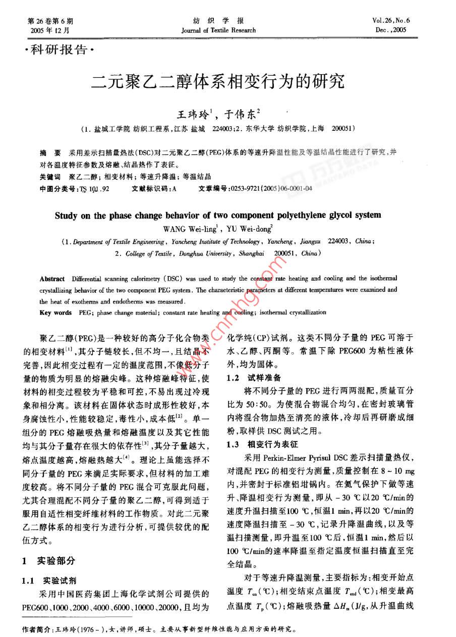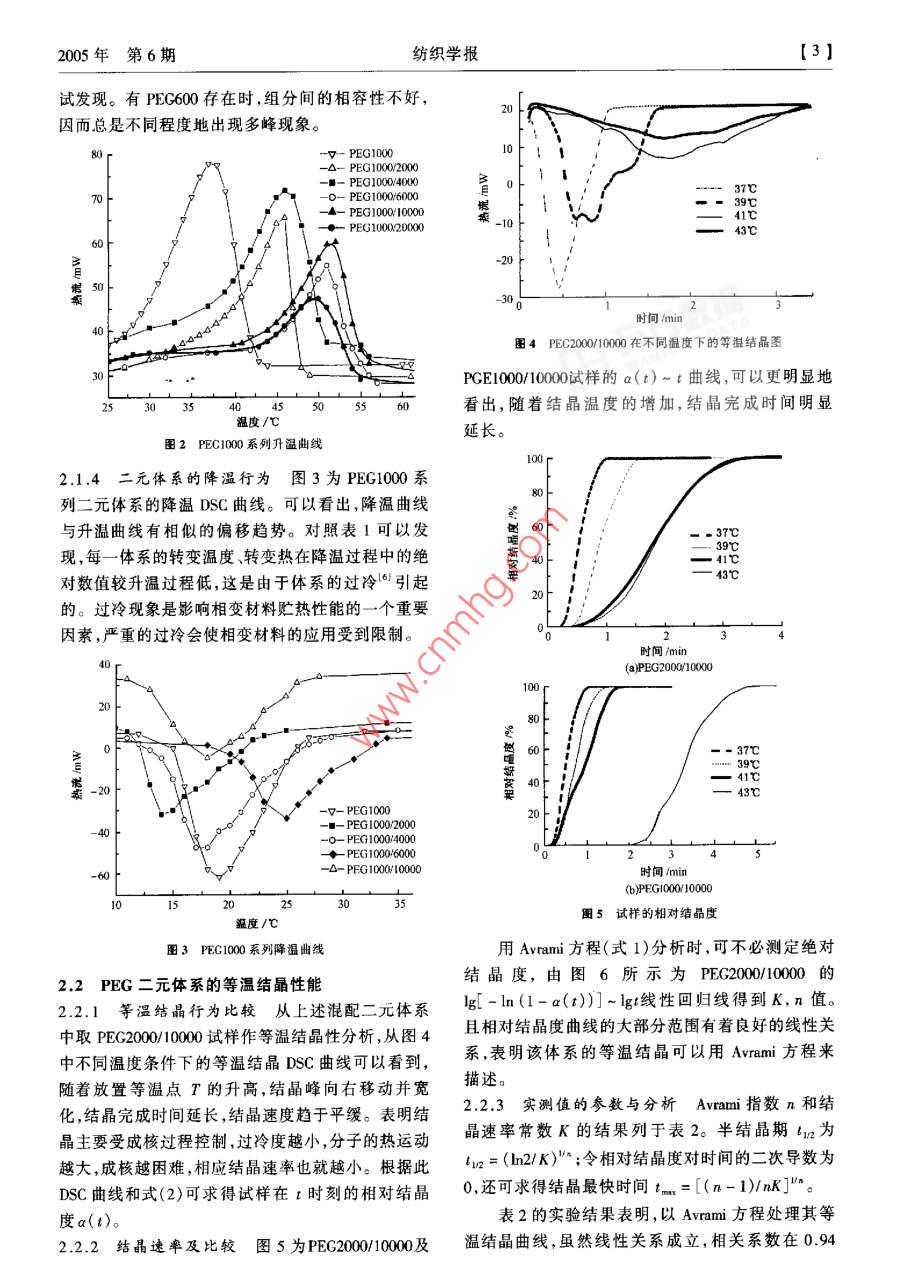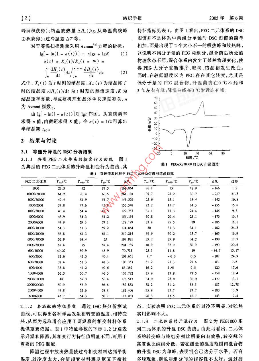 第26卷第6期紡織學(xué)報(bào)Vol 26, No 6005年12月Joumal of Textile ResearchDec,2005科研報(bào)告·二元聚乙二醇體系相變行為的研究王瑋玲1,于偉東2(1.鹽城工學(xué)院紡織工程系,江蘇鹽城224003;2.東華大學(xué)紡織學(xué)院,上海200051)摘要采用差示掃描量熱法(DSC)對(duì)二元聚乙二醇(PEG)體系的等速升降溫性能及等溫結(jié)晶性能進(jìn)行了研究,并對(duì)各溫度特征參數(shù)及熔融、結(jié)晶熱作了表征。關(guān)鍵詞聚乙二醇;相變材料;等速升降溫;等溫結(jié)晶中圖分類(lèi)號(hào):T1Q1.9文獻(xiàn)標(biāo)識(shí)碼:A文章編號(hào):02539721(2005)06-0001-04Study on the phase change behavior of two component polyethylene glycol systemWANG Wei-ling, YU Wei-don(1. Department of Textile Engineering, Yancheng Institute of Technology, Yancheng, Jiangsu 224003, Chin2. College of Textile, Donghua Uniersity, Shanghai 200051, China)Abstract Differential scanning calorimetry(DSC)was used to study the constant rate heating and cooling and the isothermalcrystallizing behavior of the two component PEG system. The characteristic parameters at different temperatures were examined andthe heat of exotherms and endotherms was measureKey words PEG: phase change material; constant rate heating and cooling; isothermal crystallization聚乙二醇(PEC)是一種較好的高分子化合物類(lèi)化學(xué)純(CP)試劑。這類(lèi)不同分子量的PEG可溶于的相變材料,其分子鏈較長(zhǎng),但不均一,且結(jié)晶不水、乙醇、丙酮等。常溫下除PEG600為粘性液體完善,因此相變過(guò)程有一定的溫度范圍,不像低分子外,均為固體。量的物質(zhì)為明顯的熔融尖峰。這種熔融峰特征,使12試樣準(zhǔn)備材料的相變過(guò)程較為平穩(wěn)和可控,不易出現(xiàn)過(guò)冷現(xiàn)將不同分子量的PEG進(jìn)行兩兩混配,質(zhì)量百分象和相分離。該材料在固體狀態(tài)時(shí)成形性較好,本比為50:50。為使混合物混合均勻,在密封玻璃管身腐蝕性小,性能較穩(wěn)定,毒性小,成本低2。單一內(nèi)將混合物加熱至清亮的液體,冷卻后再研磨成細(xì)組分的PEG熔融吸熱量和熔融溫度以及其它性能粉,取樣供DSC測(cè)試之用。均與其分子量存在很大的依存性,其分子量越大,1.3櫚變行為表征熔點(diǎn)溫度越高,熔融熱越大。理論上雖能選擇不采用 Perkin-Elmer Pyrisul DSC差示掃描量熱儀,同分子量的PEG來(lái)滿(mǎn)足實(shí)際要求,但材料的加工難對(duì)混配FEG的相變行為測(cè)量,質(zhì)量控制在8-10mg度較高。將不同分子量的PEG混合可克服此問(wèn)題內(nèi),并密封于標(biāo)準(zhǔn)鋁坩鍋內(nèi)。在氦氣保護(hù)下做等速尤其合理混配不同分子量的聚乙二醇,可得到適于升、降溫相變行為測(cè)量,即從-30℃以20℃/mn的服用自適性相變纖維材料的工作物質(zhì)。對(duì)此二元聚速度升溫掃描至m00℃,恒溫1mn,再以20℃/mn的乙二醇體系的相變行為進(jìn)行分析,可提供較優(yōu)的配速度降溫掃描至-30℃,記錄升降溫曲線(xiàn),以及等伍方式。溫掃描測(cè)量,即升溫至100℃后,恒溫1min,然后以100℃/min的速率降溫至指定溫度恒溫掃描直至完1實(shí)驗(yàn)部分全結(jié)晶。1.1實(shí)驗(yàn)試劑對(duì)于等速升降溫測(cè)量,主要指標(biāo)為:相變開(kāi)始點(diǎn)采用中國(guó)醫(yī)藥集團(tuán)上?;瘜W(xué)試劑公司提供的溫度T(℃);相變結(jié)束點(diǎn)溫度T(℃);相變最高PEc600、1002000400060010000,.均為點(diǎn)溫度T,(℃);熔融吸熱量△Hn(Jg,從升溫曲線(xiàn)作者簡(jiǎn)介:王瑋玲(1976-),女,講師,碩士。主要從事新型纖維性能與應(yīng)用方面的研究【2紡織學(xué)報(bào)2005年第6期峰面積獲得);結(jié)晶放熱量△H(Jg,從降溫曲線(xiàn)峰特征指標(biāo)見(jiàn)表1。由圖1看出,PEG二元體系的DSC面積獲得);過(guò)冷溫差ΔT等。圖譜并不是體系中兩組分單獨(dú)時(shí)DSC圖譜的簡(jiǎn)單對(duì)于等溫掃描測(cè)量采用 Avrami3方程的指標(biāo):相加,而是出現(xiàn)了2個(gè)大小不一的吸熱峰和放熱峰lg-ln(1-a(t)]=nlg4+lgk(1)這說(shuō)明不同分子量的PG兩組分混合前后所處的a(t)=X(t)X(t=∞)=物理狀態(tài)不同,混合體系內(nèi)發(fā)生了某種物理變化,使dH (t)dH (t)得PEG大分子重新排序、取向,結(jié)晶相發(fā)生改變。dt同時(shí),在較低溫度區(qū)內(nèi)PEG存在其它轉(zhuǎn)變,尤其是式中,X(t)為t時(shí)刻的結(jié)晶度;X(t)為結(jié)晶終了低分子量的PEG混合物,升溫曲線(xiàn)在0℃不到和時(shí)的結(jié)晶度;dHf(t)/dt為t時(shí)刻的熱流速度;K為3℃左右有峰;降溫曲線(xiàn)在0℃附近亦有峰。結(jié)晶速率常數(shù),與成核機(jī)理和晶體生長(zhǎng)速度有關(guān);n為 Avram指數(shù)。由lg[-ln(1-a(t))]對(duì)lgt作圖。從直線(xiàn)斜率求得n值,由截距求得K值。令a(t)=1/2可算出半結(jié)晶期t2結(jié)果與討論1021等速升降溫的DSC分析結(jié)果2.1.1典型PEG二元體系的相變行為曲線(xiàn)圖1為典型的PEG二元體系的升降溫相變行為曲線(xiàn),其圖1PEC6002000的DSC掃描圖譜表1等速變溫過(guò)程中PEG二元體系熔融和結(jié)晶性能PG三元體系r/℃r-/℃r./Arm/r/℃rB,過(guò)冷37.518.61.261,10127.214125.637.847.6000/20000129,78751,2154,15430.849,974.86439.93"705109135.7199039,296000/2000061475204.735932.93620.5600/1000050.915,17600/20003242.3101,65138,425.633.847,283.38991.636.35025,93.82000/000059.3175.51725,912.782000400062,658.827115.0332.1.2各混配的特征參數(shù)通過(guò)DSC熱分析測(cè)試態(tài)。實(shí)驗(yàn)表明PE