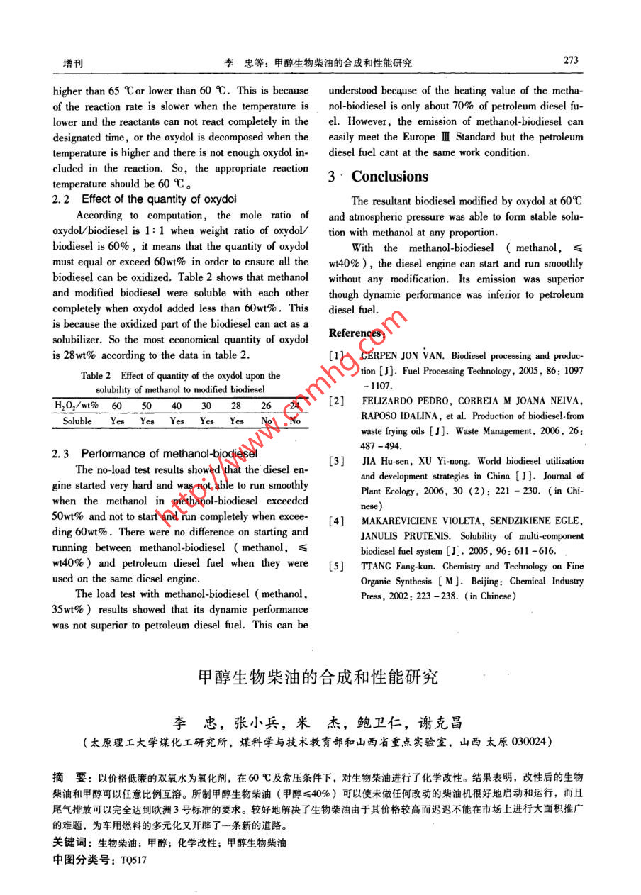 第46卷增刊中山大學(xué)學(xué)報(bào)( 自然科學(xué)版)Vol 46 Sup.2007年6月ACTA SCIENTIARUM NATURALIUM UNIVERSITATIS SUNY ATSENIJun. 2007Studies on Preparation of Methanol-biodiesel& Its PerformanceL Zhong , ZHANG Xiao-bing, MI Jie, BAO Wei-ren, XIE Ke-chang( Key Laboratory of Coal Science & Technology , Education Ministry & Shanxi Province;Coal Chemical Engineering Institute , Taiyuan University of Technology,Taiyuan 030024, China) 'Results showed that the modified biodiesel and methanol can be soluble with each other at any proportion. w ith the methanol-biodiesel( methanol,≤w140% ), the diesel engine can start and run smoothly without any modifcation, and its emission can flly meet the Eu-rope皿Standard. The obstacle on price for biodiesel competing against petroleum diesel fuel on the market was overcome and anothernew way was created for the transportation fuel diversification.Key words; Biodiesel; methanol; chemical mdification; methanl-idieselCLC number: TQ517Document code: A Article ID: 0529-6579 (2007) S1-0272-02Biodiesel, a potential substitute for petroleum to demix after the reaction finished. After washing anddiesel fuel'1 , is more expensive than petroleum dieseldistiltion, the resultant oil phase was called the modi-fuel. To reduce the cost of biodiesel, many meth- fied biodiesel.odsl2-31 , such as waste oil or fat as festocks, prefer 1.2 Solbility testential policy in USA and EU issued to encourage theTwenty gram of methanol was added into 20 gramsconsumption,and through gene engineering to seekof modified biodiesel. If the solution will keep solubleplant with more oil content, were tried in the world sowith each other completely after 24 hours at room tem-faperature, the modified biodiesel and methanol will beThere is at least one unsaturated bond in biodieselthought soluble with each other completely at any pro-molecule. We thought that the biodiesel could be modi-fied chemically through oxidation of the unsaturatedportion, or they will be thought not to dissolve in eachbond to add polar groups on its molecular chain. Ac-other fully.1.3 Performance of methanol-biodieselcording to the principle that the more like in molecularNo-load diesel engine test was performed withpolar the more dissolves in each other, the thermody-namically stable solution of modified biodiesel andR180-1 diesel engine (rated power, 5. 15 kW; ratedmethanol would be got and will be superior to the un-speed, 2 600 r/ min). Load diesel engine test was con-stable solution of unmodified biodiesel and methanolducted with ZS195 diesel engine ( rated power, 8. 8with the help of surfactant4].kW; rated speed, 2 000 r/min). Emission was ana-In this paper, the chemical modificationof lyzed with KM9106 Flue Gas Analyser.biodiesel with oxydol as oxidant and its soluble property2 Results and discussionwith methanol were firstly studied. The effect of metha-nol-biodiesel prepared upon diesel engine was also in- 2. 1 Effect of the reaction temperaturevestigated.Tab.1 Effect of the reaction temperature upon1 Experimentsthe solubility of methanol with modifed biodieselTemperature/ 50560 6:701.1 Chemical modification of biodieselSolubleNioNoAdding Biodiesel and catalyst into a three -mouthflask and heating them to designated temperature in wa-It can be seen from the table 1 that the resultantter bath under sirring frstly. Then, dropping oxydol modifed biodiesel and methanol were not soluble with(H2O2, 27. 5wt% ) into the flask, stling the producteach other completely when the reaction temperature is收稿日期: 2007-01-10作者簡介:李忠(1964 年生),男,教授; E-mail: Lizhong@ tyut. edu. cn增刊李忠等: 甲醇生物柴油的合成和性能研究273higher than 65 Cor lower than 60 C. This is becauseunderstood becquse of the heating value of the metha-of the reaction rate is slower when the temperature is. nol-biodiesel is only about 70% of petroleum diesel fu-lower and the reactants can not react completely in theel. However, the emission of methanol-biodiesel candesignated time, or the oxydol is decomposed when the easily meet the Europe I Standard but the petroleumtemperature is higher and there is not enough oxydol in-diesel fuel cant at the same work condition.cluded in the reaction. So, the appropriate reaction3,Conclusionstemperature should be 60 C。2.2 Effect of the quantity of oxydolThe resultant biodiesel modified by oxydol at 60CAccording to computation, the mole ratio of and atmospheric pressure was able to form stable solu-oxydol/biodiesel is 1: 1 when weight ratio of oxydolVtion with methanol at any proportion.biodiesel is 60% , it means that the quantity of oxydolWith the methanol-biodiesel ( methanol, ≤must equal or exceed 60wt% in order to ensure all thew40%), the diesel engine can start and run smoothlybiodiesel can be oxidized. Table 2 shows that methanolwithout any modification. Its emission was superiorand modified biodiesel were soluble with each other though dynamic performance was inferior to petroleumcompletely when oxydol added less than 60wt%. Thisdiesel fuel.is because the oxidized part of the biodiesel can act as asolubilizer. So the most economical quantity of oxydolReferences :is 28wt% according to the data in table 2.[1] CERPEN JON VAN. Biodiesel processing and produc-Table 2 Effect of quantity of the oxydol upon thetion [J]. Fuel Processing Technology, 2005, 86: 1097- 1107.solubility of methanol to modified biodieselH20/wt% 6_5(403028264 [2] FELIZARDO PEDRO, CORREIA M J0ANA NEIVA,RAPOSO IDALINA, et al. Production of biodiesel.fromSolubleYes Yes Yes_ Yes YesVo Nowaste frying oils [J]. Waste Management, 2006, 26:487 -494.2.3 Performance of methanol-biodiesel[3] JIA Hu-sen, XU Yi-nong. World biodiesel uilizationThe no-load test results showed that the diesel en-and development strategies in China [ J ]. Jourmal ofgine started very hard and was not able to run smoothlyPlant Ecology, 2006, 30 (2): 221 - 230. (in Chi-when the methanol in methanol-biodiesel e