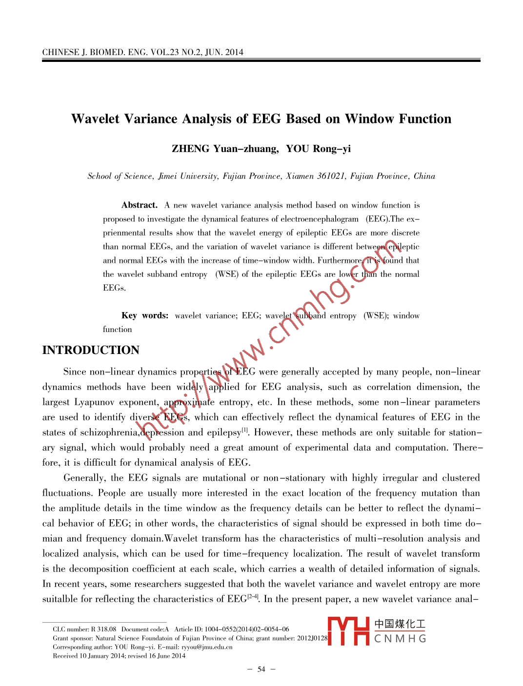 CHINESE J. BIOMED. ENG. VOL.23 NO.2, JUN.2014Wavelet V ariance Analysis of EEG Based on Window FunctionZHENG Yuan-zhuang, YOU Rong-yi .School of Science, Jimei University, Fuyjian Province, X iamen 361021, Fuyjian Province, ChinaAbstract. A new wavelet variance analysis method based on window function is .proposed to investigate the dynamical features of electroencephalogram (EEG).The ex-prienmental results show that the wavelet energy of epileptic EEGs are more discretethan normal EEGs, and the variation of wavelet variance is different between epilepticand normal EEGs with the increase of time-window width. Furthermore, it is found thatthe wavelet subband entropy (WSE) of the epileptic EEGs are lower than the normalEEGs.Key words: wavelet variance; EEG; wavelet subband entropy (WSE); windowfunctionINTRODUCTIONSince non-linear dynamics properties of EEG were generally accepted by many people, non-lineardynamics methods have been widely applied for EEG analysis, such as correlation dimension, thlargest Lyapunov exponent, approximate entropy, etc. In these methods, some non -linear parametersare used to identify diverse EEGs, which can effectively reflect the dynamical features of EEG in thestates of schizophrenia,depression and epilepsy!". However, these methods are only suitable for station-ary signal, which would probably need a great amount of experimental data and computation. There-fore, it is difficult for dynamical analysis of EEG.Generally, the EEG signals are mutational or non -stationary with highly irregular and clusteredfluctuations. People are usually more interested in the exact location of the frequency mutation thanthe amplitude details in the time window as the frequency details can be better to reflect the dynami-cal behavior of EEG; in other words, the characteristics of signal should be expressed in both time do-mian and frequency domain. W avelet transform has the characteristics of multi -resolution analysis andlocalized analysis, which can be used for time -frequency localization. The result of wavelet transformis the decomposition coefficient at each scale, which carries a wealth of detailed information of signals.In recent years, some researchers suggested that both the wavelet variance and wavelet entropy are moresuitalble for reflecting the characteristics of EEGR-4. In the present paper, a new wavelet variance anal-中國(guó)煤化工CLC number: R 318.08 Document code:A Article ID: 1004-0552(2014)02- -0054-06Grant sponsor: Natural Science Foundatoin of Fujian Province of China; grant number: 2012J0128.MYHCNMHGCorresponding author: YOU Rong -yi. E- -mail: ryyou@jmu.edu.cnReceived 10 January 2014; revised 16 June 2014-54-Chinese Journal of Biomedical Engineering (English Edition) V olume 23 Number 2, June 2014ysis method based on window function is proposed for studying the dynamical features of EEGs in bothepileptic and normal states.WA VELET VARIANCE AND WAVELET SUBBAND ENTROPY OF EEGThe wavelet varianceIn probability theory and statistics, variance measures how far a set of numbers is spread out.Thewavelet variance is a significantly characteristic index in multi -resolution analysis, which decomposesthe variance of a time series into several components associated with different scales. The waveletvariance can measure the discrete level of signals at different scales.The discrete wavelet transform (DWT) of a signal f(t) ∈L?(R) is defined as Equation (1):c{(k)= | f(),()dt(1)where ψ,()=2° ψ(2j-h) is the wavelet family. According to Parseval's theorem, the wavelet transformon the basis of orthogonal wavelet has the property of energy conservation. Then, the wavelet energy atresolution level j is approximated by the wavelet coefficients as Equation (2):E;=E |()2.The wavelet variance at resolution level j is defined as Equation (3)5-6:V}= vr{c{(k)}(3)so the wavelet variance at resolution level j can be estimated by Equation (4):VF=σ=H 2 lc()(4)The wavelet variance is generally regarded as an effective substitution for the sample varaiance ofstochastic process. From Equation (2) and (4), we can see that the wavelet variance is the average en-ergy at one wavelet scale. Therefore, the wavelet variance measures how far the number betweenwavelet energy and their expected values is spread out.The wavelet subband entropyWith regard to a given signal f(),wavelet coefficients c() at each scale j are squared and normal-ized according to Equation (5)7:C;(n)=-c(m)}2(5)Zc(m}where c; is the cofficient at scale j, is the number of coefficients at scale j. Then the wavelet subbandentropy (WSE) is computed according to Shannon entropy theory as Equation (6): .中國(guó)煤化工WSE:log(N)MHCNMHG(6)-55一CHINESE J. BIOMED. ENG. VOL.23 NO.2, JUN.2014Equation (5) enhances the contribution of high-amplitude signal values in relation to lower-amplitudesignal values, so that the WSE is more sensitive to the characteristics of brain activity.ANALYSIS OF EEG BASED ON WINDOW FUNCTIONIn light of the definition of wavelet variance and WSE, the calculation of wavelet variance and theWSE are based on the energy distribution in wavelet sub-bands, so that the estimation of wavelet en-ergy distribution plays an important role in the calculation. In essence, the calculation of the waveletenergy distribution is similar to the W elch approach, which is usually used to calculate spectrum inthe frequency domain by FFTB8-91. For Welch spectrum estimation, a signal is usually segmented andwindowed with some functions such as Hamming, Blackman, etc. Then all individual segment's spectraare averaged to obtain a more reliable and smooth spectrum estimation. However, without a windowsmoothing strategy, so this estimation will be easily affected by noise, artifacts, eventually leading to anunstable calculation of wavelet variance spectrum and WSE. Furthermore, EEG data is almost alwayscontaminated by some artifacts which is not only generated by the body (such as eye-induced artifacts,ECG artifacts