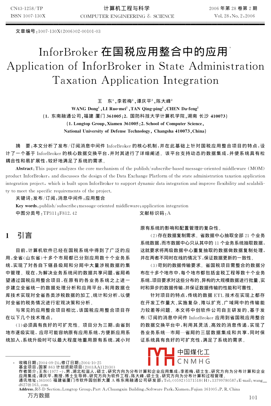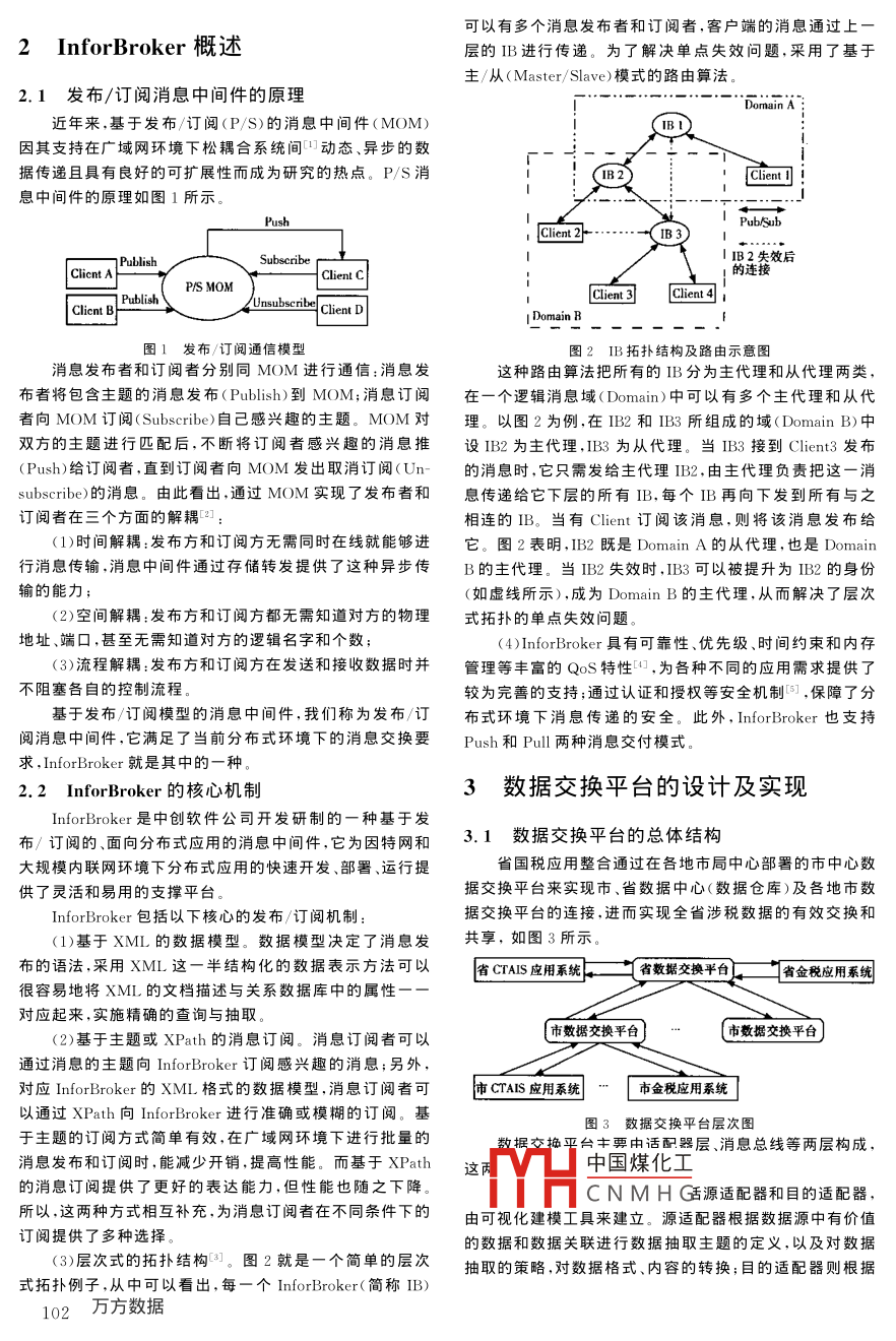 CN43-1258/TP計算機工程與科學(xué)2006年第28卷第2期ISsN1007-130XComPuter enGInEERING ScieNCEVol.28,No.2,2006文章編號:1007-130X(2006)02-0010103Infor broker在國稅應(yīng)用整合中的應(yīng)用Application of InforBroker in State AdministrationTaxation Application Integration王東1,李若梅2,譚慶平2,陳大峰2WANG Dong, LI Ruo-mei, TAN Qing-ping, CHEN Da-feng(1.東南融通公司,福建廈門361005;2.國防科技大學(xué)計箅機學(xué)院,湖南長沙410073)(1. Longtop Group, Xiamen 361005; 2. School of Computer ScienceNational University of Defense Technology, Changsha 410073, China)摘要:本文分析了發(fā)布/訂閱消息中間件 InforBroker的核心機制,并在此基礎(chǔ)上針對國稅應(yīng)用整合項目的特點,設(shè)計了—個基于 Inforbroker的核心數(shù)據(jù)交換平臺,并對其進(jìn)行了詳細(xì)闡述。該平臺支持動態(tài)的數(shù)據(jù)集成,并使系統(tǒng)具有松耦合性和易擴(kuò)展性,較好地滿足了系統(tǒng)的需求。Abstract: This paper analyzes the core mechanism of the publish/ subscribe-based message-oriented middleware(MOM)product Infor Broker, and discusses the design of the Data Exchange Platform of the state administration taxation applicationntegration project, which is built upon InforBroker to support dynamic data integration and improve flexibility and scalability to meet the specific requirements of the project關(guān)鍵詞:發(fā)布/訂閱;消息中間件;應(yīng)用整合Key words: publish /subscribe; message-oriented middleware; application integration中圖分類號:TP311;F812.4文獻(xiàn)標(biāo)識碼原有系統(tǒng)的影響和配置管理的復(fù)雜性。1引言(2)存在數(shù)據(jù)復(fù)制需求。省數(shù)據(jù)中心抽取全部21個業(yè)務(wù)系統(tǒng)數(shù)據(jù),而市數(shù)據(jù)中心只從其中的11個業(yè)務(wù)系統(tǒng)抽取數(shù)據(jù)目前,計算機軟件已經(jīng)在國稅系統(tǒng)中得到了廣泛的應(yīng)這就要求將兩級數(shù)據(jù)中心重復(fù)抽取的數(shù)據(jù)做數(shù)據(jù)復(fù)制處理用,全省(山東省)十多個市局都已分別應(yīng)用數(shù)十個業(yè)務(wù)系并在兩者不同時在線的情況下,保證數(shù)據(jù)更新的一致性統(tǒng),實現(xiàn)了對眢自下轄縣級局和分局中大量涉稅數(shù)據(jù)的集(3)苛刻的數(shù)據(jù)傳輸要求。省國稅項目需整合的數(shù)據(jù)分中管理?,F(xiàn)在,為解決業(yè)務(wù)系統(tǒng)間的數(shù)據(jù)共享問題,省局希布在十多個地市中,每個地市都包括金稅工程等數(shù)十個業(yè)務(wù)望通過國稅應(yīng)用整合項目,在原有的各業(yè)務(wù)系統(tǒng)之上進(jìn)系統(tǒng),項目要求對這些分布的、異構(gòu)的大規(guī)模數(shù)據(jù)進(jìn)行批量、實步建立全省統(tǒng)一的數(shù)據(jù)處理分析和應(yīng)用平臺,利用數(shù)據(jù)倉時和異步的數(shù)據(jù)傳輸,并保證數(shù)據(jù)傳輸?shù)男阅芎涂煽啃詭旒夹g(shù)實現(xiàn)對全省各類涉稅數(shù)據(jù)的加工、統(tǒng)計和分析,以便針對項目的特點,傳統(tǒng)的數(shù)據(jù)ETL技術(shù)在實現(xiàn)上都存對全省的稅務(wù)情況進(jìn)行宏觀決策和分析在開發(fā)工作量大、實施復(fù)雜、難以擴(kuò)充、廣域網(wǎng)中的傳輸能與常見的應(yīng)用整合頊目相比,該國稅應(yīng)用整合項目存力較差等問題。本文將中創(chuàng)軟件公司自主研發(fā)的、基于發(fā)在以下幾個技術(shù)難點布/訂閱的消息中間件 Inforbroker應(yīng)用到省國稅應(yīng)用整合(1)必須具有良好的可擴(kuò)充性。項目分為三期,由省到的數(shù)據(jù)交換平臺中,利用其靈活、高效的消息傳遞,實現(xiàn)了地市逐級實現(xiàn),應(yīng)盡可能容納原有應(yīng)用系統(tǒng),方便新應(yīng)用系各業(yè)務(wù)系統(tǒng)—市局—省局的三層數(shù)據(jù)集成和共享,同時保統(tǒng)加入,系統(tǒng)升級時可以最大程度地重用原有系統(tǒng),減小對證系統(tǒng)具有良好的可擴(kuò)充性,滿足了系統(tǒng)的需求中國煤化工收稿日期:2004-09-24;修訂日期:2004-10-25CNMHG金項目:國家863計劃資作者簡介男,湖北松研究方向為分布計算和企業(yè)應(yīng)用集成;李若梅,碩士生,研究方向為分布計算和企業(yè)通訊地址:361005福建省廈門市軟廈A棟東南融通公司研發(fā)部;Tel:(0592)5171518(H),13799780587; E-mail:wang_Address:R&D Section Longtop Group, Part A, Chuangxin Building, Software Park, Xiamen, Fujian 361005, P RChina可以有多個消息發(fā)布者和訂閱者,客戶端的消息通過上2 InforBroker概述層的IB進(jìn)行傳遞。為了解決單點失效問題,采用了基于主/從( Master/ Slave)模式的路由算法2.1發(fā)布/訂閱消息中間件的原理Domain A近年來,基于發(fā)布/訂閱(PS)的消息中間件(MOM)因其支持在廣域網(wǎng)環(huán)境下松耦合系統(tǒng)間動態(tài)、異步的數(shù)據(jù)傳遞且具有良好的可擴(kuò)展性而成為研究的熱點。P/S消息中間件的原理如圖1所示。PushSubscribeIB2失效后Client aClientClient 3 Client 4 iClient Bsubscribe Client D圖1發(fā)布/訂閱通信模型圖2IB拓?fù)浣Y(jié)構(gòu)及路由示意圖消息發(fā)布者和訂閱者分別同MOM進(jìn)行通信:消息發(fā)這種路由算法把所有的IB分為主代理和從代理兩類布者將包含主題的消息發(fā)布( Publish)到MOM;消息訂閱在一個邏輯消息域( Domain)中可以有多個主代理和從代者向MOM訂閱( Subscribe)自己感興趣的主題。MOM對理。以圖2為例,在IB2和IB3所組成的域( Domain b)中雙方的