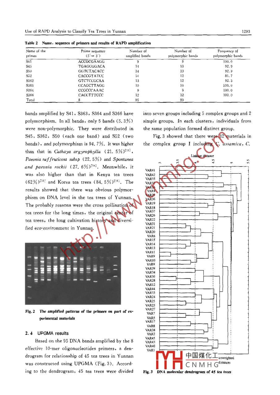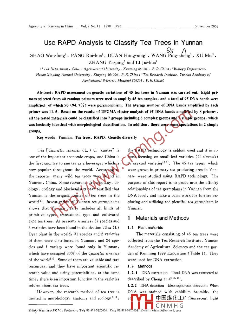 Agricultural Sciences in ChinaVol.2 No.11 1290 - 1296November 2003Use RAPD Analysis to Classify Tea Trees in Yunnan65 A.SHAO Wan-fang' , PANG Rui-hua2,DUAN Hong-xing',WANG Ping sheng' , XU Mci?,ZHANG Ya-ping' and LI Jia-hua'('Tea Department,Yunnan Agricultural Universily, Kunming 650201,P. R. China; 8 Biology Department ,Henan Xinyang Normal University, Xinyung 464000. P. R. China; 3 Tea Research Institute ,Yunnan Academy ofAgricultural Sriences, Menghai 666201, P. R. Chima)Abstract: RAPD assessment on genetic variations of 45 tea trees in Yunnan was carried out. Eight pri-mers selected from 40 random primers were used to amplify 45 tea samples, and a total of 95 DNA bands wereamplified, of which 90 (94, 7%) were polymorphism, The average number of DNA bands amplified by eachprimer was 11.5. Based on the results of UPGMA cluster analysis of 95 DNA bands amplified by 8 primers,all the tested materials could be classified into 7 groups including 5 complex groups and 2 simple groups, whichwas basically identical with morphological classification. In addition, there were some speciations in 2 simplegroups.Key words; Yunnan, Tea trees, RAPD, Genetic diversityTea [Camellia sinensis (L.) O. kuntze] isthe RAPD technology is seldom used and it is al-one of the important economic crops, and China ismost focusing on small-leaf varieties (C. sinensis)the first country to sue tea as a beverage, which is or asexual varietieslo-s?. The 45 tea trees, whichnow popular throughout the world. According towere grown in primary tea producing area in Y un-the reports, many wild tea trees were found innan, were studied using RAPD technology. TheYunnan, China. Some researches from botany, bipurpose of this report is to probe into the affinityology, ccology and biochemistry have testified thatrelationships of tea germplams in Y unnan from theYunnan is the original center of tea trees in theDNA level, and make a basis work for further ex-worldl. Investigation of Yunnan tea germplasmsploring and utilizing the plentiful tea germplasm inshows that Yunnan nearly includes all kinds ofYunnan.primitive type, transitional type and cultivated1 Materials and Methodstype tea trees. At present, 4 series, 37 species and3 varieties have been found in the Section Thea (L)1.1 Plant materidsDyer plant in the world, 31 species and 2 varietiesThe materials consisting of 45 tea trees wereof them were distributed in Yunnan, and 24 spe-collected from the Tea Research Institute, Y unnancies and 1 variety were found only in Y unnan,Academy of Agricultural Sciences and the tea gar-which have occupied 80% of the Camellia sinensisden of Kunming 1999 Exposition (Table 1). Theyof the world[2]. Some of them are valuable and rarewere used for DNA extraction.resources, and they have important scientific re-Methodsscarch value and using potentialities, at the same1.2.1 DNA extraction Total DNA was extracted astime, there is an important function in the varietiesdescribed by Cheng et al10.1..reform about tea trees.1. 2.2 DNA detection Electrophoresis dection: WhenHowever, the research method o[ tea tree isDNA was stained with ethidium bromide, thlimited in morphology, anatomy and ecologyla3.f中國煤化工ff fluorescent lightTYHCNMH GSHAO Wan fang(1957-). Professor. Tel: 86-871 5200050 Fax: 86 871 520003, E-mail: wlshao(@ hotmail comUse of RAPD Analysis 1o Classily Tea Trees in Yunnan1291Table 1 Forty-five tea tres as experimental materialsSerial numberNameOriginl placeScicntific naneTypeT-01Xueye100SimaoVariety (selection) .DuanjiebrihaoSmaoC. sinensis wr. assamica DuanjiebaihaoVariety (sclection)T-03YunmeiSimaC. sinersis var. assamrtca YunmeiGood variety in YunnanT-04Yunkxng10MenghaiC. sinensis var. assamica Yunkang10Good variely in ClhinaT05YunshanIZhnotongVariety (esietion)T-06Mengku-dayechaLincangC. sinensis war. assamica Mengku-dayechaGood variety in ChinaT 07Zhaotong taichaZhaotongC. sinensis Zhaorong taichaLocal wnrietyT-08Yuanjiang- nuochaYuxiC. sinens vuar. Pubilimba Yuanjiang *nuochal.ocal varietyT09YunguiC. sinensis var. asamica YunguiT-10ChangycbaihaoC. sinensis var. assanir ChangyebaihaoGood variety in YunranT11AifengC. sinensis war. assamica AilengGood variely in YunnanT 12TaoxingyeSiamoC. sinenris var. asanrica TaoxingyeVariety (selection)T-13C simensis vr. asumtica 99T.14BoshangintaiC. sinensis ver. assamica BoshangjintaiVariety slection)T-15ZaoyuanyeC. sinensis vuar. assamica ZaoyuanyeVaricty (selectiou)T-16BeohongchaYiliangC. sinersis BaohongchaIocal varietyT17MangshuidayeechaBoashanC sinersis wr. assamica MangshuideyechaLacal varietyT-18DhechaWensharC. dishiensis ZhangNew varielyT 19Old tea tree 1Wild tea treeT-20(ld te tree2 .T21CaneliaDebongCamelliuKindred plantT 22Huanglihe wild teaQujingC. tachangensis ZhangT-23Zijuan .New series (seletion)T-24New series (selcction)T-25Nanjian5DaliC. sinensis var. assa macu Nanjian5Variery (selerion)T 26Spcial large leafNo identifyT-27BabucheWenshanC, sinensis ur. assamica BabuchaLocal varietyT28Zhongshan- dayechaDehongC. sinensisuar. assamica Zhongshan dayecha1.ocal varietyT-29DanuochaChuxiongC. utrothea ZhangNew varetyT-30Zhongshan dayeC. sinensis wur. assamica Zhongshan- dayeLocal varielyT-31Manpenlong-dayechaC. sinensis wr. assamrica Manpenlong dayechaL.ocal varietyT-32DoushachaChuxiungC. sinensis DoushachaT-33BaimaochaC. assamira, uur. pulilimbaLoral varielyT-34NabeichaT-35Tuantian- dayechaBnoshanC. sinensis rar. assamica Tuantian dayechaLocal verietyT-36Xinbua-: shongmaochaC. sinensis Xinbue-shongmaocha1.ocal varielyT-37DatuanyechnT-38Xiaogude dayechaC. sinensis ur. asamica Xiaogude dayechaMengkurdeyeC. sinenris var. assamica MengkurdayeT-40MaandachaC. gymrogynoidesWild tea trceT41Ganlongtan-dayechaC sinensis var. assamica Ganlongtan dayechaT42MadenchaC. sinensis vwur. assamica MadcnchaT.43Hule maojianchaC. sinonsis Hule maojienchaLocal varictyT44Jinping- dayechaHongheC. sinenusis vur. as5amica Jinping-dayechaT-45T ujan-baiyachaC yankiangchaas it was inspired by the UV-light. The flu