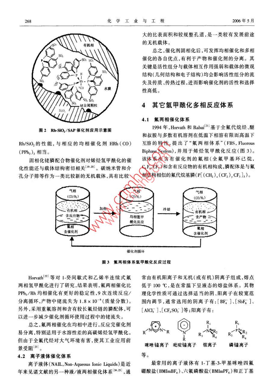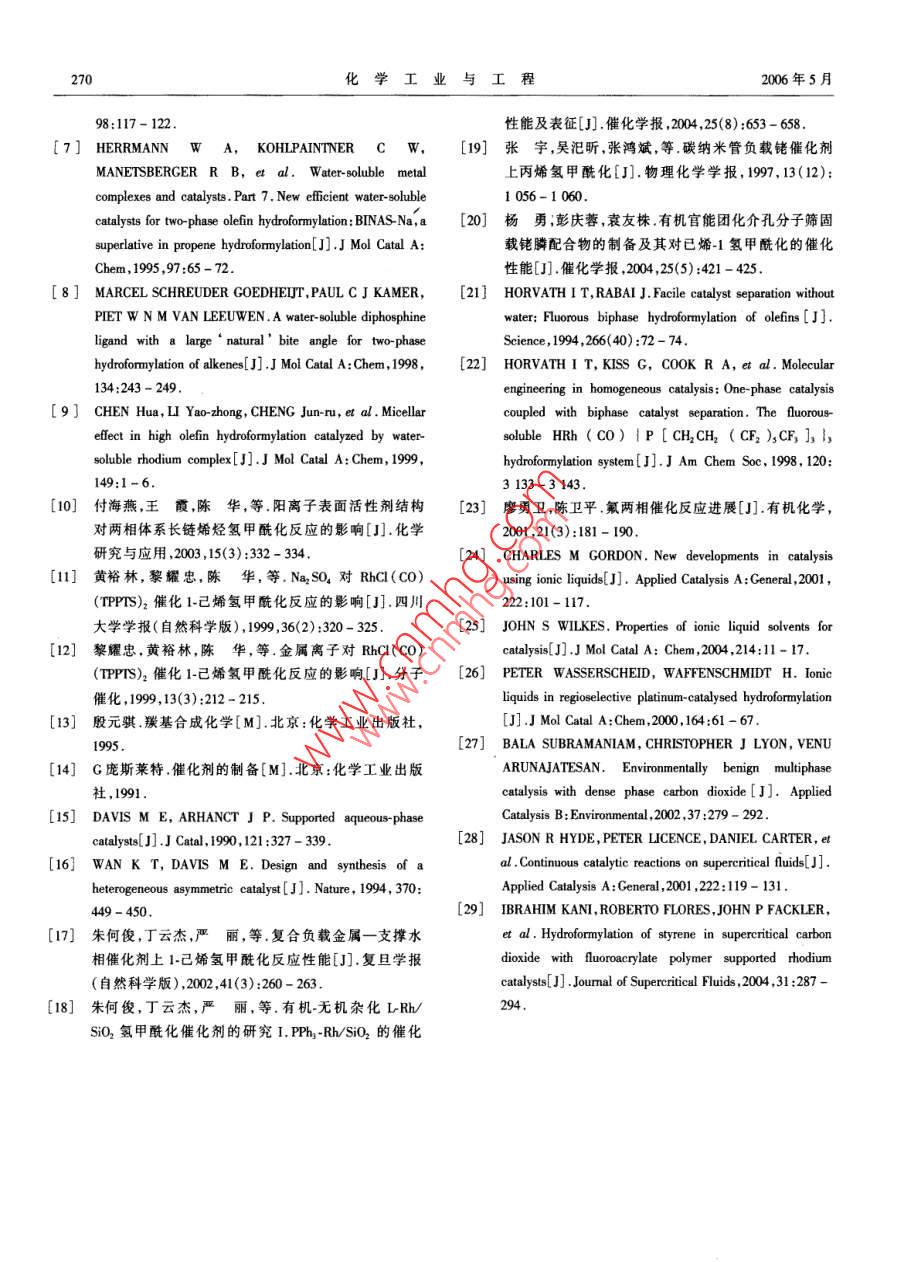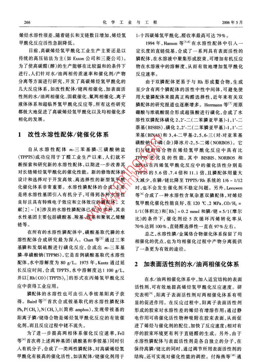2006年5月.化學(xué)工業(yè)與工程第23卷第3期May 2006CHEMICAL INDUSTRY AND ENGINEERINGVol.23 No.3文章編號:1004 - 9533(2006)03 - 0265 - 06高碳烯烴氫甲?;芯窟M展馬占華,劉雪暖,楊國華(中國石油大學(xué)(華東)化學(xué)化工學(xué)院,山東東營257061)摘要:水/有機兩相催化體系被成功應(yīng)用于低碳烯烴氫甲?;磻?yīng)。對于水溶性差的高碳烯烴,其氫甲?;磻?yīng)速度遠(yuǎn)遠(yuǎn)低于低碳烯烴。本文論述了近年來銠催化高碳烯烴氫甲酰化反應(yīng)的研究和開發(fā)進展,其新型配體和新催化體系的研究開發(fā)一直是該領(lǐng)城的研究熱點。主要涉及兩相反應(yīng)體系中的水溶性膦配體以及均相催化劑固相化、氟兩相催化、非離子液體催化體系和超臨界CO2中的氫甲?;磻?yīng)等幾種新型反應(yīng)體系。關(guān)鍵詞:氫甲?;?水溶性膦配體;擔(dān)載水相催化劑;多相反應(yīng)體系中圖分類號:0623.121; TQ224.12*9文獻標(biāo)識碼:AReview on Hydroformylation of Higher OlefinsMA Zhan-hua, LIU Xue-nuan,YANG Guo hua(College of Chemistry and Chemical Engineering, China University of Petroleum, Shandong Dongying 257061,China)Abstract: W ater-soluble rhodium- phosphine complexes have been successfully applied in lower olefinhydroformylation. For higher olefin that has poor solubility in water, the hydroformylation reaction rate is muchless than short-chain alkenes. This review covers the recent advances in Rh- catalysed hydroformylation ofhigher olefin, most of investigations in this field focus on the synthesis of new effective phosphine ligands andnew catalysis systems. In particular, the developments of new-style reaction system, such as water-solublephosphine in two-phase catalysis system, the supported catalysts , fluorous biphase system, non- aqueous ionicliquids catalysis and hydroformylation in supercritical carbon dioxide were mainly introduced in this paper.Key words: hydroformylation; water-soluble phosphine ligand; supported aqueous phase catalysts; multiphasereaction system烯烴在羰基金屬絡(luò)合物催化劑作用下可與CO后開發(fā)了4代催化劑,50年代的Co2(CO)。 .60年代和H2發(fā)生反應(yīng)生成醛,通常稱之為氫甲?;磻?yīng)的HCo( CO), (PBu,).70年代的HRh(C0)(PPh,),或氧化加成反應(yīng)(0X0)。.(UCC法)和80年代的Rh( CO) (TPPTS)3 ( RCP/RP氫甲?;a(chǎn)品主要是醛,可不經(jīng)分離,用氫化法法)。其中,RCP/RP法是水/油兩相反應(yīng),用于丙烯轉(zhuǎn)化成各種伯醇。其被廣泛用于洗滌劑、添加劑和氫甲?;钚院?反應(yīng)條件溫和,加氫及醇醛縮和等浮選劑的制造,其中高級醇是制造聚氯乙烯酯類增副反應(yīng)少,解決了產(chǎn)物與催化劑的分離問題,同時提塑劑的重要原料。從1938年至今,隨著科學(xué)技術(shù)的出了均相催化多相化的概念,引起了人們的高度重發(fā)展,研究和開發(fā)的烯烴氫甲?;I(yè)催化劑的性視。當(dāng)該體系用于高碳烯烴氫甲?;瘯r,由于高碳能得到不斷改進" ,從20世紀(jì)50年代~ 80年代先收稿日期:2005-06- 10作者簡介:馬占華(1980-),女,黑龍江勃利人,博士研究生。聯(lián)系人:劉雪暖,電話:(0546)8391251 , E mail:Ixnuan@ hdpu . edu. cn。266化學(xué)工業(yè)與工程2006年5月烯烴水溶性很差,隨著鏈長和支鏈數(shù)目增加,烯烴氫1-+ 四碳烯氫甲?;?醛收率最高可達79%。甲?;磻?yīng)活性急劇降低。1994年, Hanson等Is.]) 在水溶性配體中引入一目前,高碳烯烴氫甲?;I(yè)生產(chǎn)主要還是以定長度的直鏈烷基,合成了一系列具有表面活性的傳統(tǒng)的高壓鈷法為主(如Exxon公司和三菱公司)。膦 配體,在水溶液中聚集形成膠束,可增加有機反應(yīng).為了使高碳醛(醇)的生產(chǎn)能夠在比較溫和的條件下物在水溶液中的溶解度,從而有效地增加氫甲?;M行,人們針對水/油兩相傳質(zhì)速率和催化劑/產(chǎn)物反應(yīng)速率。分離等方面進行研究,開發(fā)了高碳烯烴氫甲?;挠捎陔p膦配體更易于與Rh 形成螯合物,生成幾大反應(yīng)體系,如改性配體/銠兩相催化、加表面活至少含有兩個膦配體的活性中性中間體,可避免使性劑的水/油兩相催化、固載催化、氟兩相催化、離子用大量膦配體來提高正構(gòu)醛選擇性,近年來有關(guān)雙液體體系和超臨界氫甲酰化反應(yīng)等,所有這些研究膦配體的研究報道也逐漸增多。Hermann 等[7]用原都極大地促進了高碳烯烴氫甲酰化以及均相催化多硼酸與濃硫酸混合形成超強酸進行磺化,合成了水相化的發(fā)展。溶性雙膦配體磺化2,2'-二(二苯膦亞甲基)-1,1'-二萘基( BISBIS)、磺化2,2'-二(二苯膦亞甲基)-1,1'-二1改性水溶性配體/銠催化體系苯基(BINAS)和3,4二甲基-2,5,6-三(對_對亞苯基磺酸鈉)-1-磷(雜)降冰片-2,5-二烯(NORBOS)。它自從水溶性配體m-三苯基膦~三磺酸鈉鹽們與銠的絡(luò)合物在烯烴氫甲酰化反應(yīng)中具有比(TPPTS)成功應(yīng)用于丁醛工業(yè)生產(chǎn)以來,人們就不TPPTS更優(yōu)良的性能,其中BISBIS、 NORBOS和斷探索和研究新的水溶性配體,以期進一步改善其BINAS在丙烯氫甲?;磻?yīng)中的催化活性分別是對長鏈烯烴氫甲?;拇呋阅?。新的修飾配體的TPPTS的5.6倍、7.4倍和11.1倍,且膦配體用量大設(shè)計和選擇對于開發(fā)高效、高選擇性的新型氫甲酰大減少,在膦/銠比降至TPPTS/Rh系統(tǒng)的1/6 ~ 1/12化催化體系非常重要。水溶性膦配體的合成,主要時,也不會發(fā)生催化劑不穩(wěn)定問題。另外,Leeuwen;是將水溶性基團引人有機分子,可得到各種水溶性等8]合成了一種水溶