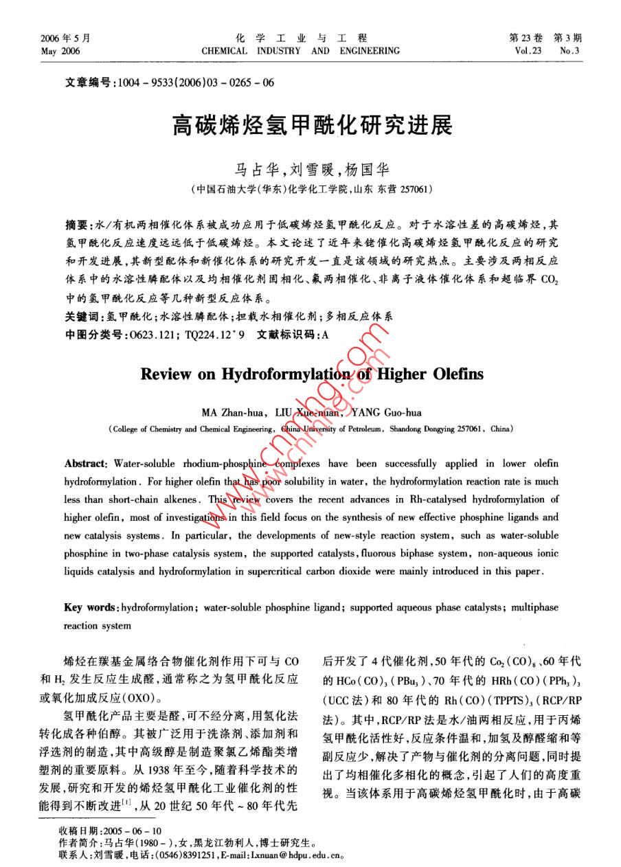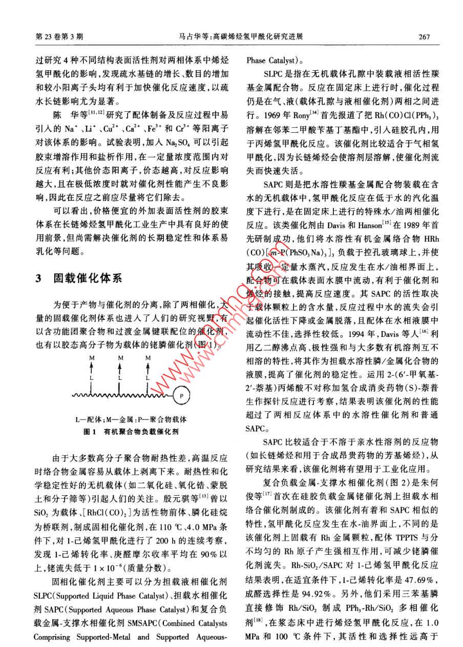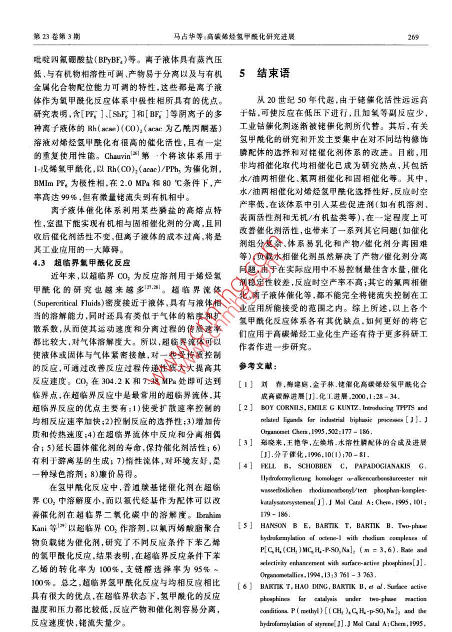 2006年5月.化學(xué)工業(yè)與工程第23卷第3期May 2006CHEMICAL INDUSTRY AND ENGINEERINGVol.23 No.3文章編號:1004 - 9533(2006)03 - 0265 - 06高碳烯烴氫甲?;芯窟M展馬占華,劉雪暖,楊國華(中國石油大學(xué)(華東)化學(xué)化工學(xué)院,山東東營257061)摘要:水/有機兩相催化體系被成功應(yīng)用于低碳烯烴氫甲?;磻?yīng)。對于水溶性差的高碳烯烴,其氫甲?;磻?yīng)速度遠(yuǎn)遠(yuǎn)低于低碳烯烴。本文論述了近年來銠催化高碳烯烴氫甲酰化反應(yīng)的研究和開發(fā)進展,其新型配體和新催化體系的研究開發(fā)一直是該領(lǐng)城的研究熱點。主要涉及兩相反應(yīng)體系中的水溶性膦配體以及均相催化劑固相化、氟兩相催化、非離子液體催化體系和超臨界CO2中的氫甲?;磻?yīng)等幾種新型反應(yīng)體系。關(guān)鍵詞:氫甲?;?水溶性膦配體;擔(dān)載水相催化劑;多相反應(yīng)體系中圖分類號:0623.121; TQ224.12*9文獻標(biāo)識碼:AReview on Hydroformylation of Higher OlefinsMA Zhan-hua, LIU Xue-nuan,YANG Guo hua(College of Chemistry and Chemical Engineering, China University of Petroleum, Shandong Dongying 257061,China)Abstract: W ater-soluble rhodium- phosphine complexes have been successfully applied in lower olefinhydroformylation. For higher olefin that has poor solubility in water, the hydroformylation reaction rate is muchless than short-chain alkenes. This review covers the recent advances in Rh- catalysed hydroformylation ofhigher olefin, most of investigations in this field focus on the synthesis of new effective phosphine ligands andnew catalysis systems. In particular, the developments of new-style reaction system, such as water-solublephosphine in two-phase catalysis system, the supported catalysts , fluorous biphase system, non- aqueous ionicliquids catalysis and hydroformylation in supercritical carbon dioxide were mainly introduced in this paper.Key words: hydroformylation; water-soluble phosphine ligand; supported aqueous phase catalysts; multiphasereaction system烯烴在羰基金屬絡(luò)合物催化劑作用下可與CO后開發(fā)了4代催化劑,50年代的Co2(CO)。 .60年代和H2發(fā)生反應(yīng)生成醛,通常稱之為氫甲?;磻?yīng)的HCo( CO), (PBu,).70年代的HRh(C0)(PPh,),或氧化加成反應(yīng)(0X0)。.(UCC法)和80年代的Rh( CO) (TPPTS)3 ( RCP/RP氫甲?;a(chǎn)品主要是醛,可不經(jīng)分離,用氫化法法)。其中,RCP/RP法是水/油兩相反應(yīng),用于丙烯轉(zhuǎn)化成各種伯醇。其被廣泛用于洗滌劑、添加劑和氫甲?;钚院?反應(yīng)條件溫和,加氫及醇醛縮和等浮選劑的制造,其中高級醇是制造聚氯乙烯酯類增副反應(yīng)少,解決了產(chǎn)物與催化劑的分離問題,同時提塑劑的重要原料。從1938年至今,隨著科學(xué)技術(shù)的出了均相催化多相化的概念,引起了人們的高度重發(fā)展,研究和開發(fā)的烯烴氫甲?;I(yè)催化劑的性視。當(dāng)該體系用于高碳烯烴氫甲?;瘯r,由于高碳能得到不斷改進" ,從20世紀(jì)50年代~ 80年代先收稿日期:2005-06- 10作者簡介:馬占華(1980-),女,黑龍江勃利人,博士研究生。聯(lián)系人:劉雪暖,電話:(0546)8391251 , E mail:Ixnuan@ hdpu . edu. cn。266化學(xué)工業(yè)與工程2006年5月烯烴水溶性很差,隨著鏈長和支鏈數(shù)目增加,烯烴氫1-+ 四碳烯氫甲?;?醛收率最高可達79%。甲?;磻?yīng)活性急劇降低。1994年, Hanson等Is.]) 在水溶性配體中引入一目前,高碳烯烴氫甲?;I(yè)生產(chǎn)主要還是以定長度的直鏈烷基,合成了一系列具有表面活性的傳統(tǒng)的高壓鈷法為主(如Exxon公司和三菱公司)。膦 配體,在水溶液中聚集形成膠束,可增加有機反應(yīng).為了使高碳醛(醇)的生產(chǎn)能夠在比較溫和的條件下物在水溶液中的溶解度,從而有效地增加氫甲?;M行,人們針對水/油兩相傳質(zhì)速率和催化劑/產(chǎn)物反應(yīng)速率。分離等方面進行研究,開發(fā)了高碳烯烴氫甲?;挠捎陔p膦配體更易于與Rh 形成螯合物,生成幾大反應(yīng)體系,如改性配體/銠兩相催化、加表面活至少含有兩個膦配體的活性中性中間體,可避免使性劑的水/油兩相催化、固載催化、氟兩相催化、離子用大量膦配體來提高正構(gòu)醛選擇性,近年來有關(guān)雙液體體系和超臨界氫甲酰化反應(yīng)等,所有這些研究膦配體的研究報道也逐漸增多。Hermann 等[7]用原都極大地促進了高碳烯烴氫甲酰化以及均相催化多硼酸與濃硫酸混合形成超強酸進行磺化,合成了水相化的發(fā)展。溶性雙膦配體磺化2,2'-二(二苯膦亞甲基)-1,1'-二萘基( BISBIS)、磺化2,2'-二(二苯膦亞甲基)-1,1'-二1改性水溶性配體/銠催化體系苯基(BINAS)和3,4二甲基-2,5,6-三(對_對亞苯基磺酸鈉)-1-磷(雜)降冰片-2,5-二烯(NORBOS)。它自從水溶性配體m-三苯基膦~三磺酸鈉鹽們與銠的絡(luò)合物在烯烴氫甲酰化反應(yīng)中具有比(TPPTS)成功應(yīng)用于丁醛工業(yè)生產(chǎn)以來,人們就不TPPTS更優(yōu)良的性能,其中BISBIS、 NORBOS和斷探索和研究新的水溶性配體,以期進一步改善其BINAS在丙烯氫甲?;磻?yīng)中的催化活性分別是對長鏈烯烴氫甲?;拇呋阅?。新的修飾配體的TPPTS的5.6倍、7.4倍和11.1倍,且膦配體用量大設(shè)計和選擇對于開發(fā)高效、高選擇性的新型氫甲酰大減少,在膦/銠比降至TPPTS/Rh系統(tǒng)的1/6 ~ 1/12化催化體系非常重要。水溶性膦配體的合成,主要時,也不會發(fā)生催化劑不穩(wěn)定問題。另外,Leeuwen;是將水溶性基團引人有機分子,可得到各種水溶性等8]合成了一種水溶