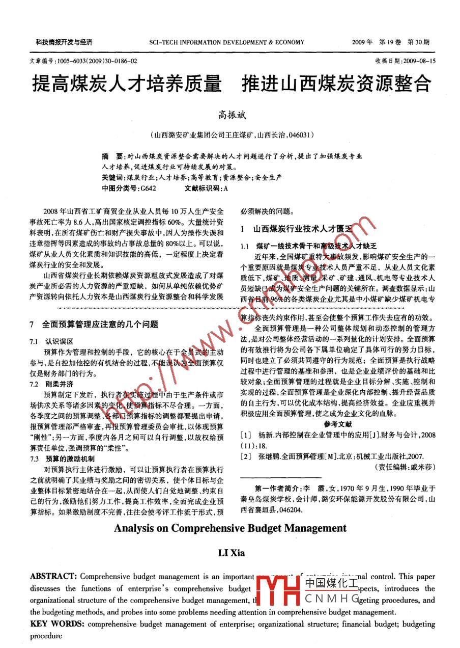 科技情報開發(fā)與經(jīng)濟SCI-TECH INFORMATION DEVELOPMENT & ECONOMY2009年第19卷 第30期文章編號: 1005- 633(2009 )30-0186-02收稿日期:2009-08-15提高煤炭人才培養(yǎng)質(zhì)量推進山 西煤炭資源整合高振斌(山西潞安礦業(yè)集團公司王莊煤礦,山西長治,046031)摘要:對山西煤炭資源 整合需要解決的人才問題進行了分析,提出了加強煤炭專業(yè)人才培養(yǎng),促進煤炭行業(yè)可持續(xù)發(fā)展的對策。關(guān)鍵詞:煤炭行業(yè);人才培養(yǎng);高等教育;資源整合;安全生產(chǎn)中圖分類號:C642文獻標(biāo)識碼:A2008年山西省工礦商貿(mào)企業(yè)從業(yè)人員每10萬人生產(chǎn)安全必須解決的問題。事故死亡率為8.6人.高出國家核定調(diào)控指標(biāo)60%。大量統(tǒng)計資1山西煤炭行業(yè)技術(shù)人才匱乏料表明,在所有煤礦傷亡和財產(chǎn)損失事故中,因人為操作失誤和違章指揮等因素造成的事故約占事故總量的80%以上??梢哉f,1.1 煤礦- -線技術(shù)骨干和高級技術(shù)人才缺乏煤礦從業(yè)人員文化素質(zhì)和知識技能的高低,一定程度上決定著近年來,全國煤礦重特大事故頻發(fā),影響煤礦安全生產(chǎn)的- -煤炭行業(yè)的安全和發(fā)展。個重要原因就是煤炭專業(yè)技術(shù)人員嚴(yán)重不足,從業(yè)人員文化素山西省煤炭行業(yè)長期依賴煤炭資源粗放式發(fā)展造成了對煤質(zhì)低下,煤礦、地質(zhì)、測量、采礦、礦建、通風(fēng)、機電等專業(yè)技術(shù)人炭產(chǎn)業(yè)所必需的人力資源的嚴(yán)重短缺,如何從單純依賴優(yōu)勢礦員短缺已成為煤礦安全生產(chǎn)問題的關(guān)鍵所在。調(diào)查數(shù)據(jù)顯示:山產(chǎn)資源轉(zhuǎn)向依托人力資本是山西煤炭行業(yè)資源整合和科學(xué)發(fā)展西省目前96%的各類煤炭企業(yè)尤其是中小煤礦缺少煤礦機電專算指標(biāo)喪失約束作用,甚至?xí)拐麄€預(yù)算工作失去應(yīng)有的功效。7全 面預(yù)算管理應(yīng)注意的幾個問題全面預(yù)算管理是-.種公司整體規(guī)劃和動態(tài)控制的管理方7.1認識誤區(qū)法,是對公司整體經(jīng)營活動的-系列量化的計劃安排。全面預(yù)算預(yù)算作為管理和控制的手段,它的核心在于全員式的主動的有效推行將為公司各下屬單位確定了具體可行的努力目標(biāo),參與,是自控加他控的有機結(jié)合的過程,不能誤認為全面預(yù)算僅同時也建立了必須共同遵守的行為規(guī)范;全面預(yù)算是執(zhí)行戰(zhàn)略僅是財務(wù)部門的行為。過程中進行管理的基準(zhǔn)和參照,也是企業(yè)業(yè)績評價的基礎(chǔ)和比7.2 剛?cè)岵^對象;全面預(yù)算管理的過程就是企業(yè)目標(biāo)分解、實施、控制和預(yù)算制定下發(fā)后,執(zhí)行者在實施過程中由于生產(chǎn)條件或市實現(xiàn)的過程,全面預(yù)算管理是企業(yè)深化內(nèi)部控制、提升經(jīng)營品質(zhì)場供求關(guān)系等諸多因素的變化.使預(yù)算指標(biāo)不盡合理。一方面,的自主行為,可以優(yōu)化成本結(jié)構(gòu).提高經(jīng)濟效益。企業(yè)應(yīng)重視并各季度之間的預(yù)算調(diào)整各部門預(yù)算指標(biāo)的調(diào)整都要提出申請,積極應(yīng)用全面預(yù)算管理,使之成為企業(yè)文化的血脈。報預(yù)算管理部嚴(yán)格審查,再報預(yù)算管理委員會審批,以體現(xiàn)預(yù)算參考文獻“剛性”;另一方面,季度內(nèi)各之間可以自行調(diào)整,以放權(quán)給預(yù)[1]楊新內(nèi)部控制在企業(yè)管 理中的應(yīng)用[J]財務(wù)與會計,2008算責(zé)任單位,強調(diào)預(yù)算的“柔性”。(11):18.[2]張繼鵬.全面預(yù)算管 理[M].北京:機械工業(yè)出版社,2007.7.3預(yù)算 的激勵機制對預(yù)算執(zhí)行主體進行激勵,可以讓預(yù)算執(zhí)行者在預(yù)算執(zhí)行(責(zé)任編輯:戚米莎)之前就明確了其業(yè)績與獎勵之間的密切關(guān)系,使個體目標(biāo)與企業(yè)整體目標(biāo)緊密地結(jié)合在一起,從而使人們自覺地調(diào)整、約束自第- -作者簡介:李霞,女,1970 年9月生.1990年畢業(yè)于己的行為,激勵他們努力工作,提高工.作效率,全面完成企業(yè)預(yù)秦皇島煤炭學(xué)校,會計師,潞安環(huán)保能源開發(fā)股份有限公司,山算指標(biāo)。如果激勵制度不完善.往往會使考評工作流于形式,預(yù)西省襄垣縣,046204.Analysis on Comprehensive Budget ManagementLI XiaABSTRACT: Comprehensive budget management is an important中國煤化工l control. This paperdiscusses the functions of enterprise s comprehensive budgetspects, introduces thorganizational structure of the comprehensive budget management, tMYHC N M H Ggeting procedures, andthe budgeting methods, and probes into some problems needing attention in comprehensive budget management.KEY WORDS: comprehensive budget management of enterprise; organizational structure; financial budget; budgetingprocedure86高振斌提高煤炭人才培養(yǎng)質(zhì)量 推進山西煤炭資源整合本刊E-mailjb@sxinfo.net人力資源開發(fā)業(yè)人才,88%的煤炭企業(yè)缺乏采礦專業(yè)人才。煤礦主要專業(yè)工程級專業(yè)技術(shù)人才青黃不接的問題。同時,對煤礦來說,應(yīng)明確對技術(shù)人員緊缺直接導(dǎo)致安全生產(chǎn)的法律法規(guī)及規(guī)章制度無法落專業(yè)技術(shù)人員的要求,特別是對于關(guān)鍵崗位人員的配備要求。實。煤炭企業(yè)缺乏高索