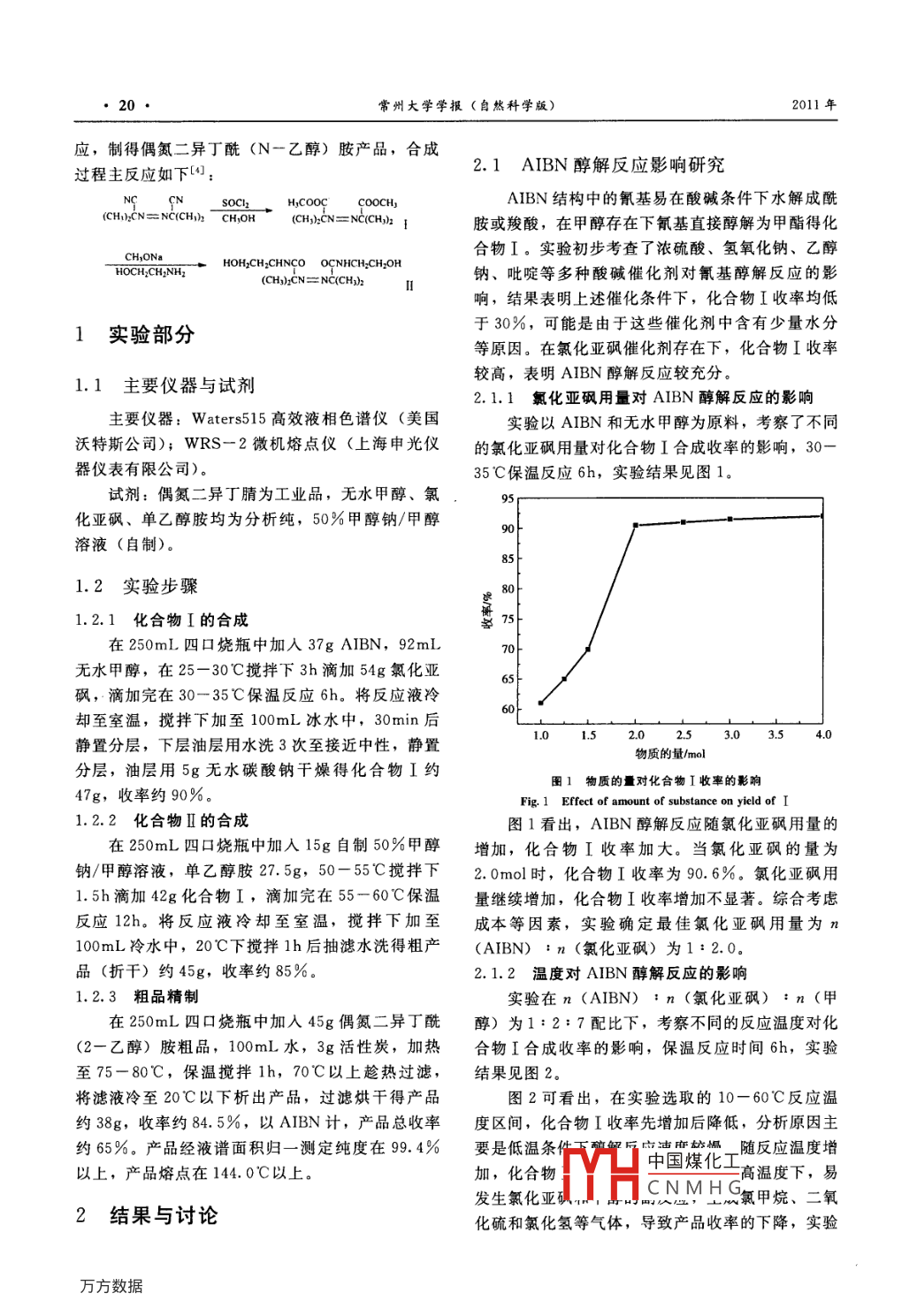 第23卷第4期常州大學(xué)學(xué)報(bào)(自然科學(xué)版)2011年12月Journal of Changzhou University (Natural Science Edition)Dec.2011文章編號(hào):2095—0411(2011)04-0019-04偶氮二異丁酰(N一乙醇)胺的合成徐光輝1,朱國(guó)彪2(1.江蘇華達(dá)化工集團(tuán)生產(chǎn)部,江蘇常州213033;2.常州大學(xué)江蘇省精細(xì)石油化工重點(diǎn)實(shí)驗(yàn)室,江蘇常州213164)摘要:以偶氮二異丁腈和甲醇為原料,經(jīng)氯化亞砜催化下的醇解反應(yīng)得到偶氮2-甲基丙酸甲酯,收率90.6%;將該酯化物和單乙醇胺經(jīng)甲醇鈉催化下的氨解反應(yīng)得到偶氮二異丁酰(2-乙醇)胺,收率85,1%;粗產(chǎn)品經(jīng)水重結(jié)晶得到目標(biāo)產(chǎn)品,收率84.5%。合成過(guò)程總收率65%以上,產(chǎn)品純度99.4%以上關(guān)鍵詞:醇解反應(yīng);氨解反應(yīng);偶氮二異丁酰(N-乙醇)胺;重結(jié)晶中圖分類(lèi)號(hào):TQ314文獻(xiàn)標(biāo)識(shí)碼:AStudy of the Synthesis of 2, 2- Azobis N-Ethanol-2MethylpropionamideXU Guang-hui, ZHU Guo-biao(1. Production Department, Jiangsu Huada Chemical Group Co. Ltd, Changzhou 213033, China; 2.iangsu Key laboratory of Fine Petrochemicals, Changzhou University, Changzhou 213164, China)Abstract: 2,2, -azobis 2-methyl propionate methyl ester was obtained with the ester yield of 90.6%by using azodiisobutyronitrile and methanol as raw materials and by alcoholysis reaction of thionyl chlorideas catalyst. The above ester was ammonolysised with monoethanolamine to produce 2, 2 -azobis Nethanol-2-methylpropionamide with the product yield of 85. 1%. The desired product was obtained byrecrystallization of the above product in water with the yield of 84.5%. The total yield of the desired product for this process is above 65% with the product purity above 99.4%Key words: alcoholysis reaction; ammonolysis reaction; 2, 2'-azobis N-ethanol-2-methylpropionamide; recrystallization偶氮二異丁酰(N—乙醇)胺是一種新型安全穩(wěn)定、毒性小及分解溫度高等特性,有望替代上述高效的引發(fā)劑。目前工業(yè)常用引發(fā)劑是偶氮二異丁兩種工業(yè)引發(fā)劑,成為一種新型安全高效的工業(yè)引腈(AIBN)和過(guò)氧化苯甲酰(BPO)。AIBN具有發(fā)劑分解溫度低,易燃易爆并放出有機(jī)氰化物的性質(zhì),迄今為止國(guó)際上尚無(wú)偶氮二異丁酰(N-乙對(duì)人體傷害極大;BPO是一種極不穩(wěn)定的強(qiáng)氧化醇)胺產(chǎn)品成熟的工業(yè)化生產(chǎn)工藝,國(guó)內(nèi)幾乎未見(jiàn)劑,受熱、摩擦和撞擊時(shí)易燃燒爆炸,生產(chǎn)運(yùn)輸及此產(chǎn)品合成的相關(guān)報(bào)道。本文以偶氮二異丁腈、甲使用這兩種引發(fā)劑的企業(yè)和單位發(fā)生了眾多的燃燒醇為原料,在氯化亞砜催化劑存在下合成了化合物爆炸事故2。偶氮二異丁酰(N-乙醇)胺具有I,化合物I在甲醇鈉催化劑存在下和單乙醇胺反收稿日期:2011-09-26中國(guó)煤化工作者簡(jiǎn)介:徐光輝(1964-),男,江蘇武進(jìn)人,高級(jí)工程師。CNMHG常州大學(xué)學(xué)報(bào)(自然科學(xué)版)2011年應(yīng),制得偶氮二異丁酰(N一乙醇)胺產(chǎn)品,合成過(guò)程主反應(yīng)如下:2.1AIBN醇解反應(yīng)影響研究AIBN結(jié)構(gòu)中的氰基易在酸堿條件下水解成酰胺或羧酸,在甲醇存在下氰基直接醇解為甲酯得化合物Ⅰ。實(shí)驗(yàn)初步考查了濃硫酸、氫氧化鈉、乙醇HOH: CH, CHNCO OCNHCH- CH-OHOCH: CH,NH(CH3)CN=NC(CH,)z鈉、吡啶等多種酸堿催化劑對(duì)氰基醇解反應(yīng)的影響,結(jié)果表明上述催化條件下,化合物I收率均低1實(shí)驗(yàn)部分于30%,可能是由于這些催化劑中含有少量水分等原因。在氯化亞砜催化劑存在下,化合物I收率1.1主要儀器與試劑較高,表明AIBN醇解反應(yīng)較充分。2.1.1氯化亞砜用量對(duì)AIBN醇解反應(yīng)的影響主要儀器: Waters515高效液相色譜儀(美國(guó)實(shí)驗(yàn)以AIBN和無(wú)水甲醇為原料,考察了不同沃特斯公司);WRS-2微機(jī)熔點(diǎn)儀(上海申光儀的氯化亞砜用量對(duì)化合物I合成收率的影響,30-器儀表有限公司)35℃保溫反應(yīng)6h,實(shí)驗(yàn)結(jié)果見(jiàn)圖1試劑:偶氮二異丁腈為工業(yè)品,無(wú)水甲醇、氯化亞砜、單乙醇胺均為分析純,50%甲醇鈉/甲醇溶液(自制)。1.2實(shí)驗(yàn)步驟1.2.1化合物I的合成在250mL四口燒瓶中加入37 g AIBN,92mL無(wú)水甲醇,在25-30℃攪拌下3h滴加54g氯化亞砜,滴加完在30-35℃保溫反應(yīng)6h。將反應(yīng)液冷卻至室溫,攪拌下加至100mL冰水中,30min后靜置分層,下層油層用水洗3次至接近中性,靜置102.02.5物質(zhì)的量/mol分層,油層用5g無(wú)水碳酸鈉干燥得化合物Ⅰ約圖1物質(zhì)的量對(duì)化合物I收率的影響47g,收率約90%Fig. 1 Effect of amount of substance on yield of I1.2.2化合物Ⅱ的合成圖1看出,AIBN醇解反應(yīng)隨氯化亞砜用量的在250mL四口燒瓶中加入15g自制50%甲醇增加,化合物I收率加大。當(dāng)氯化亞砜的量為鈉/甲醇溶液,單乙醇胺27·5g,50-55℃攪拌下2.0mol時(shí),化合物I收率為90.6%。氯化亞砜用1·$h滴加42g化合物I,滴加完在55-60℃保溫量繼續(xù)增加,化合物Ⅰ收率增加不顯著。綜合考慮反應(yīng)12h。將反應(yīng)液冷卻至室溫,攪拌下加至成本等因素,實(shí)驗(yàn)確定最佳氯化亞砜用量為n100mL冷水中,20C下攪拌1h后抽濾水洗得粗產(chǎn)(AIBN):n(氯化亞砜)為1:2.0。品(折干)約45g,收率約85%。2.1.2溫度對(duì)AIBN醇解反應(yīng)的影響12.3粗品精制實(shí)驗(yàn)在n(AIBN):n(氯化亞砜):n(甲在250mL四口