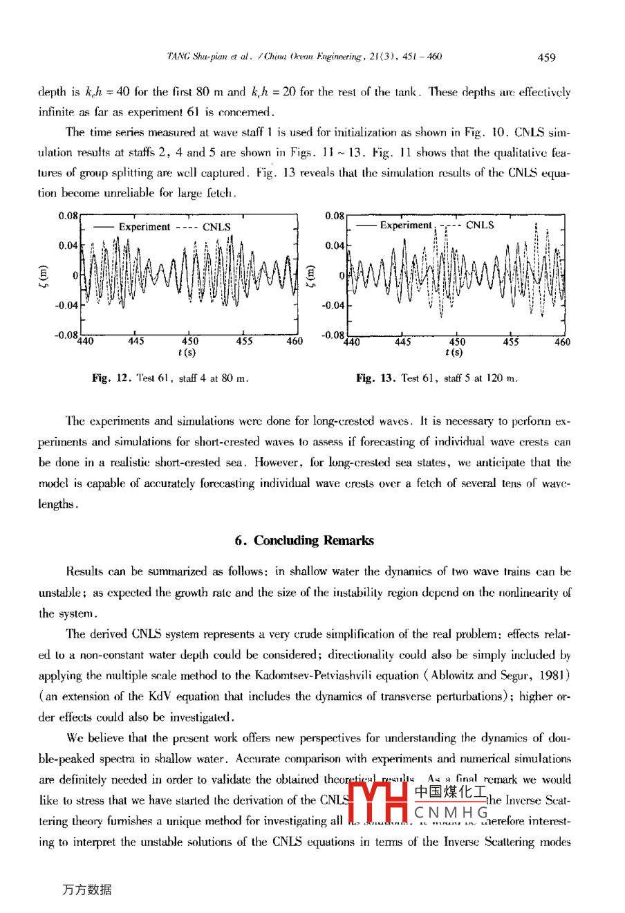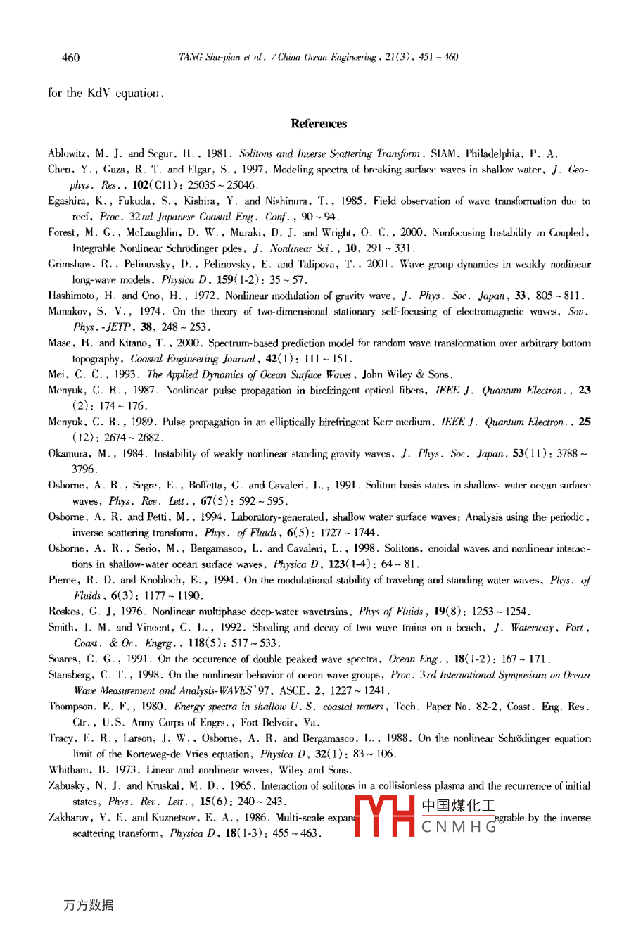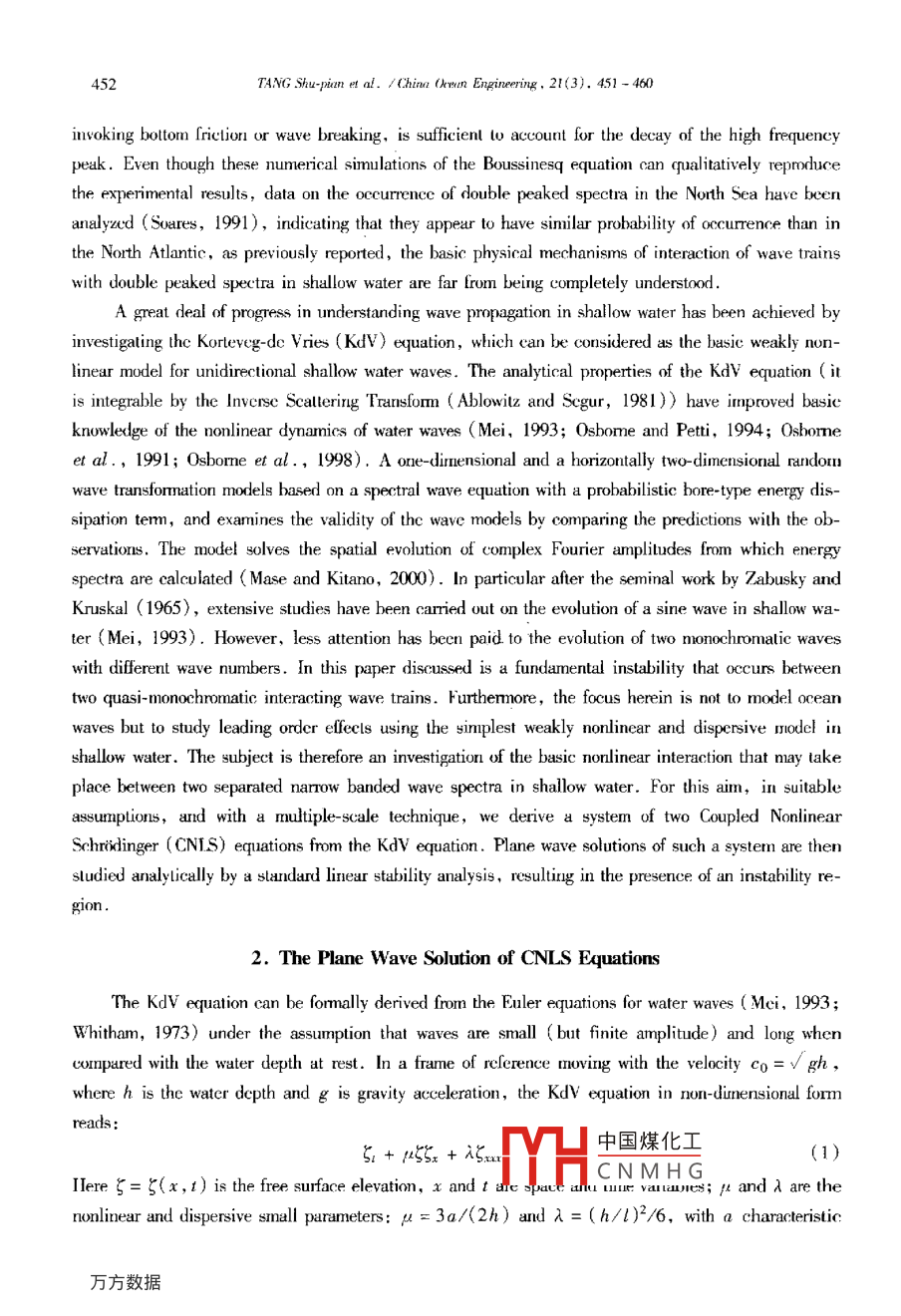 China Ocern Finginepring, Vol.21, No.3, pp. 451- 460C 2007 China Ocean Press, ISSN 0890-5487Instability of Two Interacting Quasi-MonochromaticWaves in Shallow Water*TANC Shu-pian (湯叔梗)°.l,WEI Li-xin (書立新)盧and XU Yuan (徐援)“且School of Sciences,llebei University of Science and Tehnology ,Shijiazhuang 050018, China”The Surey Bureoau of Hydrology ard Wuter Resures of louer Reaches ofChangjiang Riter, CWRC,Nanjing 210011, ChinaColage of Sciences,Hohai Unirersity, Nanjing 210098, China(Received 6 November 2006; acrepled 25 April 2007)ABSTRACTThe nonlinear inleractiuns of waves with a double- peaked power spetum have been studied in shallow water. 'Thestarting poinl is dhe prololypical eqpuation for nonlinear uridirectional wavcs in shallow water, i.e. the Korteweg de: Vriesecquation. By mears o[ a muliple- scale technique two defocusing coupled Nonlinear Schridinger equations are derived. IIis found analyically lhal plare wave solutions of such a system are unstable: for small px:turbations, showing that the cxis-tence of a new energy exchange mechanism which can influence the behavior of occan wavcs in shallw water.Key words: intbility; ocean wue; Koreweg de lries equntion; coupled nonlinear Schridinger equation; plane uanxesolution1. IntroductionThe propagation of multiple wave-train systems in shalow water has historically received less at-tention than the propagation of a single wave train. Nevertheless, experimental studies carried out byThompson ( 1980) in representative sites near the coasts of the United States reveal that in 65% of the .analyzed datu, ocean wave spectra show two or more separaled peaks in the frequency dornain (Thomp-son,1980; Egashira, 1985; Smith and Vinccnt, 1992). In this framework, experimental work in thelaboralory has been performed (Smith and Vincent, 1992) . They propagated iregular wave trains withtwo distinct spectral peaks in a wavc lune with 1: 30 slope for different valucs of the peak frequeneyand significant wave height. From a physical point of view, this condition mimics the interaction of twowave regimes, a“swell” and a“sea” ,propagating in the same direction toward shore in shallow wa-ter. Thcir major observation was in a decay of the higher frequency peak along the flumc. They hypoth-esizxd three possible explanations for such experimental results: (i) resonant inleractions amongwaves, (i) botton friction that acls differently for the two dominant wave peaks, ( ii) breaking of theshorter waves enhanced by the presence of the longer waves. More recently, using a higher orderBoussinesq model, Chen et al. ( 1997) have shown .中國煤化Interacions, without* The paper was financialy suponted by he Nalinal Natural SoYH. C N MH Gu No. 40476062) andFoundation of Hebei Universily of Science and Technology1 Cnorresponding author. E-mail: tangshupian@ sina. com452TANG Shu-pian et al. / Chin (kewn Enpineering. 21(3). 451 - 460invoking bottom friction or wave breaking,is sufficient w account for the decay of the high frequencypeak. Even though these numerical simulations of the Boussinesq equation can qualitatively reproducethe experimental results, data on the occurence of double peaked spectra in the North Sea have beenanalyoed (Soares, 1991) ,indicating that they appeur to have similar probability of occurence than inthe North Atlantic, as previously reported, the basic physical mechanisms of interaction of wave trainswith double peaked spectra in shallow water are far from being completely understood.A great deal of progress in understanding wave propagation in shallow water has been achieved by .investigating the Korteveg -de Vries (KdV) equation, which can be considered as the basic weakly non-linear model for unidirectional shallow water waves. The analytical properties of the KdV equation ( itis integrable by the Inversc Scatlering Trnsform ( Ablowitz and Scgur, 1981)) have improved basicknowledge of the nonlinear dynamics of water waves (Mei, 1993; Osbome and Petti, 1994 ; Osbormeet al.,1991; Osborne et al. 1998). A one-dimensional and a horizontally two dimensional randornwave transformnation models based on a spectral wave equation with a probabilistic bore-type energy dis-sipation term, and examines the validity of the wave models by comparing the predictions with the ob-servations. The model solves the spatial evolution of complex Fourier amplitudes from which energyspectra are calculated ( Mase and Kitano, 2000). In particular after the seminal work by Zabusky andKruskal ( 1965), extensive studies have been carried out on the evolution of a sine wave in shallow wa-ter (Mei, 1993). However, less attention has been paid to the evolution of two nonochromatic waveswith different wave numbers. In this paper discussed is a fundamental instability that occurs betweentwo quasi-monochromatic interacting wave trains. Furthermore, the focus herein is not to model oceanwaves but to study leading order eleels using he sinplest weakly nonlinear and dispersive model in .shallow water. The subject is therefore an investigation of the basic nonlinear interaction that may lakeplace between two separated narow banded wave spectra in shallow water. For this aimn, in suitableassumptions, and with a multiple-scale technique, we derive a system of two Coupled NonlinearSchridinger (CNIS) equations from the KdV equation. Plane wave solutions of such a systerm are thensludied analyically by a stlandard linear stabilty analysis, resulting in the presence of an instahility re-gion.2. The Plane Wave Solution of CNLS Equations'The KdV equation can be formally derived from the Euler equations for water waves ( Mei, 1993;Whitham,1973) under the assumption that waves are small ( but finite amplitude) and long whenwomnpared with the water depth at rest. In a frame of reference moving with the velocity co=V gh,where h is the water dcpth and g is gravity acceleration, the KdV equation in non-dinensional formreads:中國煤化工ζ+ μ5ζx + Aζx(1).