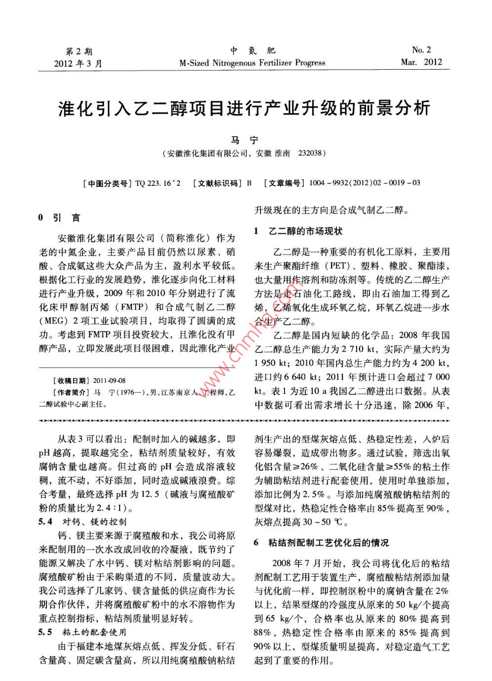 第2期中氮肥2012年3月M-Sized Nitrogenous Fertilizer ProgressMar.2012淮化引入乙二醇項(xiàng)目進(jìn)行產(chǎn)業(yè)升級(jí)的前景分析馬寧(安徽淮化集團(tuán)有限公司,安徽淮南232038)[中圖分類(lèi)號(hào)]TQ23.162[文獻(xiàn)標(biāo)識(shí)碼]B[文章編號(hào)]1004-9932(2012)02-0019-030引言升級(jí)現(xiàn)在的主方向是合成氣制乙二醇。安徽淮化集團(tuán)有限公司(簡(jiǎn)稱(chēng)淮化)作為1乙二醇的市場(chǎng)現(xiàn)狀老的中氮企業(yè),主要產(chǎn)品目前仍然以尿素、硝乙二醇是一種重要的有機(jī)化工原料,主要用酸、合成氨這些大眾產(chǎn)品為主,盈利水平較低。來(lái)生產(chǎn)聚酯纖維(PET)、塑料、橡膠、聚酯漆,根據(jù)化工行業(yè)的發(fā)展趨勢(shì),淮化逐步向化工材料也大量用作溶劑和防凍劑等。傳統(tǒng)的乙二醇生產(chǎn)進(jìn)行產(chǎn)業(yè)升級(jí),2009年和2010年分別進(jìn)行了流方法是走石油化工路線,即由石油加工得到乙化床甲醇制丙烯(FMTP)和合成氣制乙二醇烯,乙烯氧化生成環(huán)氧乙烷,環(huán)氧乙烷進(jìn)一步水(MEG)2項(xiàng)工業(yè)試驗(yàn)項(xiàng)目,均取得了圓滿的成合生產(chǎn)乙二醇。功??紤]到FMTP項(xiàng)目投資較大,且淮化沒(méi)有甲乙二醇是國(guó)內(nèi)短缺的化學(xué)品:2008年我國(guó)醇產(chǎn)品,立即發(fā)展此項(xiàng)目很困難,因此淮化產(chǎn)業(yè)乙二醇總生產(chǎn)能力為2710kt,實(shí)際產(chǎn)量大約為1950kt;2010年國(guó)內(nèi)總生產(chǎn)能力約為4200kt[收稿日期]201140908進(jìn)口約6640kt;2011年預(yù)計(jì)進(jìn)口會(huì)超過(guò)7000作者簡(jiǎn)介]馬寧(1976—),男,江蘇南京人,工程師,乙kt。表1為近10a我國(guó)乙二醇進(jìn)出口數(shù)據(jù)。從表二醇試驗(yàn)中心副主任。中數(shù)據(jù)可看出需求增長(zhǎng)十分迅速,除2006年,從表3可以看出:配制時(shí)加入的堿越多,即劑生產(chǎn)出的型煤灰熔點(diǎn)低、熱穩(wěn)定性差,入爐后pH越高,提取越完全,粘結(jié)劑質(zhì)量較好,有效容易爆裂,造成帶出物多。通過(guò)試驗(yàn),篩選出氧腐鈉含量也越高。但過(guò)高的pH會(huì)造成溶液較化鋁含量≥26%、二氧化硅含量≥55%的粘土作稠,流不動(dòng),不好添加,同時(shí)造成堿液浪費(fèi)。綜為輔助粘結(jié)劑進(jìn)行配套使用,使用時(shí)單獨(dú)添加,合考量,最終選擇pH為12.5(堿液與腐殖酸礦添加比例為2.5%。與添加純腐殖酸鈉粘結(jié)劑的粉的質(zhì)量比為24:1)。型煤對(duì)比,熱穩(wěn)定性合格率由85%提高至9%5.4對(duì)鈣、鎂的控制灰熔點(diǎn)提高30~50℃鈣、鎂主要來(lái)源于腐殖酸和水,我公司將原6粘結(jié)劑配制工藝優(yōu)化后的情況來(lái)配制用的一次水改成回收的冷凝液,既節(jié)約了能源又解決了水中鈣、鎂對(duì)粘結(jié)劑影響的問(wèn)題。2008年7月開(kāi)始,我公司將優(yōu)化后的粘結(jié)腐殖酸礦粉由于采購(gòu)渠道的不同,質(zhì)量波動(dòng)大。劑配制工藝用于裝置生產(chǎn),腐殖酸粘結(jié)劑添加量我公司選擇了幾家鈣、鎂含量低的供應(yīng)商作為長(zhǎng)與優(yōu)化前一樣,即控制漚粉中的腐鈉含量在2%期合作伙伴,并將腐殖酸礦粉中的水不溶物作為以上,結(jié)果型煤的冷強(qiáng)度從原來(lái)的50kg/個(gè)提高重點(diǎn)控制指標(biāo),粘結(jié)劑質(zhì)量明顯好轉(zhuǎn)。到65kg/個(gè),合格率也從原來(lái)的80%提高到5.5粘土的配套使用88%,熱穩(wěn)定性合格率由原來(lái)的85%提髙到由于福建本地煤灰熔點(diǎn)低、揮發(fā)分低、矸石90%以上,型煤質(zhì)量明顯提高,對(duì)穩(wěn)定造氣工藝含量高、固定碳含量高,所以用純腐殖酸鈉粘結(jié)起到了重要的作用。20中氮第2期其他年份進(jìn)口增長(zhǎng)均超過(guò)10%。的檢測(cè)。表1近10a國(guó)內(nèi)乙二醇進(jìn)出口數(shù)據(jù)kt(2)淮化現(xiàn)有裝置能力為合成氨480kU/a、年份進(jìn)口量出口量硝酸400ka、空分76000m3/h,可以提供充2001597足的H2、CO、O2、NO供乙二醇生產(chǎn)。由于焦32化、老合成等裝置已停產(chǎn)拆除,有足夠的場(chǎng)地建20032519設(shè)新項(xiàng)目,可減少規(guī)劃、征地程序的辦理時(shí)間,3391同時(shí)巳有公用工程也基本能滿足需要。(3)淮化淘汰部分氮肥產(chǎn)能,升級(jí)成乙二醇產(chǎn)品,利用的是現(xiàn)有熱電、空分、氣化、變換、凈化等裝置,可以較新建乙二醇裝置的企業(yè)5216減少2/3的投資,建設(shè)周期也可縮短一半,先發(fā)0106646優(yōu)勢(shì)更明顯。(4)采用合成氣制乙二醇工藝流程,淮化從2010年至今,乙二醇的市場(chǎng)價(jià)格一直在現(xiàn)有的合成氨、甲胺、DMF裝置流程與其非常6000~10000元/t波動(dòng)。傳統(tǒng)生產(chǎn)工藝由于原相似,有大量實(shí)踐經(jīng)驗(yàn),管理及操作人員開(kāi)展工料成本和能耗較高,實(shí)際盈利能力并不強(qiáng)。而準(zhǔn)作有業(yè)務(wù)基礎(chǔ),這在千噸級(jí)試驗(yàn)裝置上已證明了化煤制乙二醇工業(yè)試驗(yàn)項(xiàng)目的實(shí)際原料成本低于這一點(diǎn)。4000元/t,與傳統(tǒng)工藝相比有明顯優(yōu)勢(shì)。4工藝流程設(shè)想2淮化發(fā)展乙二醇項(xiàng)目的必要性利用淮化已有的180k/a合成氨裝置的德土(1)淮化現(xiàn)有的產(chǎn)品硝酸、尿素等盈利能古氣化、變換、NHD凈化系統(tǒng),新增制氧、變力低,同時(shí)由于高能