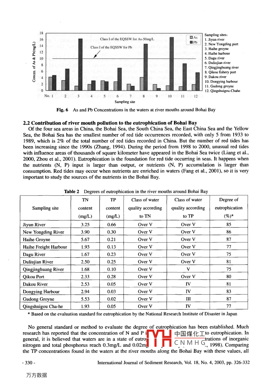 Technical NotesWATER POLLUTION IN THE RIVER MOUTHS AROUND BOHAI BAYCheng LIu', Zhao-Yin WANGI.2 and Yun HE'ABSTRACTTwelve water samples were collcted and analyzed. The samples were taken from the rivermouths around Bohai Bay including the Jiyun, New Yongding, Haihe, Dagu, Duliujian,Qingjinghuang, Qikou, Dakou, and Yellow Rivers, and tested for concentrations of heavy metals,arsenic, total nitrogen (TN) and total phosphorus (TP). The results show that the river mouths arepolluted and the water quality exceeds Class V of the Environmental Quality Standard for SurfaceWater (EQSSW). The main pollutants are Hg, nitrogen (N) and phosphorus (P). The concentrationsof the other pollutants are within Class II of the Standard. The Hg content in the Haihe River mouthis now 10 times higher than it was 20 years ago, indicating that the accelerating water pollution hasreached an alarming level. The high concentrations of N and P cause eutrophication of the waters.Analysis indicates that the terrestrial pollutants and nutrients are the main cause of frequentlyoccurring red tides in the Bohai Sea.Key Words: River mouth, Water quality, Pollution, Red tide, Bohai Bay1 INTRODUCTIONBohai Bay is in the northwest part of the Bohai Sea. Many large cities and industrial hubs are locatedaround the bay, including Beijing, Tianjin, Tangshan, Cangzhou, Huanghua, Binzhou and Dongying. Thearea has experienced quick economic development and urbanization and has become one of China'spolitical, economic and cultural centers. The rapid development and corresponding human activities havehad severe influences on the water environment. Recent investigations show that a large part of thecoastal waters of Bohai Bay have been polluted with concentrations of pollutants exceeding Class II ofthe Sea Water Quality Standard (GB 3097-1997) of China (Zhao et al., 2000). The pollution hasdeteriorated the ecology and reduced biodiversity of the waters. From 1983 to 1993, the number of fishspecies decreased from 85 to 74 in the estuary (Qi et al., 2000). The pollutants mainly originate inland,and are transported by the rivers flowing into the bay. These account for 87% of the total pollutants in thebay. Forty rivers carry 95% of the terrestrial-source pollutants and nutrients into the Bohai Bay (Zhao etal, 2000). This paper reports a recent field investigation of the bay and the results of analysis of thesamples taken from the river mouths around the bay.2 WATER QUALITY IN THE RIVER MOUTHS AROUND BOHAI BAYDuring June 6 to 10, 2001, the authors conducted a field investigation at the mouths of the NewYongding, Jiyun, Haihe, Dagu, Dulijian, Qingjinghuang, New Ziya, Nanpai, Dakou, New Zhangwei, .Majia, Tuhai and Yellow Rivers. These are the most important rivers flowing into the Bohai Bay. Twelvewater samples and 24 sediment samples at 19 river mouths were taken (Fig. 1). The water samples wereanalyzed for concentrations of Hg, Cu, Zn, As, Pb, total nitrogen (TN) and total phosphorus (TP) (Liu etal., 2002; Liu et al., 2003).Dr, Asso. Prof, International Research and Training Center on Erosion and Sedimentation, Beijing 100044,China, E-mail: chliu@ iwhr.comProf, Dept. of Hydraulic Engineering, Tsinghua University & International Research and Training Center onErosion and Sedimentation, Beijing, 100084, China, E-m中國煤化工3 China Institute of Water Resources and Hydropower ReseE-mail: he_ yun@ mail.hf.ah.cnfYHCNMH GNote: The manuscript of this paper was received in June 2002.The revised version was received in Nov. 2002.Discussion open until Dec.2004-326-Intermational Journal of Sediment Research, Vol. 18, No. 4, 2003, pp. 326-332Nw YOyonpdingRiveSampling SitesQTianjin 1New YongdingQikou PortRiverKQul5Jiyun RiverNanpai RiverHuanghua HarbourPortHaihe River6Dakou River11mouth groyneKeNZiya Rives 12Bohai BayDredged sedimentNew Zhangwei Riverof Haie....Tianjin Freight8Majia River16Harbour9Tuhai River,17mouth182Dagu RiverDiaokou RiverDuliujian RiverDongying HarbourFerw/zhangwci River20 e10Dredged sediment 22Gudong groyneof DuliujianQingjinghuang23Qingshuigou-ChaheRiver (Yellow River)Dongying, I1New Ziya RiverQingshuigou River(Yellow River)Fig. 1 Map of Bohai Bay and surrounding area2.1 Water Quality and the Main PollutantsThe water quality was evaluated by employing China's Environmental Quality Standard for SurfaceWater (GHZB 1-1999) (EQSSW). Table 1 lists the classes of water quality at the sampling sites. All theriver mouths were seriously polluted: the water qualities at 8 of the 12 sampling sites exceeded Class V,and the main pollutants were P and Hg. A comparison of the pollutants found in the water samples withthe eutrophication index showed that the N content at these river mouths was also very high. The mainpollutants in the river mouths between Jiyun to Qikou Port were N and P, and those near the Yellow Rivermouth were N and Hg.Table 1 Classes of water quality and the main pollutants in the waters of the sampling sitesSampling siteClass of water qualityMain pollutantsOver VHg, P, NNew Yongding RiverP, NGroyne of Haihe River mouthHg, P,NFreight harbour of Haihe River mouthI\Duliyjian RiverQingjinghuang RiverINHg, NGudong GroyneQingshuigou Cha-he of the Yellow River中國煤化工Mercury (Hg): Fig. 2 presents the Hg content in the 12 wTYHC N M H G. Higher valuesappear near the Haihe and the Yellow River mouths. The Hg content in the waters at Dongying HarbourInternational Jourmal of Sediment Research, Vol. 18, No.4, 2003, pp. 326-332-327.and Gudong Groyne was as high as 2.59 μg/L and 1.71 ug/L respectively, much higher than 1.0 μg/L,which is Class V of the EQSSW. The Hg content between the Haihe and Duliujian river mouths rangedform 0.71 to 1.13 μg/L, which shows relatively higher values. Compared with the data of the 1980s (EPAof China, 1990A; EPA of China, 1990B), the Hg content in the waters near the Haihe river mouth is nowroughly 10 times that of 20 years ago. This reflects that the accelerating water pollution, which is cause
