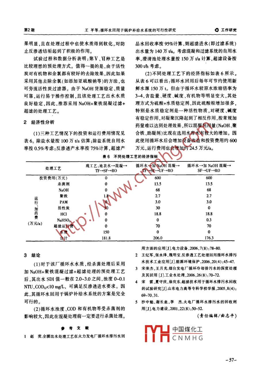 Vol.28,No.2中國資源綜合利用2010年2月China Resources Comprehensive Utilization。工作研兗循環(huán)水回用于鍋爐補給水系統(tǒng)的可行性研究王平,何彩燕,劉朝輝(河北省電力研究院,石家莊050021)摘要:介紹了萊電廠的水資源現(xiàn)狀。通過現(xiàn)場試驗,從技術、經(jīng)濟、可操作性等方面進行了分析論證。試驗結果表明:循環(huán)水回用于鍋爐補給水是完全可行的。關鍵詞:火電廠;循環(huán)水;回收利用;鍋爐補給水中團分類號:X703文獻標識碼:A文章編號:1008- -9500(2010)02- 0055-03Research on The Feasibility of Recycled Circulating Water atBoiler Feed Water SystemWang Ping, He Caiyan, Liu Chaohui(Hebei Elecric Power Reseach Instiute , Shijiazhuang 050021, China)Abstract:The present condition of water resources in a power plant is introduced. Through the experimentson-the- spot to venify their technologies,economic efficiency and operability. The results show that it is feasibleto reuse circulating water as make- up water of Boiler Feed Water.Keywords:power plant; circulating water,reuse; boiler feed water水是最寶貴的自然資源,是人類生存所必需藝,我們針對該廠循環(huán)水水質(zhì)先后進行了試驗室小的。水資源的保護、利用和研究已成為當今社會所型試驗和預處理系統(tǒng)的動態(tài)試驗研究。研究結果表面臨的最主要課題之一。某電廠一期工程裝機容量明:通過加入軟化劑等藥劑進行混凝、澄清和過濾2x600 MW,兩臺機組的冷卻方式均為敞開式循環(huán)處理后其水質(zhì)的SDI難以達到4.0以下,若不進行冷卻系統(tǒng)。循環(huán)冷卻水的補充水源為西大樣水庫工藝改進,在現(xiàn)有設備基礎上采用循環(huán)水排污水作水,循環(huán)水處理采用加酸(H2SO,)-加水質(zhì)穩(wěn)定劑的為鍋爐補給水的水源具有較大的風險性,將對后續(xù)聯(lián)合處理方式,運行濃縮倍率控制在3.0~4.0。鍋爐脫鹽設備造成--定的影響。因此,經(jīng)分析調(diào)研,我們補給水處理系統(tǒng)采用機械澄清凝聚過濾、反滲透、進行了改變加藥品種、劑量及增加超濾裝置等預處- -級除鹽+混床的處理工藝。一期工程設計循環(huán)水理方案的研究。排放水為化學補給水水源,當循環(huán)水系統(tǒng)排放水經(jīng)1試驗預處理后水質(zhì)不能滿足后續(xù)處理反滲透系統(tǒng)進水要求時,或因其它原因無法使用循環(huán)水系統(tǒng)排放水1.1 動態(tài)混凝處理工藝的選擇時,使用水庫蓄水作為備用水源。1.1.1 聚鐵工藝由于國內(nèi)在火力發(fā)電廠循環(huán)水排污水綜合利聚鐵處理工藝控制參數(shù)見表1。由試驗結果可用方面還處于探索和研究階段,部分已投運的以循知:在最佳的聚鐵控制工藝條件下,循環(huán)水排污水環(huán)水作為鍋爐補給水水源的電廠其反滲透系統(tǒng)運經(jīng)上述處理工藝的過濾后,其出水濁度.pH、COD、行都存在很多問題。因此,為了安全起見,該廠鍋爐殘余氯和全鐵均能滿足反滲透進水指標,但出水補給水系統(tǒng)- .直采用水庫水作為生產(chǎn)水源。目前,SDI一直徘徊在5.0左右,不能滿足反滲透進水對為了滿足二期工程的建設需要,二期工程化學補給SDI的要求。水水源必須使用一期工程機組的循環(huán)水排污水。1.1.2聚鋁混凝工藝根據(jù)工程建設要求,為了確定更好的處理工中國煤化工空制參數(shù)見表2。MHCNMHG收稿日期:2009-12-17作者簡介:王平(1974-),男 ,陜西鳳翔人,工程師,從事水處理研究及火電機組的調(diào)整試驗等工作。-55-。工作研究中國資源綜合利用第2期表1聚鐵處理工藝參數(shù)也很- -般,因此不推薦使用該工藝。項目混凝劑種類助凝劑種類pH值.加堿量表4優(yōu)化后的處理工藝參數(shù)工藝序號劑址 50mge/L劑量1.5 mg/L(mmol/L)項工藝簡述.控制條件及加藥聚鐵PAM11.0~11.5 10工藝序號.種類、添加量(mg/L)10.5~10.8 7I 循環(huán)水一+SP→UF→+RO不加藥試驗表明:聚合氯化鋁遠不及聚鐵,即使在加藥量I循環(huán)水- +石灰混凝- +聚鐵30;PAM1.5;TF-→+SF-→UF→RO石灰:300到100mg/L時,循環(huán)水排污水處理后,其出水濁度.COD等仍達不到理想指標。且其出水SDI一直循環(huán)水→驟鋁混凝-→聚鋁100;PAM2.0TF- +SF-→UF-→RO大于6.0,甚至出現(xiàn)測不出的現(xiàn)象。循環(huán)水→聚鋁直流混凝- +聚鋁15;PAM1.0表2聚鋁混凝工藝參數(shù)TF- →SF→UF-→RO項目混凝劑種類 助凝 劑種類加酸量循環(huán)水→加NaOH 混凝-→聚 鐵50;PAM1.5;工藝序號劑量100 mg/L劑量2.0 mg/LpH值(mmo/L)TF- +SF-→UP→+ROpH>10.5聚鋁8.8循環(huán)水→NaOH混凝-→聚鐵50;PAM1.5;V7.52.0SF→UF→R01.1.3石灰處理工藝表5優(yōu)化工藝的試驗結果經(jīng)計算和試驗,確定了石灰處理工藝的最佳控項目濁度HCODm余氟全鐵硬度堿度SDI制條件和加藥量如表3。試驗結果表明:石灰處理要求日(NTU)(mg/L)(mg/L)(mg/L)(mmol/L) (mmoUL)試驗過程的出水無論從濁度還是效果都要優(yōu)于氫指標≤0.26.5-8≤2≤0.1 <0.05- <4.氧化鈉,這一點由SDI的測定就可得到證明和體原水-22.3 -8.7 ~3.3 0.25 0.1811.2 1.0/5.8現(xiàn)。但是,試驗也發(fā)現(xiàn):與加氫氧化鈉處理- -樣,出0.168.7 1.8 0.15 0.0510.25.6 ~2.0I 0.08 7.80.6 0.1 0.027.42.0 ~1.2 .水SDI不穩(wěn)定,其受混凝條件變化的波動較大,而0.17 7.5 1.5 0.1 0.0410.85.2 ~3.0且工業(yè)生產(chǎn)運行需要增加專門的石灰加藥裝置,對IV 0.18 7.6 1.6 0.1 0.0510.95.3 ~3.3石灰加藥量和混凝條件的要求比較嚴格,不便于運. V 0.12 7.5 0.9 0.1 0.033.4.3 ~2.0行控制和操作。0.15 0.043.6_ -2.1表