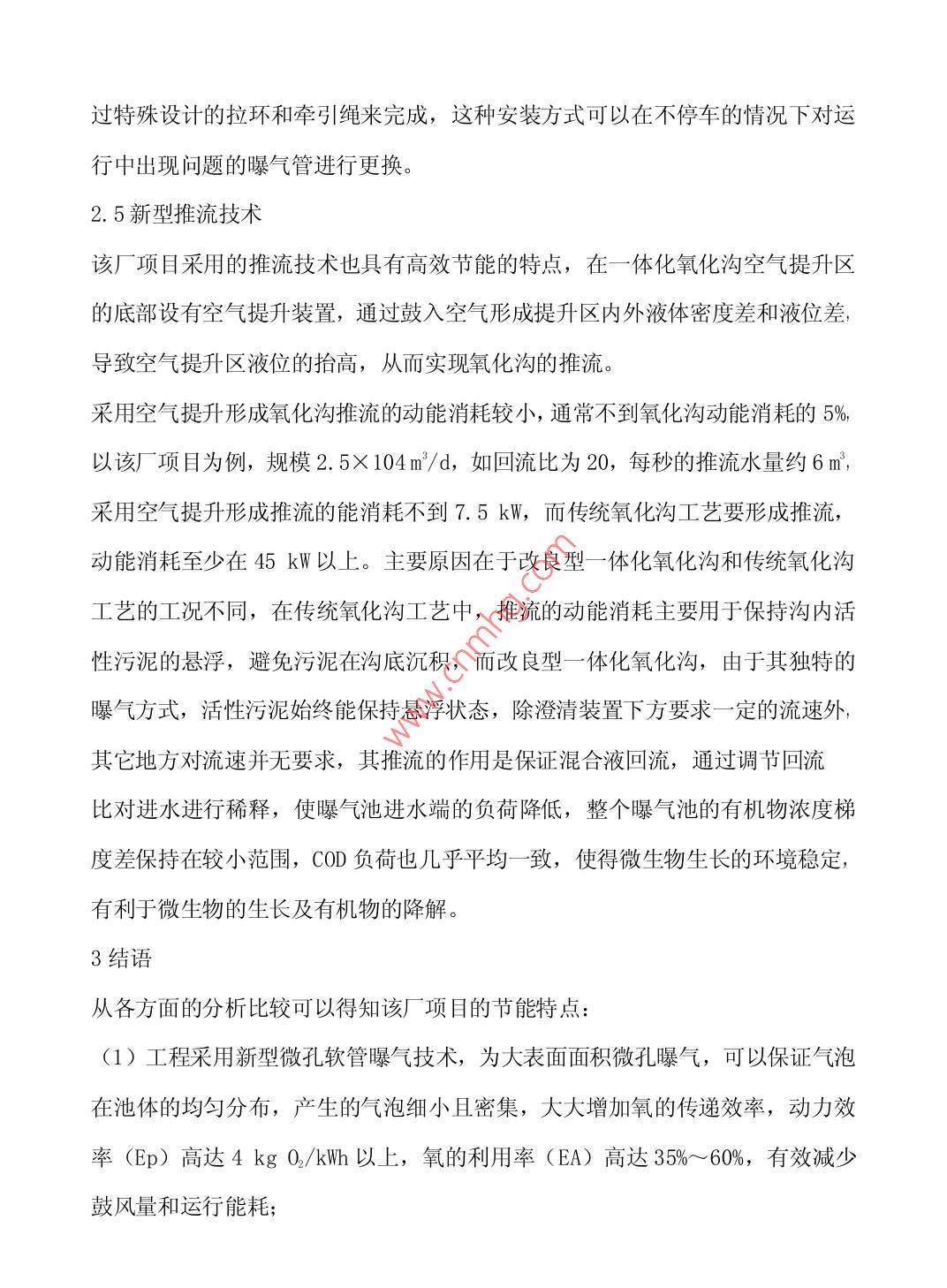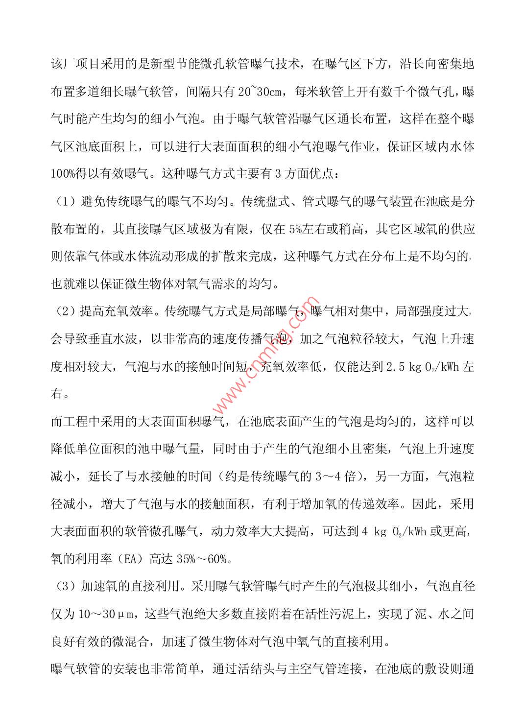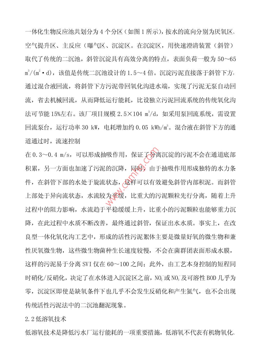 綜述某污水處理廠污水處理技術(shù)的應(yīng)用衛(wèi)俊良許宜平1江蘇鵝鵬環(huán)境工程設(shè)計(jì)院2江蘇中超環(huán)保有限公司江蘇宜興214205摘要:我國(guó)很多地區(qū)的地表水以及淺層地下水都遭到工業(yè)污染,加強(qiáng)我國(guó)污水處理事業(yè)建設(shè),提高污水處理技術(shù)是緩解我國(guó)水資源困境的必由之路。本文對(duì)某污水處理廠的處理工藝進(jìn)行了分析,并闡述了污水處理的相關(guān)新技術(shù)關(guān)鍵詞:污水處理;一體化;低溶氧;同時(shí)硝化/反硝化;推流Abstract: China in many parts of the surface water and groundwater were industrial pollution, strengtheningour country sewage treatment enterprise construction, improving sewage treatment technology of waterresource in China is to alleviate the only way of dilemma. In this paper, the processing technology of theewage treatment plant was analyzed and expounds some new technology of sewage treatment.Keywords: sewage treatment Integration; Low dissolved oxygen; At the same time nitrification/denitrification;Push flow中圖分類號(hào):U649+2文獻(xiàn)標(biāo)識(shí)碼:A文章編號(hào):前言污水是工業(yè)發(fā)展以及人類濫用水資源的產(chǎn)物,隨著水資源的日益枯竭以及污水排放量的日益增多,水質(zhì)污染超越了水體的自凈能力。如果不及時(shí)處理污水,不但會(huì)造成巨大的經(jīng)濟(jì)損失,污水還會(huì)進(jìn)入土壤,通過(guò)食物鏈來(lái)影響我們的身體健康。同時(shí)在污水處理過(guò)程中如何應(yīng)用多項(xiàng)低能耗污水處理技術(shù),大大減少污水處理廠的運(yùn)行費(fèi)用,并保證良好的出水水質(zhì),使投資省、占地面積小、運(yùn)行費(fèi)用低、維護(hù)管理方便,也是我國(guó)目前污水處理要研究的問(wèn)題。1污水處理廠項(xiàng)目概況某污水處理廠,配套管網(wǎng)40.93km,以及中途提升泵站1座。污水處理廠尾水排放執(zhí)行《城鎮(zhèn)污水廠污染物排放標(biāo)準(zhǔn)》(GB19918-2002)一級(jí)標(biāo)準(zhǔn)的B標(biāo)準(zhǔn),設(shè)計(jì)進(jìn)、出水水質(zhì)及要求處理程度見表1表1污水處理廠進(jìn)、出水水質(zhì)及處理程度水質(zhì)OD SS NH-NTN匚設(shè)計(jì)進(jìn)水水質(zhì)/(mg·L)40042004250304040設(shè)計(jì)出水水質(zhì)/(mg…L)6020208(15)20:.5處理程度/%9273(50)5污水處理工藝采用改良型一體化氧化溝工藝,工藝流程見圖1?;旌弦夯亓鞴娘L(fēng)機(jī)兇曝氣區(qū)改良型一體化氧化溝沉淀區(qū)消毒池一出水達(dá)標(biāo)排放預(yù)處理][剩余污泥}濃縮壓濾一泥餅外運(yùn)圖1污水處理工藝流程圖2低能耗污水處理技術(shù)的應(yīng)用為貫徹節(jié)能理念并保證出水水質(zhì),工程中主要應(yīng)用了一體化技術(shù)、低溶氧技術(shù)、同時(shí)硝化/反硝化技術(shù)、微孔軟管曝氣技術(shù)、新型推流技術(shù)等低能耗污水處理技術(shù)2.1一體化技術(shù)體化氧化溝技術(shù)源于上世紀(jì)50年代的荷蘭(沃紹登 Voorschoten),其特點(diǎn)是用合建的生物反應(yīng)池取代傳統(tǒng)氧化溝工藝中的氧化溝、二沉池、污泥回流泵房等處理構(gòu)筑物,將初沉池、水解酸化池、厭氧池、曝氣池以及二沉池的功能集于一身,使傳統(tǒng)工藝的多個(gè)池體簡(jiǎn)化為一個(gè)綜合池體,在其中高效完成碳源氧化、硝化、反硝化、磷的去除以及處理水的固液分離,前段的預(yù)處理及后段的消毒和污泥處置與傳統(tǒng)工藝基本一致。國(guó)內(nèi)于上世紀(jì)90年代初引進(jìn)該技術(shù),目前運(yùn)行廠已超過(guò)10余座。一體化技術(shù)最顯著的特征是不設(shè)獨(dú)立的污泥回流系統(tǒng)。按功能需要,該項(xiàng)目的體化生物反應(yīng)池共劃分為4個(gè)分區(qū)(如圖1所示),按水的流向分別為厭氧區(qū)、空氣提升區(qū)、主反應(yīng)(曝氣區(qū)、沉淀區(qū)。在沉淀區(qū),用快速澄清裝置(斜管)取代了傳統(tǒng)的二沉池,斜管沉淀具有高效分離的特點(diǎn),表面負(fù)荷一般為50~65m/(m·d),該值是傳統(tǒng)二沉池設(shè)計(jì)的1.5~4倍。沉淀污泥直接落于斜管下方,通過(guò)混合液回流,將斜管下方污泥帶回氧化溝進(jìn)水端,實(shí)現(xiàn)了污泥無(wú)泵自動(dòng)回流,省去杋械回流,從而降低運(yùn)行能耗,比設(shè)獨(dú)立污泥回流系統(tǒng)的傳統(tǒng)氧化溝法可節(jié)能15%左右。該廠項(xiàng)目規(guī)模2.5×104m/d,如采用泵回流系統(tǒng),需設(shè)置回流泵臺(tái),運(yùn)行功率30kW,電耗增加約0.05kW/m3?;旌弦涸谛惫芟路降耐ǖ劳ㄟ^(guò)時(shí),流速控制在0.3~0.4m/s,可以形成抽吸作用,保證了分離沉淀的污泥不會(huì)在通道底部積累,另一方面也加速了污泥的沉降,同時(shí),由于抽吸作用形成獨(dú)特的水力條件,在斜管下部的水處于旋流狀態(tài),這樣可以有效避免斜管內(nèi)部積泥。而斜管上部處于異向流狀態(tài),水流較為平緩,比重大的污泥顆粒先行分離,隨著上升過(guò)程中的阻力影響,水流趨于平穩(wěn)緩緩上升,比重小的污泥顆粒也能夠重力沉降,在此過(guò)程中水質(zhì)不斷改善,最終通過(guò)斜管,保證出水水質(zhì)。事實(shí)上,在改良型一體化氧化溝工藝中,形成的活性污泥絮體主要是微量好氧的微生物和兼性厭氧微生物,這些微生物菌種生長(zhǎng)速度較慢,不會(huì)在菌群團(tuán)表面形成水膜,這樣的污泥易于分離SVI僅在60~100之間;此外,