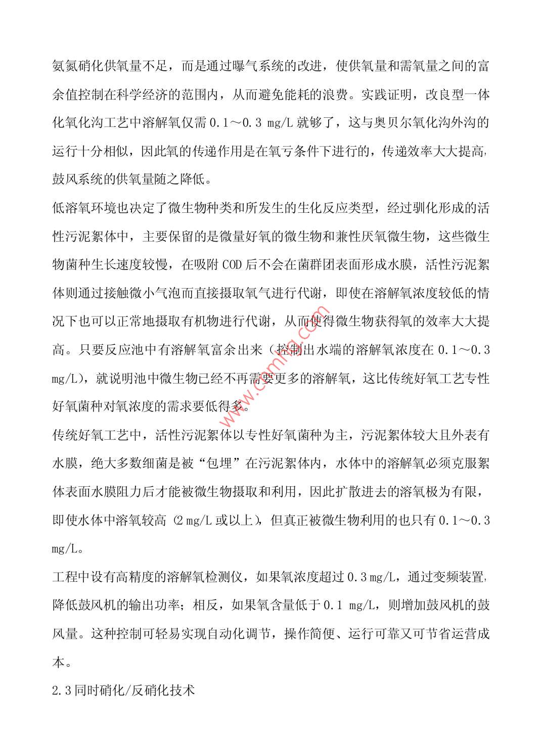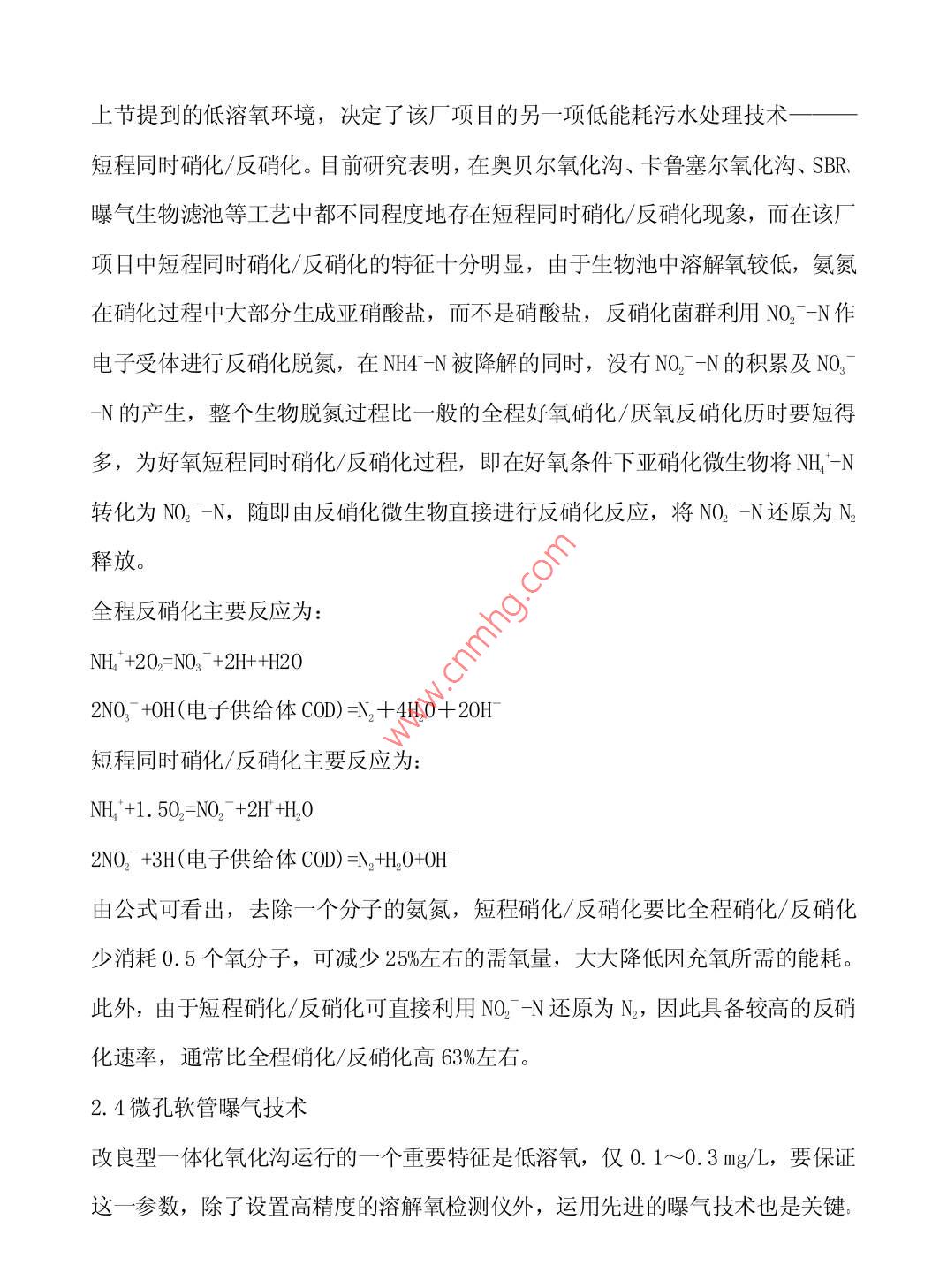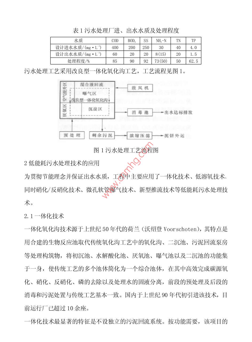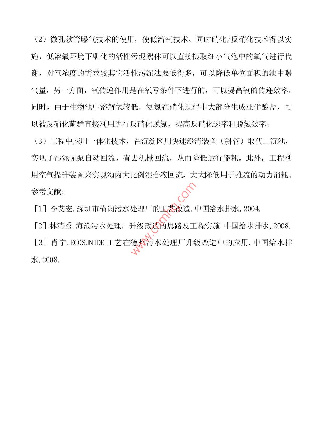 綜述某污水處理廠污水處理技術(shù)的應(yīng)用衛(wèi)俊良許宜平1江蘇鵝鵬環(huán)境工程設(shè)計(jì)院2江蘇中超環(huán)保有限公司江蘇宜興214205摘要:我國(guó)很多地區(qū)的地表水以及淺層地下水都遭到工業(yè)污染,加強(qiáng)我國(guó)污水處理事業(yè)建設(shè),提高污水處理技術(shù)是緩解我國(guó)水資源困境的必由之路。本文對(duì)某污水處理廠的處理工藝進(jìn)行了分析,并闡述了污水處理的相關(guān)新技術(shù)關(guān)鍵詞:污水處理;一體化;低溶氧;同時(shí)硝化/反硝化;推流Abstract: China in many parts of the surface water and groundwater were industrial pollution, strengtheningour country sewage treatment enterprise construction, improving sewage treatment technology of waterresource in China is to alleviate the only way of dilemma. In this paper, the processing technology of theewage treatment plant was analyzed and expounds some new technology of sewage treatment.Keywords: sewage treatment Integration; Low dissolved oxygen; At the same time nitrification/denitrification;Push flow中圖分類號(hào):U649+2文獻(xiàn)標(biāo)識(shí)碼:A文章編號(hào):前言污水是工業(yè)發(fā)展以及人類濫用水資源的產(chǎn)物,隨著水資源的日益枯竭以及污水排放量的日益增多,水質(zhì)污染超越了水體的自凈能力。如果不及時(shí)處理污水,不但會(huì)造成巨大的經(jīng)濟(jì)損失,污水還會(huì)進(jìn)入土壤,通過(guò)食物鏈來(lái)影響我們的身體健康。同時(shí)在污水處理過(guò)程中如何應(yīng)用多項(xiàng)低能耗污水處理技術(shù),大大減少污水處理廠的運(yùn)行費(fèi)用,并保證良好的出水水質(zhì),使投資省、占地面積小、運(yùn)行費(fèi)用低、維護(hù)管理方便,也是我國(guó)目前污水處理要研究的問(wèn)題。1污水處理廠項(xiàng)目概況某污水處理廠,配套管網(wǎng)40.93km,以及中途提升泵站1座。污水處理廠尾水排放執(zhí)行《城鎮(zhèn)污水廠污染物排放標(biāo)準(zhǔn)》(GB19918-2002)一級(jí)標(biāo)準(zhǔn)的B標(biāo)準(zhǔn),設(shè)計(jì)進(jìn)、出水水質(zhì)及要求處理程度見表1表1污水處理廠進(jìn)、出水水質(zhì)及處理程度水質(zhì)OD SS NH-NTN匚設(shè)計(jì)進(jìn)水水質(zhì)/(mg·L)40042004250304040設(shè)計(jì)出水水質(zhì)/(mg…L)6020208(15)20:.5處理程度/%9273(50)5污水處理工藝采用改良型一體化氧化溝工藝,工藝流程見圖1?;旌弦夯亓鞴娘L(fēng)機(jī)兇曝氣區(qū)改良型一體化氧化溝沉淀區(qū)消毒池一出水達(dá)標(biāo)排放預(yù)處理][剩余污泥}濃縮壓濾一泥餅外運(yùn)圖1污水處理工藝流程圖2低能耗污水處理技術(shù)的應(yīng)用為貫徹節(jié)能理念并保證出水水質(zhì),工程中主要應(yīng)用了一體化技術(shù)、低溶氧技術(shù)、同時(shí)硝化/反硝化技術(shù)、微孔軟管曝氣技術(shù)、新型推流技術(shù)等低能耗污水處理技術(shù)2.1一體化技術(shù)體化氧化溝技術(shù)源于上世紀(jì)50年代的荷蘭(沃紹登 Voorschoten),其特點(diǎn)是用合建的生物反應(yīng)池取代傳統(tǒng)氧化溝工藝中的氧化溝、二沉池、污泥回流泵房等處理構(gòu)筑物,將初沉池、水解酸化池、厭氧池、曝氣池以及二沉池的功能集于一身,使傳統(tǒng)工藝的多個(gè)池體簡(jiǎn)化為一個(gè)綜合池體,在其中高效完成碳源氧化、硝化、反硝化、磷的去除以及處理水的固液分離,前段的預(yù)處理及后段的消毒和污泥處置與傳統(tǒng)工藝基本一致。國(guó)內(nèi)于上世紀(jì)90年代初引進(jìn)該技術(shù),目前運(yùn)行廠已超過(guò)10余座。一體化技術(shù)最顯著的特征是不設(shè)獨(dú)立的污泥回流系統(tǒng)。按功能需要,該項(xiàng)目的體化生物反應(yīng)池共劃分為4個(gè)分區(qū)(如圖1所示),按水的流向分別為厭氧區(qū)、空氣提升區(qū)、主反應(yīng)(曝氣區(qū)、沉淀區(qū)。在沉淀區(qū),用快速澄清裝置(斜管)取代了傳統(tǒng)的二沉池,斜管沉淀具有高效分離的特點(diǎn),表面負(fù)荷一般為50~65m/(m·d),該值是傳統(tǒng)二沉池設(shè)計(jì)的1.5~4倍。沉淀污泥直接落于斜管下方,通過(guò)混合液回流,將斜管下方污泥帶回氧化溝進(jìn)水端,實(shí)現(xiàn)了污泥無(wú)泵自動(dòng)回流,省去杋械回流,從而降低運(yùn)行能耗,比設(shè)獨(dú)立污泥回流系統(tǒng)的傳統(tǒng)氧化溝法可節(jié)能15%左右。該廠項(xiàng)目規(guī)模2.5×104m/d,如采用泵回流系統(tǒng),需設(shè)置回流泵臺(tái),運(yùn)行功率30kW,電耗增加約0.05kW/m3?;旌弦涸谛惫芟路降耐ǖ劳ㄟ^(guò)時(shí),流速控制在0.3~0.4m/s,可以形成抽吸作用,保證了分離沉淀的污泥不會(huì)在通道底部積累,另一方面也加速了污泥的沉降,同時(shí),由于抽吸作用形成獨(dú)特的水力條件,在斜管下部的水處于旋流狀態(tài),這樣可以有效避免斜管內(nèi)部積泥。而斜管上部處于異向流狀態(tài),水流較為平緩,比重大的污泥顆粒先行分離,隨著上升過(guò)程中的阻力影響,水流趨于平穩(wěn)緩緩上升,比重小的污泥顆粒也能夠重力沉降,在此過(guò)程中水質(zhì)不斷改善,最終通過(guò)斜管,保證出水水質(zhì)。事實(shí)上,在改良型一體化氧化溝工藝中,形成的活性污泥絮體主要是微量好氧的微生物和兼性厭氧微生物,這些微生物菌種生長(zhǎng)速度較慢,不會(huì)在菌群團(tuán)表面形成水膜,這樣的污泥易于分離SVI僅在60~100之間;此外,