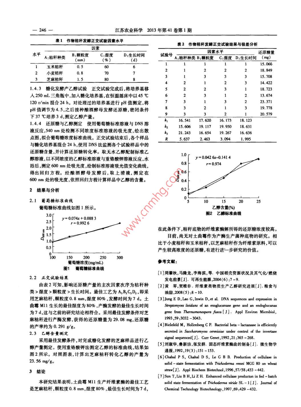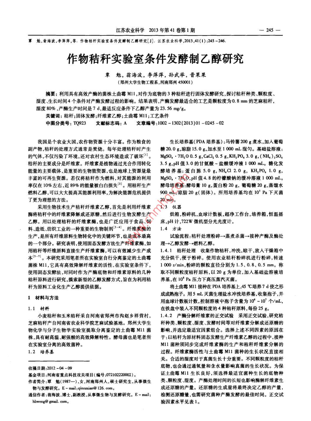 江蘇農(nóng)業(yè)科學(xué)2013年第41卷第1期245勉,翁海波,李萍萍,等.作物秸稈實(shí)驗(yàn)室條件發(fā)酵制乙醇研究[J].江蘇農(nóng)業(yè)科學(xué),2013,41(1):245-246作物秸稈實(shí)驗(yàn)室條件發(fā)酵制乙醇研究覃勉,翁海波,李萍萍,孫武舉,晉果果(鄭州大學(xué)生物工程系河南鄭州450001)摘要:利用具有高效產(chǎn)酶的菌株土曲霉M對(duì)作為底物的3種秸稈進(jìn)行固體發(fā)酵研究探討秸稈種類(lèi)顆粒度、濕度、生長(zhǎng)時(shí)間4個(gè)條件對(duì)產(chǎn)酶發(fā)酵過(guò)程的影響。結(jié)果表明,產(chǎn)酶發(fā)酵最適合的工藝是顆粒度為0.8mm的芝麻秸稈,濕度80%,產(chǎn)酶生產(chǎn)時(shí)間是7d,最適反應(yīng)條件下乙醇產(chǎn)量為23.56mg/g關(guān)鍵詞:秸稈;固體發(fā)酵;纖維素乙醇;土曲霉Ml1;工藝條件中圖分類(lèi)號(hào):TQ923文獻(xiàn)標(biāo)志碼:A文章編號(hào):1002-1302(2013)01-0245-02我國(guó)是個(gè)農(nóng)業(yè)大國(guó),農(nóng)作物資源十分豐富。作為糧食的生長(zhǎng)培養(yǎng)基(PDA培養(yǎng)基):馬鈴薯200g煮水,加入葡萄副產(chǎn)物,秸稈的處理方式通常是焚燒。每年處理秸稈時(shí)產(chǎn)生糖20.0g瓊脂15.0g,加水至1000mL混勻?;A(chǔ)鹽溶液的氣體,不僅污染了環(huán)境還對(duì)農(nóng)村生態(tài)環(huán)境造成了破壞。MO4·7H2O0.5g,CaCl20.5g,KH2PO43.0g,(NH)2SO秸稈的主要成分是纖維素。纖維素是植物通過(guò)光合作用轉(zhuǎn)化3.5gpH值3.0的甘氨酸-鹽酸緩沖液1000mL。糖化發(fā)能量的主要載體,是重要的生物能資源,也是地球上資源量最酵培養(yǎng)基:蛋白胨5.0g,NH4C12.0g,KH2PO41.0g,豐富的可再生資源。若僅將秸稈作為燃料,對(duì)其能源的利用MgSO4·7H2O,pH值4.8的檸檬酸鈉的緩沖溶液1000mL。率僅在10%左右近89%的能量被白白損失2。用秸稈生產(chǎn)酵母培養(yǎng)基:酵母膏10g,蛋白粉20g,葡萄糖20g,蒸餾水燃料乙醇可以大大提高其能源利用率,為解決能源危機(jī)提供90mL,瓊脂20g(固體)。所用培養(yǎng)基均在10Pa下滅菌了更為理想的方法。20 mi采用生物技術(shù)生產(chǎn)秸稈纖維素乙醇,首先是利用纖維素1.3儀器酶將秸稈中的纖維素降解成還原糖,然后進(jìn)行生物發(fā)酵生產(chǎn)烘箱,粉碎機(jī),血球計(jì)數(shù)板,超凈工作臺(tái),培養(yǎng)箱,恒溫?fù)u乙醇。用以處理秸稈的纖維素酶,也是廣泛應(yīng)用于食品、飼床,pH計(jì),722W微機(jī)型分光光度計(jì)料、造紙紡織工業(yè)的一種重要的生物制劑。纖維素酶的1.4方法生產(chǎn),是所有纖維原料生物轉(zhuǎn)化中的關(guān)鍵環(huán)節(jié),也是成本最高試驗(yàn)流程:秸稈處理粉碎→蒸煮殺菌→接種產(chǎn)酶及酶處的一個(gè)部分。研究表明,使用固態(tài)發(fā)酵方法生產(chǎn)纖維素酶,如理→乙醇發(fā)酵→燃料乙醇用秸稈等纖維原料直接生產(chǎn)纖維素酶,可以有效減少生產(chǎn)成1.4.1秸稈處理收集作物秸稈,沖洗,晾干,放入干燥箱中本。本研究采用筆者所在實(shí)驗(yàn)室自行分離鑒定的土曲霉充分烘干,便于粉碎。使用農(nóng)業(yè)秸稈粉碎機(jī)進(jìn)行粉碎轉(zhuǎn)速菌株M11,它具有高效降解纖維素的活性,在實(shí)驗(yàn)室條件下,1000m/min,粉碎的顆粒直徑分別為1.5、0.8、0.5mm。稱(chēng)使用固態(tài)發(fā)酵法,對(duì)同時(shí)作為產(chǎn)酶底物和纖維素原料的幾種取不同顆粒度秸稈原料,以20g為單位,加入基礎(chǔ)鹽溶液培秸稈原料進(jìn)行研究摸索新型的乙醇發(fā)酵方式旨在為利用秸養(yǎng)基,在10Pa壓力下高壓蒸汽滅菌。稈為原料工業(yè)化生產(chǎn)乙醇提供依據(jù)。將土曲霉Ml接種在PDA培養(yǎng)基上,45℃培養(yǎng)7d使之形1材料與方法成成熟孢子。用5m滅菌生理鹽水沖洗培養(yǎng)基收集孢子,并用血球計(jì)數(shù)板計(jì)數(shù)控制溶液中孢子含量為10-107個(gè)/m,1.1材料在鐵盤(pán)中裝入不同顆粒度的4種秸稈原料,每份25g。小麥秸稈和玉米秸稈采自河南省鄭州市溝趙鄉(xiāng)祥營(yíng)村,1.4.2產(chǎn)酶分解纖維素的正交試驗(yàn)采用正交試驗(yàn)研究秸芝麻秸稈產(chǎn)自河南省農(nóng)業(yè)科學(xué)院芝麻試驗(yàn)基地。鄭州大學(xué)生稈種類(lèi)顆粒度、濕度、發(fā)酵時(shí)間等對(duì)纖維素分解成還原糖的物化學(xué)與分子生物學(xué)實(shí)驗(yàn)室提取分離鑒定的土曲霉M1l菌影響,并選定最適宜因素組合。選擇上述不同因素的原因在株,具有耐高溫耐強(qiáng)酸的高效降解特性。酵母菌也是筆者所于:以秸稈為原材料固態(tài)發(fā)酵生產(chǎn)纖維素乙醇的過(guò)程中接種在實(shí)驗(yàn)室分離的高效菌種。M11菌種須同步完成纖維素酶的生產(chǎn)和秸稈纖維素分解的1.2培養(yǎng)基過(guò)程。纖維素酶活性與土曲霉MIl菌種的生長(zhǎng)狀況直接相關(guān)。合適的濕度對(duì)于真菌生長(zhǎng)十分重要。不同顆粒度的秸稈收稿日期:2012-04-09底物,也會(huì)通過(guò)通氧量和含水量影響真菌的生長(zhǎng)狀況。為?;痦?xiàng)目:河南省重點(diǎn)科技攻關(guān)項(xiàng)目(編號(hào):07210222000)。證土曲霉M1生長(zhǎng)良好,須選擇最適宜菌種生長(zhǎng)的底物種作者簡(jiǎn)介:覃勉(1987-),女,河南鄭州人,碩士研究生,從事微生類(lèi)、顆粒度、濕度。產(chǎn)酶處理時(shí)間的長(zhǎng)短也影響酶解纖維素生物與發(fā)酵研究。E-mail:qinnmian@126.com成還原糖的產(ch