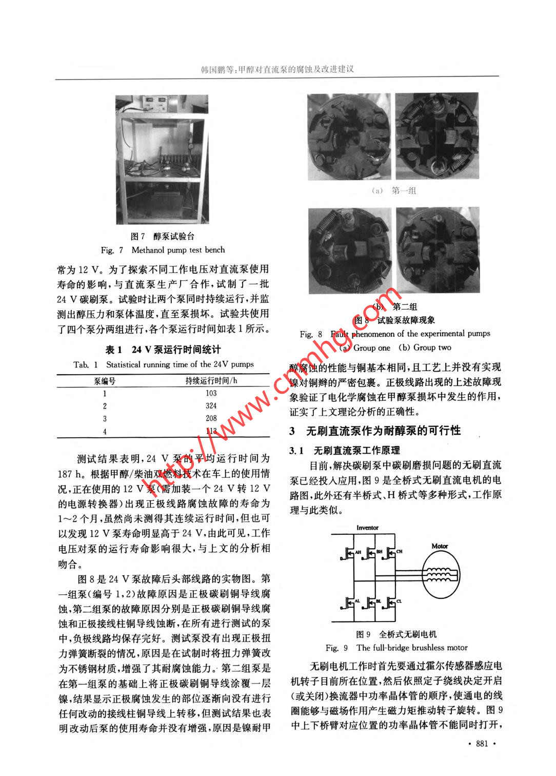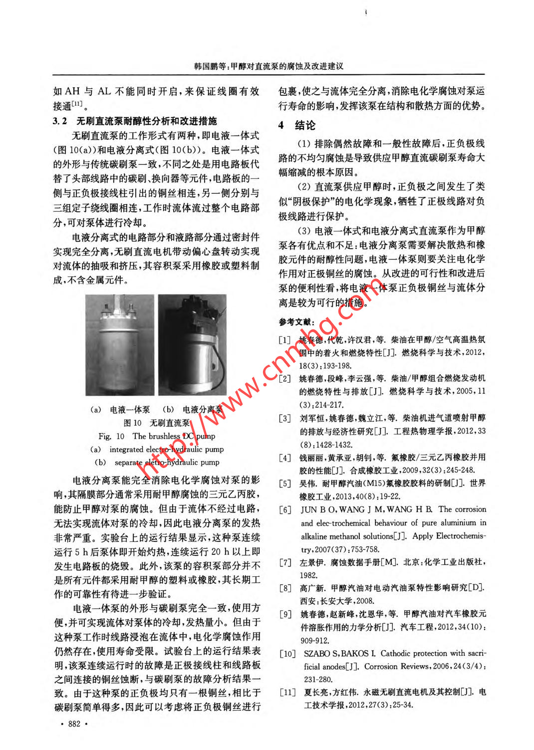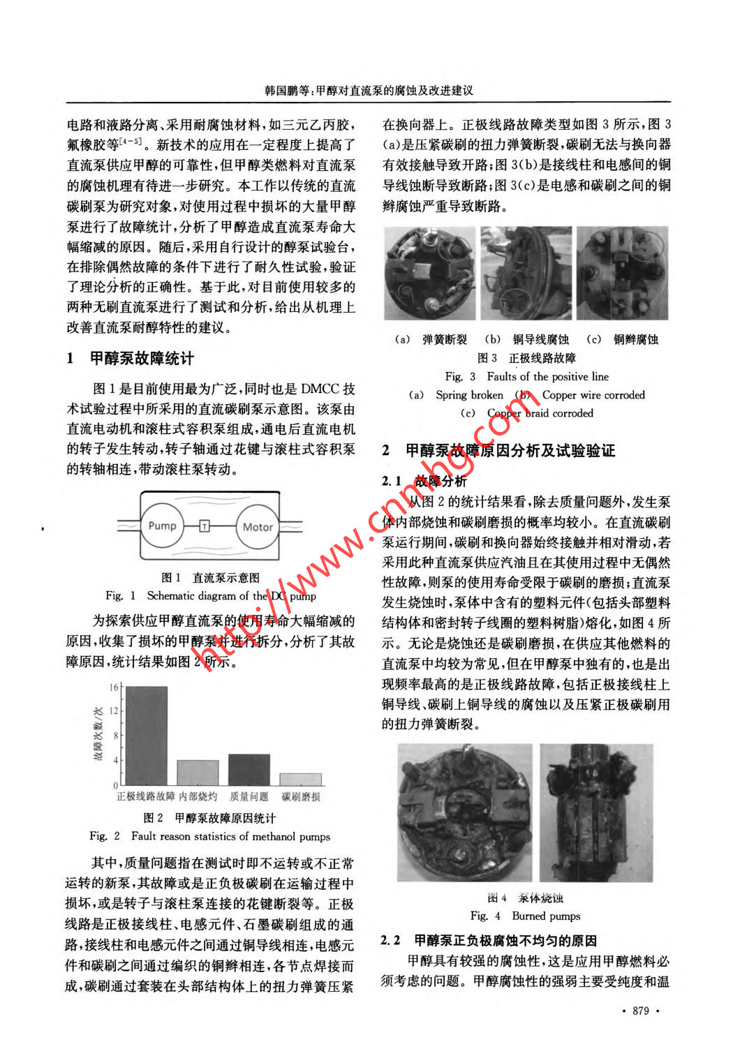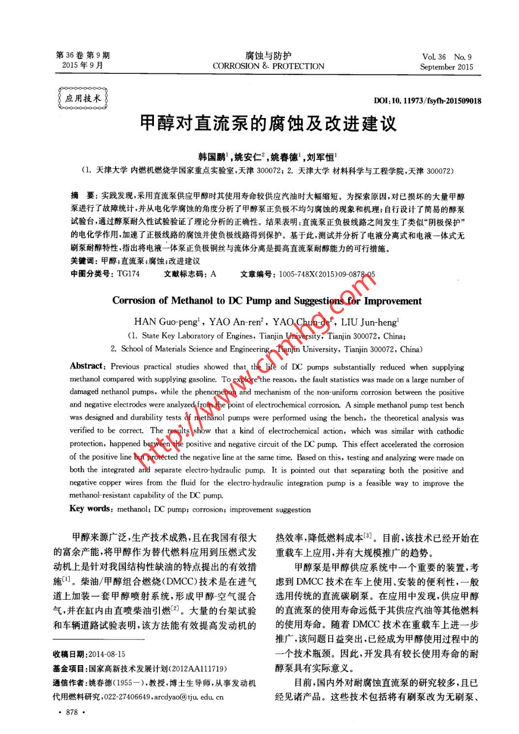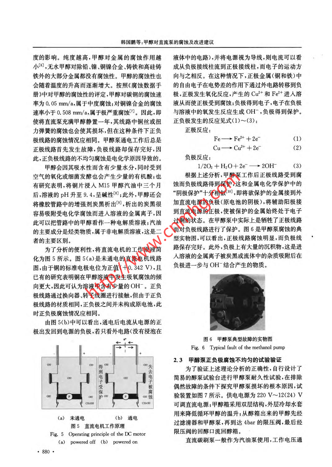 第36卷第9期腐蝕與防護(hù)Vol. 36 No. 92015 年9月CORROSION & PROTECTIONSeptember 2015 .應(yīng)用技術(shù)DOI:10. 1973/+5yfh-201509018甲醇對直流泵的腐蝕及改進(jìn)建議韓國鹛' ,姚安仁2 ,姚春德' ,劉軍恒'(1.天津大學(xué)內(nèi)燃機(jī)燃燒學(xué)國家重點實驗室,天津300072; 2.天津大學(xué)材料科學(xué)與工程學(xué)院,天津300072)摘要: 實踐發(fā)現(xiàn),采用直流泵供應(yīng)甲醇時其使用壽命較供應(yīng)汽油時大幅縮短。為探索原因,對已損壞的大量甲醇泵進(jìn)行了故障統(tǒng)計,并從電化學(xué)腐蝕的角度分析了甲醇泵正負(fù)極不均勻腐蝕的現(xiàn)象和機(jī)理;自行設(shè)計了簡易的醇泵試驗臺,通過醇泵耐久性試驗驗證了理論分析的正確性。結(jié)果表明:直流泵正負(fù)極線路之間發(fā)生了類似“陰極保護(hù)”的電化學(xué)作用,加速了正極線路的腐蝕并使負(fù)極線路得到保護(hù)?;诖耍瑴y試并分析了電液分離式和電液-體式無刷泵耐醇特性,指出將電液-體泵正負(fù)極銅絲與流體分離是提高直流泵耐醇能力的可行措施。關(guān)鍵詞:甲醇;直流泵;腐蝕;改進(jìn)建議中圖分類號: TG174文獻(xiàn)標(biāo)志碼: A文章編號: 1005-748X(2015)09-0878-05Corrosion of Methanol to DC Pump and Suggestions for ImprovementHAN Guo-peng' , YAO An-ren2,YAO Chun-de',LIU Jun-heng'(1. State Key Laboratory of Engines, Tianjin University, Tianjin 300072, China;2. School of Materials Science and Engineering, Tianjin University, Tianjin 300072, China)Abstract: Previous practical studies showed that the life of DC pumps subtanially reduced when supplyingmethanol compared with supplying gasoline. To explore the reason, the fault statistics was made on a large number ofdamaged nethanol pumps, while the phenomenon and mechanism of the non-uniform corrosion between the positiveand negative electrodes were analyzed from the point of electrochemical corrosion. A simple methanol pump test benchwas designed and durability tests of methanol pumps were performed using the bench, the theoretical analysis wasverified to be correct. The results show that a kind of electrochemical action, which was similar with cathodicprotection, happened between the positive and negative circuit of the DC pump. This effect accelerated the corrosionof the positive line but protected the negative line at the same time. Based on this, testing and analyzing were made onboth the integrated and separate electro hydraulic pump. It is pointed out that separating both the positive andnegative copper wires from the fluid for the electro .hydraulic integration pump is a feasible way to improve thmethanol- resistant capability of the DC pump.Key words: methanol; DC pump; corrosion; improvement suggestion甲醇來源廣泛,生產(chǎn)技術(shù)成熟,且在我國有很大熱效率,降低燃料成本[田。目前,該技術(shù)已經(jīng)開始在的富余產(chǎn)能,將甲醇作為替代燃料應(yīng)用到壓燃式發(fā)重載車.上應(yīng)用,并有大規(guī)模推廣的趨勢。動機(jī)上是針對我國結(jié)構(gòu)性缺油的特點提出的有效措甲醇泵是甲醇供應(yīng)系統(tǒng)中一個重要的裝置,考施["。柴油/甲醇組合燃燒(DMCC)技術(shù)是在進(jìn)氣慮到DMCC技術(shù)在車上使用、安裝的便利性,一般道上加裝-套甲醇噴射系統(tǒng),形成甲醇空氣混合.選用傳統(tǒng)的直流碳刷泵。在應(yīng)用中發(fā)現(xiàn),供應(yīng)甲醇?xì)?并在缸內(nèi)由直噴柴油引燃[2]。大量的臺架試驗的直流泵的使用壽命遠(yuǎn)低于其供應(yīng)汽油等其他燃料和車輛道路試驗表明,該方法能有效提高發(fā)動機(jī)的的使用壽命。隨著DMCC技術(shù)在重載車上進(jìn)- -步推廣,該問題8益突出,已經(jīng)成為甲醇使用過程中的收稿日期:2014-08-15-個技術(shù)瓶頸。因此,開發(fā)具有較長使用壽命的耐基金項目:國家高新技術(shù)發(fā)展計劃(2012A111719)醇泵具有實際意義。通信作者:姚春德(1955 - ),教授,博士生導(dǎo)師,從事發(fā)動機(jī)目前,國內(nèi)外對耐腐蝕直流泵的研究較多,且已代用燃料研究,022-27406649 , arcdyao@ tju. edu. cn經(jīng)見諸產(chǎn)品。這些技術(shù)包括將有刷泵改為無刷泵、韓國鵬等:甲醇對直流泵的腐蝕及改進(jìn)建議電路和液路分離、采用耐腐蝕材料,如三元乙丙膠,在換向器上。正極線路故障類型如圖3所示,圖3氟橡膠等[4-5]。新技術(shù)的應(yīng)用在一-定程度上提高了(a)是壓緊碳刷的扭力彈簧斷裂,碳刷無法與換向器直流泵供應(yīng)甲醇的可靠性,但甲醇類燃料對直流泵有效接觸導(dǎo)致開路;圖3(b)是接線柱和電感間的銅的腐蝕機(jī)理有待進(jìn)-步研究。本工作以傳統(tǒng)的直流導(dǎo)線蝕斷導(dǎo)致斷路;圖3(c)是電感和碳刷之間的銅碳刷泵為研究對象,對使用過程中損壞的大量甲醇辮腐蝕嚴(yán)重導(dǎo)致斷路。泵進(jìn)行了故障統(tǒng)計,分析了甲醇造成直流泵壽命大幅縮減的原因。隨后,采用自行設(shè)計的醇泵試驗臺,在排除偶然故障的條件下進(jìn)行了耐久性試驗,驗證了理論分析的正確性?;诖?對目前使用較多的兩種無刷直流泵進(jìn)行了測試和分析,給出從機(jī)理上改善直流泵耐醇特性的建議。(a) 彈簧斷裂(b) 銅導(dǎo)線腐蝕(c) 銅辮腐蝕1甲醇泵故障統(tǒng)計圖3正極線路故障Fig. 3 Faults of the positive line圖1是目前使用最為廣泛,同時也是DMCC技a) Spring broken (b) Copper wire corroded術(shù)試驗過程中所采用的直流碳刷泵示意圖。該泵由(c) Copper braid corroded直流電動機(jī)和滾柱式容積泵組成,通電后