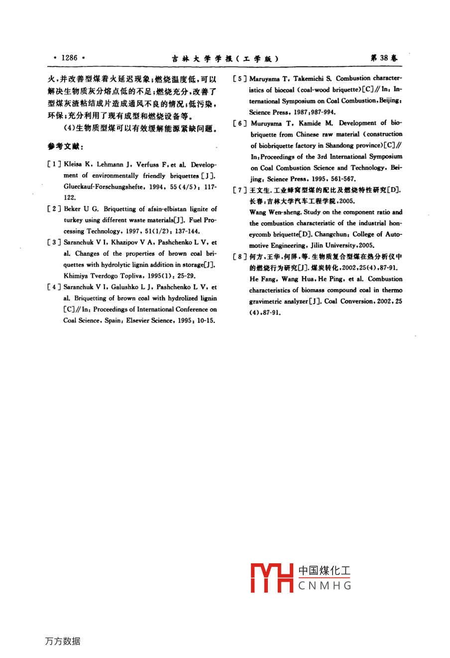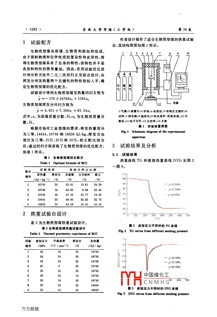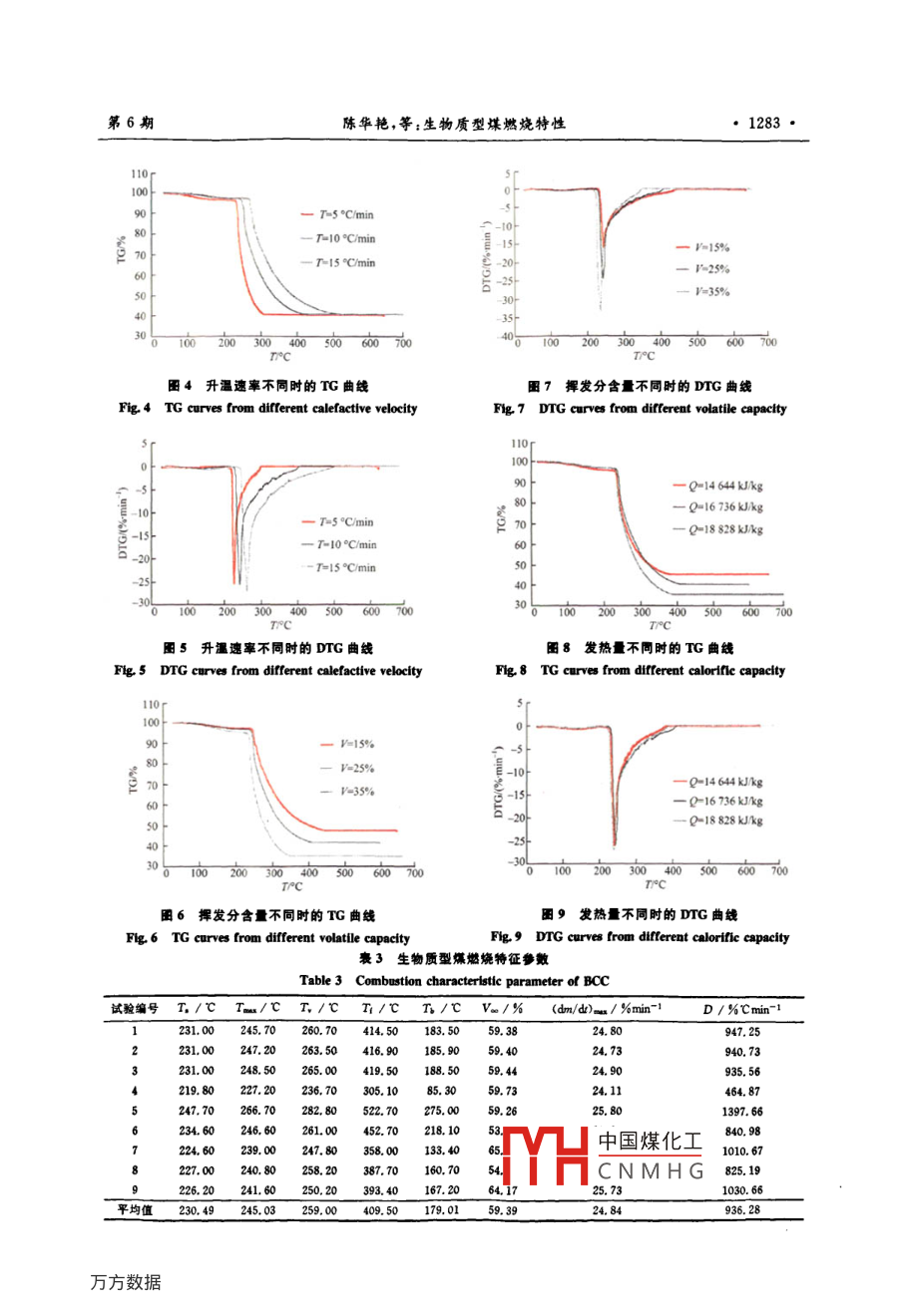 第38卷第6期吉林大學(xué)學(xué)報(bào)(工學(xué)版Vol 38 No 62008年11月Journal of Jilin University(Engineering and Technology EditionNov.2008生物質(zhì)型煤燃燒特性陳華艷2,蘇俊林1,矯振偉(1.吉林大學(xué)汽車工程學(xué)胱,長春130022;2.北京世宗智能有展責(zé)任公司,北京100029)摘要:以無煙煤、玉米秸稈和黃土為原料,研究了玉米秸稈含量為5%~35%的生物質(zhì)型煤在不同試驗(yàn)條件下的燃燒特性。通過熱重試驗(yàn)獲取了溫度與質(zhì)量間的關(guān)系,找出了各階段燃燒特征溫度和揮發(fā)分最大失重速率,計(jì)算了燃燒全過程溫度范圍,燃燼率和失重速率所占面積。通過與傳統(tǒng)型煤的試驗(yàn)結(jié)果比較,生物質(zhì)型煤燃燒特性好,揮發(fā)分初始析出溫度降低了50℃,到最后燃燒基本結(jié)東溫度降低了186℃,燃燼率提高了10%。關(guān)鍵詞:熱能工程;生物質(zhì)型煤;熱重分析;燃燒特性中圖分類號:TK16,TK6,TQ534文獻(xiàn)標(biāo)識(shí)碼:A文章編號:1671-5497(2008)03-128106Combustion characteristic of biomass compound coalCHEN Hua-yan", sU Jun-lin,JIAO Zhen-wei(l College of automotive Engineering, Jilin University, Changchun 130022, China: 2. Beijing Shizong IntelligentInstrument Co LTD, Beijing 100029, China)Abstract: The biomass compound coal (BCC) composed of anthracite coal, corn haulm and loess wastaken as the object of study. The combustion characteristic of the bcc containing 5%-35% of thecorn haulm was studied by the thermo gravimetry under different experiment conditions. Therelationships between the temperature and the sample mass were obtained and the characteristictemperatures at different combustion stages and the maximum mass loss rate of the volatile fractionwere found. The whole temperature range of the combustion process, the burn-up rate and the areaoccupied by the mass loss rate curve were calculated. Comparing with the results of the traditionalcoal briquette, the combustion characteristic of the BCC appears better, the initial separationtemperature is reduced by 50C, the final burn-up temperature is reduced by 186C, the burn-up rateis enhanced by 10%.Key words: thermal power engineering: biomass compound coal BCC); thermogravimentrycombustion characteristi目前常生物質(zhì)經(jīng)預(yù)處理,與原煤摻混技術(shù)的中在成型和燃燒設(shè)備上,對于燃燒特性和機(jī)理的研究受到各國的普遍重視1,但制造成本較高。研究卻很欠缺。作者著重討論了生物質(zhì)型煤的燃生物質(zhì)和原煤的粉末依靠高壓成型,制備的生物燒特性和機(jī)理,為生物質(zhì)型煤的實(shí)際應(yīng)用和普及質(zhì)型煤相繼出現(xiàn)5,但目前研兗的重點(diǎn)主要集提供依據(jù)。中國煤化工收稿日期:2007-03-10.基金項(xiàng)目:吉林省科技發(fā)展重大項(xiàng)目(20060403)CNMHG作者簡介:陳華艷(1981-),女,碩士研究方向:強(qiáng)化傳熱與節(jié)能技術(shù)E-mail:cheney122@163.com訊聯(lián)系人:蘇俊林(1953-),男教授研究方向:強(qiáng)化傳熱與節(jié)能技術(shù) E-mail: sujl@ jlu. edu1282·吉林大學(xué)學(xué)報(bào)(工學(xué)版)第38卷1試驗(yàn)配方作者設(shè)計(jì)制作了適合生物質(zhì)型煤的熱重試驗(yàn)臺(tái),其結(jié)構(gòu)簡圖如圖1所示。生物質(zhì)型煤由原煤、生物質(zhì)和添加劑組成由于原料物理和化學(xué)性質(zhì)的復(fù)雜性和差異性,使得生物質(zhì)型煤具有了自身的特性,該特性并不是各原料特性的簡單疊加。因此,采用試驗(yàn)優(yōu)化設(shè)計(jì)和分析方法中二元二次回歸正交組合設(shè)計(jì),從揮發(fā)分和發(fā)熱量兩個(gè)關(guān)鍵性的特性指標(biāo)入手,確定生物質(zhì)型煤的優(yōu)化配方。試驗(yàn)設(shè)計(jì)得到生物質(zhì)型煤發(fā)熱量回歸方程為y=-176+2476621+158生物質(zhì)型煤揮發(fā)分回歸方程為y=4.651+7.396z1+81.94z21氣源;2流量計(jì);3爐體;4電熱絲;5-坩堝及支撐桿;6式中:z1為原煤質(zhì)量分?jǐn)?shù),%;為生物質(zhì)質(zhì)量分試樣;7熱電倆;8溫控儀;9機(jī)電保護(hù)、控制系統(tǒng);10計(jì)算機(jī):11電子天平;12反射屏:13-支架根據(jù)市場對工業(yè)型煤的需求,將發(fā)熱量劃分圖1實(shí)驗(yàn)裝量簡圖為三等:14644、16736和18828kJ/kg,揮發(fā)分也Fig 1 Schematic diagram of the experimental劃分為三等:15%、25%和35%,相互配比結(jié)合后通過回歸方程獲取了生物質(zhì)型煤的優(yōu)化配方,3試驗(yàn)結(jié)果及分析如表1所示衰1生物質(zhì)型煤優(yōu)化配方3.1試驗(yàn)結(jié)果Table 1 Optimal formula of BCC熱重曲線TG和微商熱重曲線DTG見圖2圖9試驗(yàn)指標(biāo)各組分所占比例編號發(fā)熱量揮發(fā)分無煙煤玉米秸稈/(kJ·kg-1)/%167362555.6119.8124.58P20 MPa2167361563.906.862924P-33 MPa47.3332.7719.90p-46 MPa4146442546.6520.6232.7364.5819.0016.422熱重試驗(yàn)臺(tái)設(shè)計(jì)表2為生物質(zhì)型煤熱重試驗(yàn)設(shè)計(jì)。圖2成型壓力不同時(shí)的TG曲線褒2生物質(zhì)型煤熱量試驗(yàn)設(shè)計(jì)Fig 2 TG curves from different molding pressureTable 2 Thermal gravimetry experiment of BCC試驗(yàn)成型壓力升溫速率揮發(fā)分發(fā)熱量編號/MPa/(℃·mn-1)/%/kJ·kg)16736167362345678908600000016736-46 MPa16736中國煤化工16736CNMH14644圖3成型壓力不同時(shí)的DTG曲線Fig. 3 DTG curves from different molding pressure第6期陳華艷,等:生物質(zhì)型煤燃燒特性·12831101007=5°cminT=l0°min=15%T-15Cmin=25%T°C圖4升溫速率不同時(shí)的TG曲線圖7捍發(fā)分含量不同時(shí)的DG曲線Fig. 4 TG curves from different calefac