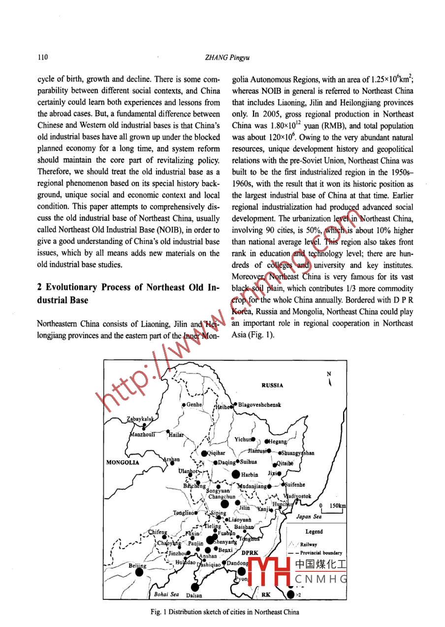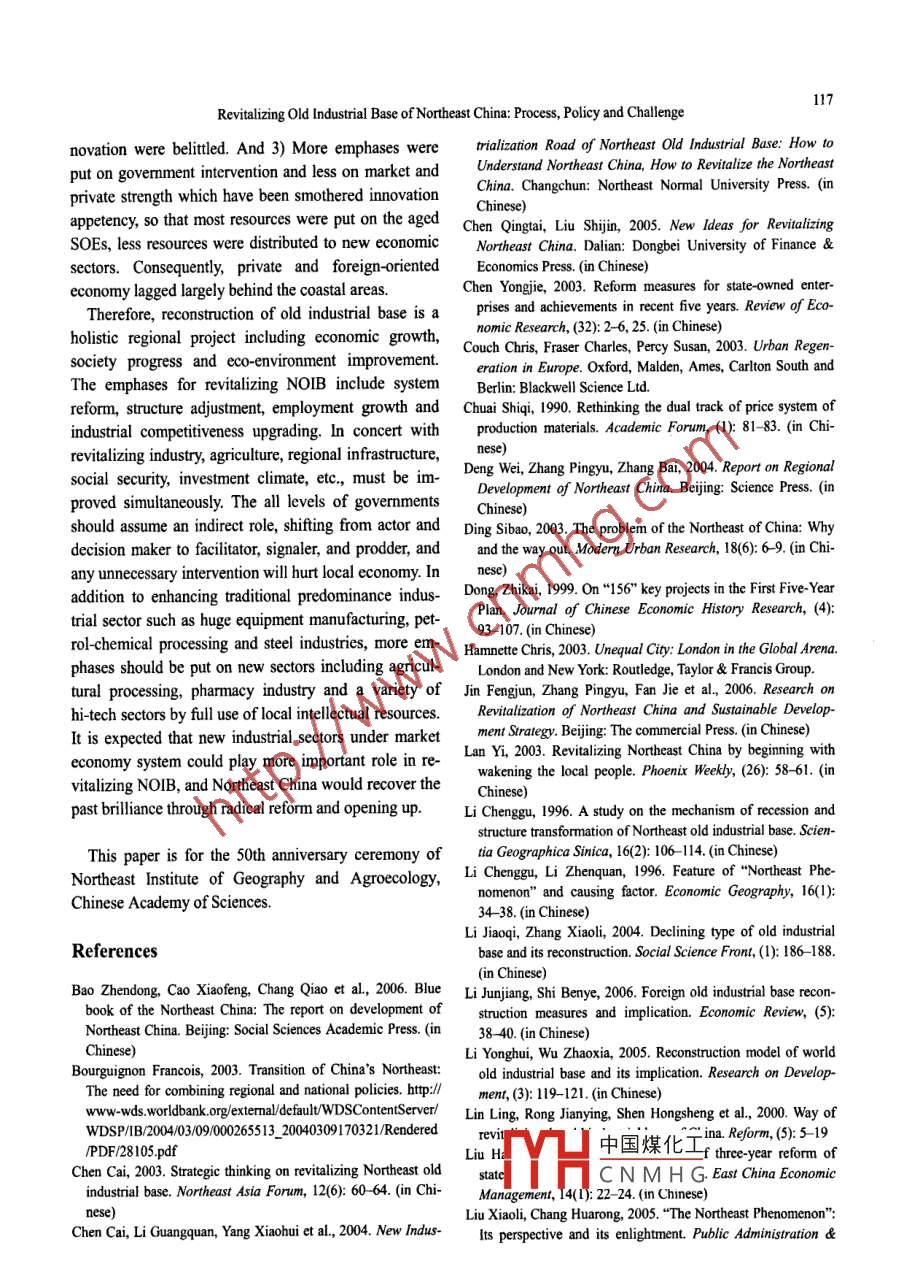 Chin. Geogra. Sci. 2008 18(2) 109-118DOI: 10.1007/s11769-008-0109-2www.springerlink.comRevitalizing Old Industrial Base of Northeast China:Process, Policy and ChallengeZHANG Pingyu(Northeast Institute of Geography and Agroecology, Chinese Academy of Sciences, Changchun 130012, China)Abstract: Northeast China is the largest old industrial base of China that endured persistent infuence of the past plannedeconomy system. This region has lost its leading place since the reform and opening up, and became a backward region bycontrast with the coastal areas. This paper elaborates the evolutionary process of the old industrial base of Northeast China,analyses the main reasons for the decline, gives a preliminary evaluation on the revtalizing polices in recent years, andpoints out major long term challenges for future revitalization. It concludes that for Northeast China, a relative decliningarea: 1) it is indispensable to get the long-term policy support from the central govenment; 2) system reform and structureadjustment are the crucial strategies, particulaly the reform of the large and medium state-owned enterprises; and devel-oping new industries is as important as upgrading traditional advantaged industries; 3) the local goverments should playan indirect role, avoiding from any unncessary intervention on economic actity; and 4) social security and investmentclimate must be improved simultaneously. In addition, the author sresses that the lack of knowledge on the nature of oldindustrial base had led to filures of the past ititives, and revializing the old industial base should be treated as a holistic regional project incuding economy growth, society progress and eavironment improvement.Keywords: old industrial base; regional revialization; regional policy; Northeast China1 Introductionthe 1980s. In the mid-1990s, some scholars noted thedeclining in the old industrial base of Northeast ChinaUrban and regional decline is a worldwide phenomenon, (Li and Li, 1996), and began to concerm revitalzing is-and revitalizing the declined old industrial base remains sues (Li, 1996; Lin et al, 2000; Liu, 2001). Until 2003,as a tough issue in regional and urban development revitalizing old industrial bases became a national policy,studies. With rapid technology advancing and global people treated old industrial base issues more seriously,economic and political restructuring after World War I,,and realized the very lack of knowledge on the nature ofmost developed countries acomplished industry trans-this issue. Hence, more and more domestic literaturesformation in the period of the 1970s -1980s, and stepped aimed at making some sense of foreign theory and em-on the post industialization stage, yet there were some pirical story about revitalizing old industrial base (Lideclining cities or regions left to be revitalized. It is easy and Zhang, 2004; Li and Wu, 2005; Li and Shi, 2006).to find some Westerm ltratures elaborating regional Major research projects focused on policy and measurerevitalization and urban regeneration, and some stories for the revitalization, particularly on the system reformlike Emscher Park in Ruhr, and Dockland in London etc. of the state-owned enterprises (SOEs) and industrialseem familiar to current Chinese scholars and oficials adjustment (Jin et al, 2006; Wang and Wei, 205). The(Roberts and Sykes, 2000; Couch et al, 2003; Hamnette, international research even more concerned finance and2003). However, it is hard to find any holistic study on market issues (Bourguignon, 2003). But, a broadly ac-China's old industrial base, though the story of eco- knowledged theoretical framework for revitalizing oldnomic achievement in the coastal area has long domi- industrial base does not appear.nated main stream of China's social and economy since中國煤化工may experience aYHCNMHGReceived date: 2007-03-12; accepted date: 2007-12-03Foundation item: Under the auspices of National Natural Science Foundation of China (No. 40635030, 40471038), Knowledge Innova-tion Program of Chinese Academy of Sciences No. kzcxz-YW-321-04)Corresponding author: ZHANG Pingyu. E-mail: zhangpy@neigae.ac.cn110ZHANG Pingyucycle of birth, growth and decline. There is some com-golia Autonomous Regions, with an area of 1.25x 10'km';parability between different social contexts, and Chinawhereas NOIB in general is referred to Northeast Chinacertainly could learn both experiences and lessons fromthat includes Liaoning, Jilin and Heilongjiang provincesthe abroad cases. But, a fundamental difference between only. In 2005, gross regional production in NortheastChinese and Westem old industrial bases is that China's China was 1.80x 10'2 yuan (RMB), and total populationold industrial bases have all grown up under the blockedwas about 120x 10°. Owing to the very abundant naturalplanned economy for a long time, and system reformresources, unique development history and geopoliticalshould maintain the core part of revitalizing policy.relations with the pre-Soviet Union, Northeast China wasTherefore, we should treat the old industrial base as a built to be the first indutialized region in the 1950s-regional phenomenon based on its special history back- 1960s, with the result that it won its historic position asground, unique social and economic context and localthe largest industrial base of China at that time. Earliercondition. This paper attempts to comprehensively dis-regional industrialization had produced advanced socialcuss the old industrial base of Northeast China, usuallydevelopment. The urbanization level in Northeast China,called Northeast Old Industrial Base NOIB), in order to involving 90 cities,s is 50%, which is about 10% highergive a good understanding of China's old industrial basethan national average level. This region also takes frontissues, which by all means adds new materials on therank in education and technology level; there are hun-old industrial base studies.dreds of colleges and university and key inst
