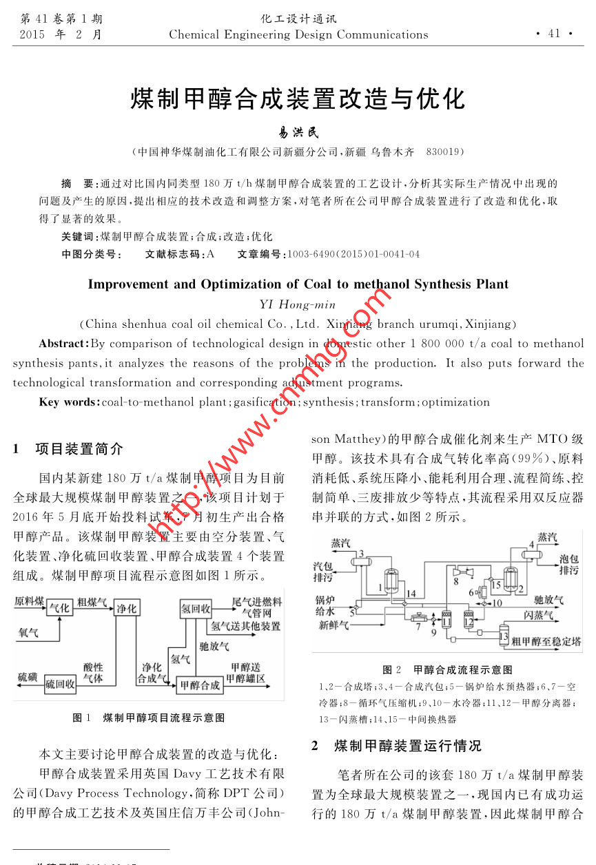 第41卷第1期化工設(shè)計通訊2015年2月Chemical Engineering Design Communications煤制甲醇合成裝置改造與優(yōu)化易洪民(中國神華煤制油化工有限公司新疆分公司,新疆烏魯木齊830019)摘要:通過對比國內(nèi)同類型180萬t/h煤制甲醇合成裝置的工藝設(shè)計,分析其實(shí)際生產(chǎn)情況中出現(xiàn)的問題及產(chǎn)生的原因,提出相應(yīng)的技術(shù)改造和調(diào)整方案,對筆者所在公司甲醇合成裝置進(jìn)行了改造和優(yōu)化,取得了顯著的效果。關(guān)鍵詞;煤制甲醇合成裝置;合成;改造;優(yōu)化中圖分類號:文獻(xiàn)標(biāo)志碼:A文章編號:1003- -6490(2015)01-0041-04Improvement and Optimization of Coal to methanol Synthesis PlantYI Hong-min .(China shenhua coal oil chemical Co. , Ltd. Xinjiang branch urumqi, Xinjiang)Abstract: By comparison of technological design in domestic other 1 800 000 t/a coal to methanolsynthesis pants,it analyzes the reasons of the problems in the production. It also puts forward thetechnological transformation and corresponding adjustment programs. .Key words :coal to- methanol plant ; gasification; synthesis ;transform ; optimizationson Matthey)的甲醇合成催化劑來生產(chǎn)MTO級1項目裝置簡 介甲醇。該技術(shù)具有合成氣轉(zhuǎn)化率高(99%)、原料國內(nèi)某新建180萬t/a煤制甲醇項目為目前消耗低、系統(tǒng)壓降小、能耗利用合理、流程簡練、控全球最大規(guī)模煤制甲醇裝置之一,該項目計劃于制 簡單、三廢排放少等特點(diǎn),其流程采用雙反應(yīng)器2016年5月底開始投料試車,7月初生產(chǎn)出合格串并聯(lián)的方式,如圖2所示。甲醇產(chǎn)品。該煤制甲醇裝置主要由空分裝置、氣蒸汽化裝置、凈化硫回收裝置、甲醇合成裝置4個裝置泡包汽包排行組成。煤制甲醇項目流程示意圖如圖1所示。排污154中”14原料煤比化粗媒氣。凈化氫回收尾氣進(jìn)燃料鍋水二+8- 10馳放氣氣管網(wǎng)給水閃蒸氣_氧氣氫氣送其他裝置新鮮氣-空地電I 粗甲醇至穩(wěn)定塔酸性凈化氫氣甲醇送圖2甲醇合成流程示意圖硫磺硫回收一合成(|甲醇合成I1甲醇罐區(qū)、1、2-合成塔;3、4-合成汽包;5-鍋爐給水預(yù)熱器;6.7-空冷器;8-循環(huán)氣壓縮機(jī);9.10-水冷器;11.12-甲醇分離器;圖1煤制甲醇項目流程示意圖13-閃蒸槽;14、15-中間換熱器本文主要討論甲醇合成裝置的改造與優(yōu)化:2煤制甲醇裝置運(yùn)行情況甲醇合成裝置采用英國Davy工藝技術(shù)有限筆者所在公司的該套180萬t/a 煤制甲醇裝公司(Davy Process Technology,簡稱DPT公司)置為全球最大規(guī)模裝置之- . ,現(xiàn)國內(nèi)已有成功運(yùn)的甲醇合成工藝技術(shù)及英國莊信萬豐公司(John-行的180萬t/a煤制甲醇裝置,因此煤制甲醇合收稿日期:2014-11-07作者簡介:易洪民(1986-),男,漢族,重慶市人,助理工程師,主要從事煤制甲醇生產(chǎn)技術(shù)工作?!?2●化工設(shè)計通訊第41卷成裝置在工藝和設(shè)計.上有很多值得借鑒的地方???.9MPa,產(chǎn)品氫氣壓力1. 7 map,由于外送給通過和其它同類裝置的對比,發(fā)現(xiàn)了其工藝下游裝置的H2需要壓力3.2 MPa,需要一臺氫.流程的設(shè)計、設(shè)備選型、儀表電器控制方案等存在氣壓縮機(jī)提壓,增加操作負(fù)擔(dān)和投資。的問題、缺陷和潛在的不安全因素。為了從根本|合成氣上解決以上問題,消除設(shè)計缺陷,相關(guān)技術(shù)人員從實(shí)踐中摸索經(jīng)驗,提出了相應(yīng)的技術(shù)改造和優(yōu)化合成氣凈化方案,取得了顯著的效果。合成氣壓縮機(jī)脫氯槽預(yù)熱器合成氣凈化槽3煤制甲醇合成裝置改造與優(yōu)化圖4新疆某公司甲醇合 成凈化系統(tǒng)工藝流程圖3.1 甲醇合成裝置合成氣脫硫的改造與優(yōu)化3.1.1存在問題(2)PSA單元設(shè)計處理尾氣能力最大為7159(1)包頭某公司選擇的脫硫催化劑是銅鋅催m' (標(biāo))/h,在催化劑末期,馳放氣量大,不能滿足化劑,活性溫度為150~190C.在脫硫前,需要對需求,不僅導(dǎo)致大量的馳放氣放空、能耗增加,還催化劑中的氧化銅進(jìn)行還原,增加了操作難度和不利于環(huán)保。時間。(3)當(dāng)產(chǎn)品氫氣質(zhì)量不合格、壓力波動、PSA(2)由于活性溫度較高,需要較大換熱面積的故障或停車等非正常生產(chǎn)情況時,需要切斷去下合成凈化預(yù)熱器,增加了投資成本。如圖3所示:游裝置的產(chǎn)品氫氣,影響下游裝置的穩(wěn)定生產(chǎn)。如圖5所示:1.7MPa產(chǎn)品氫氣去PP、PE'裝置合成氣凈化預(yù)熱器原料氣冷卻器) 氫氣壓縮機(jī)回流線原料氣分液罐解析氣L→去合成塔PSA吸附塔(8個)圖3包頭某公司甲醇合成凈化系統(tǒng)流程圖.圖5包頭某公司PSA單元工藝流程圖3.2.2改造內(nèi) 容3.1.2改造內(nèi)容(1)選擇低溫活性的氧化鋅催化劑,不需要還.(1)提高PSA單元的操作壓力,人口3.4MPa,產(chǎn)品氫氣壓力3. 2MPa,滿足外送氫氣壓力原,活性溫度為110~130 C。(2)根據(jù)新疆煤質(zhì)分析,氯離子超標(biāo),增加脫要求,少用一臺氫氣壓縮機(jī),減輕操作負(fù)擔(dān)和減少投資。氯槽。(2)由包頭某公司的8個吸附塔,增加到103.1.3改造效 果(1)氧化鋅催化劑不需要還原,減輕了操作負(fù)個吸附塔.提高PSA單元處理能力,最大能夠處.理34500m3 (標(biāo))/h,在催化劑末期,能滿足處理.擔(dān),節(jié)約了開車時間。(2)氧化鋅催化劑活性溫度比銅鋅催化劑低,大量馳放氣的要求。如圖6所示。3.2MPa產(chǎn)品氫氣去下游裝置合成凈
