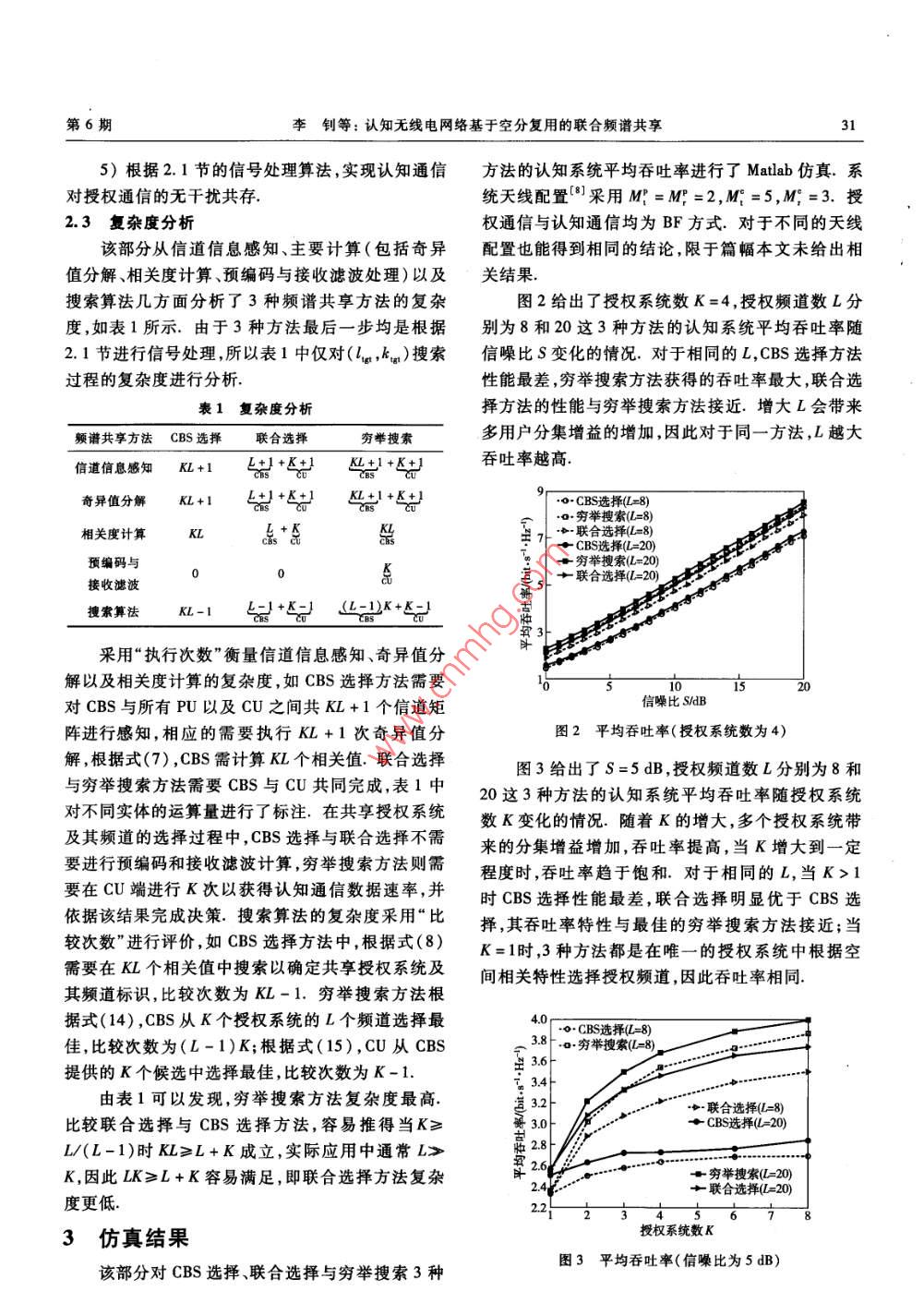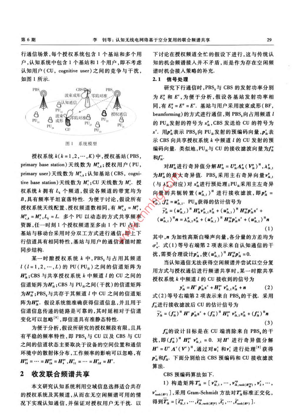 2011年12月北京郵電大學(xué)學(xué)報(bào)Dec.2011第34卷第6期Journal of Beijing University of Posts and TelecommunicationsVol 34 No 6文章編號(hào):10075321(2011)060028405認(rèn)知無線電網(wǎng)絡(luò)基于空分復(fù)用的聯(lián)合頻譜共享李釗,楊家瑋,肖麗媛(西安電子科技大學(xué)綜合業(yè)務(wù)網(wǎng)理論及關(guān)鍵技術(shù)國家重點(diǎn)實(shí)驗(yàn)室,西安710071)摘要:針對(duì)多天線認(rèn)知無線電網(wǎng)絡(luò)提出一種基于空分復(fù)用的收發(fā)聯(lián)合頻譜共享方法.綜合利用認(rèn)知通信與系統(tǒng)間干擾的空間相關(guān)特性,在無空閑頻譜資源可用時(shí)合理選擇授權(quán)系統(tǒng)及其頻道并以空分復(fù)用的方式實(shí)現(xiàn)頻譜共享相比于僅在認(rèn)知基站端進(jìn)行選擇以及窮舉搜索該方法能獲得接近最佳的系統(tǒng)吞吐率特性,并且具有低的復(fù)雜度關(guān)詞:認(rèn)知無線電;多天線;空分復(fù)用;波束成形;預(yù)編碼中圖分類號(hào):TN929.5文獻(xiàn)標(biāo)志碼:ASpace Division Multiplexing Based Joint SpectrumSharing in Cognitive Radio NetworksLI Zhao, YANG Jia-wei, XIAO Li-yuan(State Key Laboratory of Integrated Service Networks, Xidian University, Xi'an710071,ChinaAbstract: A space division multiplexing based joint transmit-receive spectrum sharing method in cognitive radio networks is proposed. By exploiting spatial correlation features between cognitive transmissionand interference among different systems, appropriate primary system and its channel could be selectedunder the condition that no idle spectrum resource is available. Consequently, the spectrum sharing iscarried out using space division multiplexing. Compared with the method implemented only at cognitivebase station and exhaustive searching, the proposed scheme could achieve near-optimal system throughputperformance with reduced complexityKey words: cognitive radio; multiple antennas; space division multiplexing; beamforming; precoding近年來頻譜資源稀缺與傳統(tǒng)的固定頻譜分配在實(shí)際應(yīng)用中,多種通信系統(tǒng)覆蓋同一地區(qū)非常普方式導(dǎo)致的頻譜資源利用率低的矛盾日益突出,遍,筆者針對(duì)多天線CRN設(shè)計(jì)了一種基于空分復(fù)用作為頻譜共享與重用技術(shù)重要研究內(nèi)容的認(rèn)知無線的收發(fā)聯(lián)合頻譜共享方法,綜合利用認(rèn)知通信與授電2(CR)和認(rèn)知無線電網(wǎng)絡(luò)(CRN)技術(shù)受到了權(quán)通信和系統(tǒng)間干擾的空間特征,實(shí)現(xiàn)了基于空分廣泛關(guān)注,傳統(tǒng)的CR或CRN關(guān)注頻譜資源的機(jī)會(huì)復(fù)用的聯(lián)合頻譜共享共享,而通信是對(duì)包括頻率在內(nèi)的多種類型資源1系統(tǒng)模型的綜合使用,一部分研究將多輸入多輸出技術(shù)與CR結(jié)合,設(shè)計(jì)頻譜共享和聯(lián)合資源管理方法63研究K個(gè)授權(quán)系統(tǒng)與認(rèn)知系統(tǒng)共同覆蓋的下收稿日期:201101-12基金項(xiàng)目:國家杰出青年科學(xué)基金項(xiàng)目(60725105);國家重點(diǎn)基礎(chǔ)研究發(fā)展計(jì)劃項(xiàng)目(2009cB20404);長江學(xué)者和創(chuàng)新團(tuán)隊(duì)發(fā)展計(jì)劃項(xiàng)目(Rm0852);國家自然科學(xué)基金項(xiàng)目(61102057);高等學(xué)校引智計(jì)劃項(xiàng)目(B08038);中央高?;究蒲袠I(yè)務(wù)費(fèi)專項(xiàng)資金項(xiàng)目(K50510010022);ISN項(xiàng)目(IsN作者簡(jiǎn)介:李釗(1981-),男,博士,副教授,E-mal:ii1912@126.com第6期李釗等:認(rèn)知無線電網(wǎng)絡(luò)基于空分復(fù)用的聯(lián)合頻譜共享行通信場(chǎng)景,每個(gè)授權(quán)系統(tǒng)包含1個(gè)基站和多個(gè)用下討論在授權(quán)頻道全忙的假設(shè)下進(jìn)行,這與傳統(tǒng)認(rèn)戶,認(rèn)知系統(tǒng)中包含1個(gè)基站和1個(gè)用戶,即不考慮知的機(jī)會(huì)頻譜接入并不矛盾,而是作為存在空閑頻認(rèn)知用戶(cU, cognitive user)之間的競(jìng)爭(zhēng)與干擾,譜時(shí)機(jī)會(huì)接入策略的補(bǔ)充如圖1所示2.1信號(hào)處理研究下行通信時(shí),PBS與CBS的發(fā)射功率分別波束成陷對(duì)準(zhǔn)為E和E,為便于分析,假設(shè)各基站發(fā)射功率相認(rèn)知通信同,有E=E=E.基站與用戶采用波束成形(BF,A.8陷動(dòng)8“8beamforming)的方式進(jìn)行通信,則PBS向占用頻道l的PUa發(fā)射的符號(hào)為x,CBS發(fā)送給CU的符號(hào)為x.用P表示PBS4向PU4發(fā)射的預(yù)編碼向量,P表圖1系統(tǒng)模型示CBS向共享授權(quán)系統(tǒng)k中頻道l的CU發(fā)射的預(yù)編碼向量.類似地,PU4與CU的接收濾波向量為f授權(quán)系統(tǒng)k(k=1,2,…,K)中,授權(quán)基站(PBS,和faprimary base station)天線數(shù)為Mk;授權(quán)用戶(PU,對(duì)m進(jìn)行奇異值分解H=UAB(V)",Aprimary user,)天線數(shù)為M";認(rèn)知基站(CBS, cognI-為Hl的最大奇異值.PBS采用主右奇異向量tive base station)天線數(shù)為M;CU天線數(shù)為M,授(與A,對(duì)應(yīng))對(duì)x進(jìn)行預(yù)處理;PU采用主左奇異權(quán)系統(tǒng)k擁有L4個(gè)頻道,假設(shè)各頻道的帶寬均為向量的共軛轉(zhuǎn)置(u1)"進(jìn)行接收濾波,即p=B,具有頻率平坦衰落特性為便于討論,假設(shè)所有v1J"=:PU獲得的估計(jì)信號(hào)為授權(quán)系統(tǒng)天線配置、授權(quán)頻道數(shù)相同,有MA=My=(u.1)“吟1x+(uB1)"H田px”+MPA=M",L4=L.多個(gè)PU以動(dòng)態(tài)的方式共享頻率(uB)"n=AL XI+(up.i"HiPur+(ui,)"n資源,任一時(shí)刻1個(gè)授權(quán)
