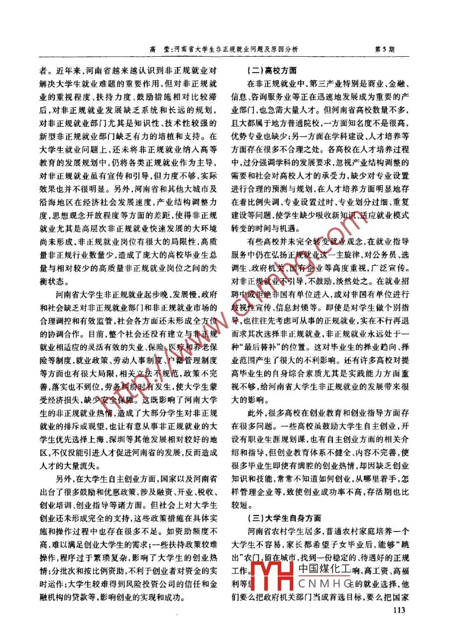 第5期河南科技學(xué)院學(xué)報(bào)2012年5月.No.5Joumal of Henan Institute of Science and TechnologyMay. 2012doi:10. 3969/j isn. 1673 - 6060.2012. 05.029河南省大學(xué)生非正規(guī)就業(yè)問題及原因分析高瑩(洛陽師范學(xué)院商學(xué)院,河南洛陽471022)摘要:河南省大學(xué)生非 正規(guī)就業(yè)存在著地城分布不平衡,行業(yè)分布不合理,就業(yè)層次較低,流動(dòng)性較強(qiáng),勞動(dòng)關(guān)系不規(guī)范,自主創(chuàng)業(yè)人數(shù)不多、成功率不高等問題。文章從政府、社會(huì)、高校和大學(xué)生自身等方面分析這些問題形成的原因,以期對大學(xué)生非正規(guī)就業(yè)起到積極的指導(dǎo)和促進(jìn)作用。關(guān)鍵詞:河南省;大學(xué)生;非正規(guī)就業(yè);問題;原因中圖分類號:G647.38文獻(xiàn)標(biāo)識(shí)碼:A文章編號:1673 -6060(2012)05 -0111 -04“非正規(guī)就業(yè)”是指沒有按照勞動(dòng)力市場規(guī)范市,占45%。據(jù)分析,目前全國高校畢業(yè)生非正規(guī).就業(yè)的方式而獲取職業(yè)。在這種就業(yè)中,勞資雙方就業(yè)主要集中在北京廣州深圳等經(jīng)濟(jì)發(fā)達(dá)的大城一般不簽訂契約型的合同,即使有合同,也往往因?yàn)槭泻蜄|南沿海地區(qū)。對于河南省大學(xué)生來說,如果福利待遇等規(guī)定不明確而形同虛設(shè),沒有法律效是跨省就業(yè),大多數(shù)高校畢業(yè)生也會(huì)把目光鎖定在力。這類就業(yè)主要包括自我雇用.家庭內(nèi)就業(yè).階段北京上海.深圳等經(jīng)濟(jì)發(fā)達(dá)的大城市和東南沿海地性就業(yè)、鐘點(diǎn)工、臨時(shí)工.季節(jié)工等。大學(xué)生非正規(guī)區(qū);而如果是省內(nèi)就業(yè),畢業(yè)生最愿意去的地方是省就業(yè),也稱為“隱性就業(yè)”,其特征是大學(xué)生畢業(yè)后會(huì)鄭州,洛陽次之。即使是到河南省其他城市,也多沒有明確的簽約接收單位,檔案戶口放在學(xué)校或者集中于市區(qū),最不愿意去的是經(jīng)濟(jì)相對落后的縣、鄉(xiāng)人事代理部門,但是人并不是賦閑在家,而是在人力(鎮(zhèn))等地方。資源市場上選擇“游擊戰(zhàn)”或“漂泊”在- -些發(fā)達(dá)的(二)非正規(guī)就業(yè)行業(yè)分布不合理城市中,通過工作獲得收人。從行業(yè)分布來看,非正規(guī)就業(yè)方式在各大產(chǎn)業(yè)一河南省大學(xué)生在非正規(guī)就業(yè)過程中和行業(yè)皆有分布,但以第三產(chǎn)業(yè)為主。高新技術(shù)產(chǎn)業(yè)、信息咨詢業(yè)、教育服務(wù)業(yè)、商業(yè)經(jīng)紀(jì)業(yè)等新興行出現(xiàn)的問題業(yè),因其用人機(jī)制靈活,工作環(huán)境較為寬松.薪資待非正規(guī)就業(yè)在促進(jìn)河南省大學(xué)生就業(yè),緩解就遇也不錯(cuò),對人員素質(zhì)和技術(shù)要求較高,成為眾多大業(yè)壓力方面起到了積極的作用。但總體來看,河南省學(xué)生非正規(guī)就業(yè)的首選。但是,較北京、上海等大城大學(xué)生非正規(guī)就業(yè)雖然較其他省市發(fā)展相對緩慢,但市及-些沿海城市,河南省等中西部地區(qū)新興行業(yè)在發(fā)展過程中- -些問題卻相伴而生,不容小視。發(fā)展相對緩慢,不能為大學(xué)生提供大量的非正規(guī)就(一)非正規(guī)就業(yè)地域分布不平衡業(yè)崗位。麥可思公布的《2009年19省市大學(xué)畢業(yè)麥可思研究院獨(dú)家撰寫的《2010年中國大學(xué)生生就業(yè)報(bào)告》指出,2008屆大學(xué)畢業(yè)生在河南省就就業(yè)報(bào)告》中指出,2009屆“211"院校畢業(yè)生的首選業(yè)的行業(yè)大類主要集中于制造業(yè),本科和高職高專就業(yè)城市主要是直轄市,占44% ;非“211”本科院校畢業(yè)生分別有20%、23%就業(yè)于制造業(yè),低于全國以及高職高專畢業(yè)生的首選就業(yè)城市主要是副省級2008屆本科生(27% )和高職高專(31% )畢業(yè)生就中國煤化工收稿日期:2011-12-13基金項(xiàng)目:2010年河南省政府決策研究招標(biāo)課題“河南省大學(xué)生非MHCNMHG成果之一作者簡介:高瑩(1985- ) ,女,河南洛陽人,助教,碩士,主要從事思想政治教育方面的研究。1112012年河南科技學(xué)院學(xué)報(bào)業(yè)于制造業(yè)的比例。另外, 民營和個(gè)體企業(yè)是河南人單位維系的是一-種松散.不規(guī)范且不穩(wěn)定的勞動(dòng)省2008屆大學(xué)畢業(yè)生就業(yè)最多的雇主類型,雇傭了關(guān)系。--方面勞務(wù)雙方常常因?yàn)槔鎲栴}而產(chǎn)生矛43%的本科畢業(yè)生和67%的高職高專畢業(yè)生。其盾糾紛,另一方面勞動(dòng)關(guān)系處于隨時(shí)可能被中止的中,45%的本科畢業(yè)生和64%的高職高專畢業(yè)生受狀態(tài),使得大學(xué)生缺少穩(wěn)定感和認(rèn)同感,很難將自己雇于規(guī)模為300人以下的企業(yè)。由此可見,大學(xué)生作為用人單位的一分子。另外,養(yǎng)老保險(xiǎn)、醫(yī)療保險(xiǎn)非正規(guī)就業(yè)行業(yè)分布不太合理,沒有充分發(fā)揮高校等社會(huì)權(quán)益和一些基本的勞動(dòng)保護(hù)難以保障,很多畢業(yè)生的優(yōu)勢和作用。民營小企業(yè)以各種原因和借口不給員工交納社會(huì)保(三)非正規(guī)就業(yè)層次較低障金,給大學(xué)生選擇非正規(guī)就業(yè)帶來很大的后顧之據(jù)相關(guān)調(diào)查和訪談情況看,能夠利用自己所學(xué