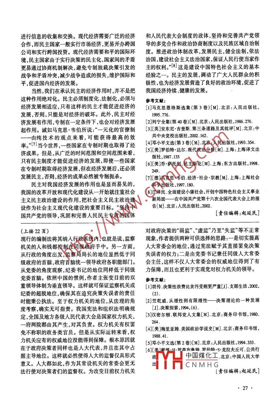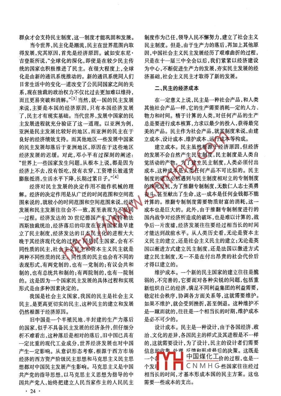 2005年1月哈爾濱市委黨校學(xué)報Jan,2005總第37期第1期THE JOURNAL OF HARBIN COMITTEE SCHOOL OF THE CCPSerial No.37 No.1, 科社新探●民主的經(jīng)濟分析丁成榮(中共上海紡織控股(集團)公司黨校,上海200080)摘要:民主發(fā)展和經(jīng)濟發(fā)展緊密相連,經(jīng)濟發(fā)展對民主發(fā)展具有決定作用,民主在世界范圍內(nèi)取得發(fā)展,首先是經(jīng)濟原因。民主是一種社會產(chǎn)品,作為社會產(chǎn)品,就其制度來說,由建立成本、設(shè)計成本、維護成本、運行成本等構(gòu)成。現(xiàn)代民主是生產(chǎn)力發(fā)展的產(chǎn)物,它符合生產(chǎn)力發(fā)展的本質(zhì)要求,是人類歷史上最有效率的制度,對經(jīng)濟發(fā)展最有利。關(guān)鍵詞:民主;經(jīng)濟基礎(chǔ);成本;作用中圖分類號:D046.1文獻標(biāo)識碼:A文章編號:1008 - 8520(2005)01 -0023-05經(jīng)濟發(fā)展,政治民主,是當(dāng)今世界各國面臨的共要理論認為,人的需要是多層次的,生存需要是基本同課題,而民主發(fā)展和經(jīng)濟發(fā)展是緊密相連的,當(dāng)人需要,而民主作為人們參與政治、實現(xiàn)政治權(quán)利的需們在確立本國的民主發(fā)展戰(zhàn)略時,不得不審視自己要是一種高級需要。當(dāng)人們的生存需要還存在問題的經(jīng)濟基礎(chǔ),研究經(jīng)濟發(fā)展為民主發(fā)展所提供的條時,是難以產(chǎn)生民主需要的,正如人們通常所說的那件和可能,實現(xiàn)經(jīng)濟和民主的協(xié)同發(fā)展。樣,對一個饑餓的人來說, - -塊面包的價值遠遠高于-張選票。只有經(jīng)濟發(fā)展了,才會產(chǎn)生民主發(fā)展的一、民主的經(jīng)濟基礎(chǔ)需要。關(guān)于民主的經(jīng)濟基礎(chǔ),馬克思主義經(jīng)典作家有第二,經(jīng)濟發(fā)展為民主發(fā)展提供物質(zhì)條件和手過不少論述。恩格斯指出:“人們首先必須吃、喝、段。民主意味著廣泛的公眾參與,廣泛的公眾參與住穿,然后才能從事政治科學(xué)、藝術(shù)、宗教等;所需要物質(zhì)條件和手段,即使古希臘和古羅馬的古代以,直接的物質(zhì)的生活資料的生產(chǎn),從而一一個民族或民主也需要市政廳和廣場?,F(xiàn)代生產(chǎn)力和現(xiàn)代通訊一個時代的一定的經(jīng)濟發(fā)展階段,便構(gòu)成基礎(chǔ),人們技術(shù)提供了現(xiàn)代民主所需的現(xiàn)代物質(zhì)條件和手段。的國家設(shè)施、法的觀點、藝術(shù)以至宗教觀念,就是從第三,經(jīng)濟發(fā)展促進中產(chǎn)階級的形成,為民主的這個基礎(chǔ)上發(fā)展起來的,因而,也必須由這個基礎(chǔ)來發(fā)展提供堅實的階級基礎(chǔ)。由中產(chǎn)階級的經(jīng)濟地解釋,而不是像過去那樣做得相反?!盵]列寧指出:位政治態(tài)度、文化水平所決定,中產(chǎn)階級是民主的“任何民主,和任何政治上層建筑- -...歸根到底天然朋友,是民主的階級基礎(chǔ)。中產(chǎn)階級的形成和是為生產(chǎn)服務(wù)的,并且歸根到底是由該社會中的生發(fā)展根源于經(jīng)濟發(fā)展,在當(dāng)代世界,由于生產(chǎn)力的發(fā)產(chǎn)關(guān)系決定的?!盵2]馬克思主義經(jīng)典作家的這些論展,階級結(jié)構(gòu)發(fā)生重大變化,中產(chǎn)階級的比重日益擴述,深刻提示了經(jīng)濟基礎(chǔ)對民主發(fā)展的決定作用,任大,民主的階級基礎(chǔ)日益堅實。何民主本質(zhì)上都是經(jīng)濟發(fā)展的產(chǎn)物,并隨著經(jīng)濟的第四,經(jīng)濟發(fā)展有利于提高公眾的參與意識和發(fā)展而發(fā)展。參與能力。民主發(fā)展需要廣“大具有參與意識和參與經(jīng)濟基礎(chǔ)對民主發(fā)展的決定作用主要表現(xiàn)在以能力的公民,參與意識和參與能力的提高需要教育普及和民主訓(xùn)練,經(jīng)濟發(fā)展為教育普及和民主訓(xùn)練下幾個方面:第一,經(jīng)濟發(fā)展產(chǎn)生民主發(fā)展的需要。現(xiàn)代需提供了現(xiàn)實可能。中國煤化工合法性。一個國家不管|Y片CNMHG,都需要確立和維收稿日期:2004-07- 19作者簡介:丁成榮(1954-),男,上海人,中共上海紡織護其合法性,合法性的確立和維護需要有多種條件,控股(集團)公司黨校??敝骶幐苯淌凇=?jīng)濟發(fā)展是-一個主要條件。只有經(jīng)濟發(fā)展了,人民23●群眾才會支持民主制度,這一制度才能鞏固和發(fā)展。制度作為己任,領(lǐng)導(dǎo)人民不懈努力,建立了社會主義當(dāng)今世界,民主化是潮流,民主在世界范圍內(nèi)取民主制度。但是,由于生產(chǎn)力的落后,再加上其他原得發(fā)展,究其原因,首先是經(jīng)濟原因。誠如安東尼●因,中國社會主義民主發(fā)展經(jīng)歷了艱難曲折的過程,吉登斯所說,“全球化的深化,即使是在較少民主傳只是在十一屆三中全會以后,我們緊緊以經(jīng)濟建設(shè)統(tǒng)的國家也積極推進了民主。在很大程度上,全球為中心,不斷促進生產(chǎn)力的發(fā)展,夯實民主發(fā)展的經(jīng)化是由新的通訊系統(tǒng)推動的。新的通訊系統(tǒng)同人們濟基礎(chǔ),社會主義民主才取得了新的發(fā)展。日常生活中的變化-道改變了公民同國家之間的關(guān)二、民主的經(jīng)濟成本系,現(xiàn)在獨裁的政治權(quán)力不僅比過去更加難以維持,而且更易突破和消解?!盵3]當(dāng)然,就一國的民主發(fā)展在- -定意義上說,民主是- -種社會產(chǎn)品,和人類來說,主要是本國