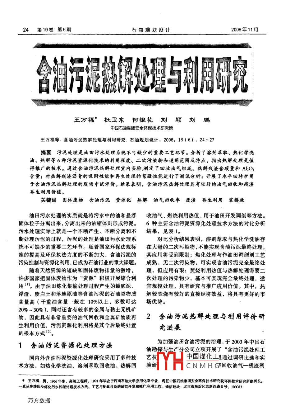 24第19卷第6期石油規(guī)劃設(shè)計(jì)2008年11月合描與層酪王萬(wàn)福·杜衛(wèi)東何銀花劉穎劉鷴中國(guó)石油集團(tuán)安全環(huán)保技術(shù)研究院王萬(wàn)福等.含油污泥熱解處理與利用研究.石油規(guī)劃設(shè)計(jì),2008,19(6):24~27摘要污泥處理是油田污水處理系統(tǒng)不可缺少的重要工藝環(huán)節(jié)。分析了溶劑萃取、熱化學(xué)洗油、熱解等6種污泥資源化技術(shù)的利用程度、二次污染物和適用范圍及特點(diǎn),指出熱解處理是值得推廣的技術(shù)。通過(guò)含油污泥熱解處理室內(nèi)實(shí)驗(yàn),測(cè)定了回收油氣組成、熱解殘?jiān)剂亢虯LO3含量;對(duì)熱解殘?jiān)鼮r青的吸附性能和再生處理的絮凝性能進(jìn)行了測(cè)試分析;開展了水平回轉(zhuǎn)爐用于含油污泥熱解處理的現(xiàn)場(chǎng)中試評(píng)價(jià)。結(jié)果表明,含油污泥熱解處理具有較好的油氣回收和殘?jiān)偕脙r(jià)值。關(guān)鍵詞固體廢物含油污泥資源化熱解油氣回收率廢渣再生利用零排放油田污水處理的實(shí)質(zhì)就是將污水中的油和懸浮收油氣、燃燒利用熱值、用于油田開發(fā)調(diào)剖等方法。固體粒子分離出來(lái),分離出來(lái)的濃縮體則形成污泥。6種主要含油污泥資源化處理技術(shù)方法的對(duì)比分析污水處理實(shí)際上就是一個(gè)不斷產(chǎn)生、不斷分離和不結(jié)果,見(jiàn)表1。斷處理污泥的過(guò)程,污泥的處理是油田污水處理系對(duì)比分析結(jié)果表明,溶劑萃取與熱化學(xué)洗油存統(tǒng)不可缺少的重要工藝環(huán)節(jié)。隨著國(guó)家環(huán)保法規(guī)標(biāo)在大量的二次污染物,不能實(shí)現(xiàn)含油污泥最終處理,準(zhǔn)的提高及環(huán)保執(zhí)法力度的不斷加大,含油污泥的其應(yīng)用將受到限制;焦化處理與作油田調(diào)剖劑工藝污染控制與資源化利用,已成為石油行業(yè)的重大課題。成熟,無(wú)二次污染物,可實(shí)現(xiàn)含油污泥完全最終處隨著天然資源的短缺和固體廢物排量的激增,理,但應(yīng)用有限;焚燒利用熱值與熱解處理需要二許多國(guó)家把固體廢物作為“資源”積極開展綜合利次處理的污染物少,基本可實(shí)現(xiàn)完全最終處理,適用。由于油田煉化集輸處理過(guò)程產(chǎn)生的罐底泥、宜規(guī)模處理,具有研究與推廣應(yīng)用價(jià)值。其中,熱浮渣、廢白土和落地原油等含油污泥的石油類物質(zhì)解較焚燒有較好的直接經(jīng)濟(jì)效益,將具有更好的市含量高(干重油含量一般在10%以上,多數(shù)可達(dá)場(chǎng)優(yōu)勢(shì)20%~30%),同時(shí)還含有較多的金屬與黏土無(wú)機(jī)礦物,因此具有非常重要的油氣回收和金屬礦物質(zhì)再2含油污泥熱解處理與利用評(píng)價(jià)研生利用價(jià)值,污泥資源化利用將是其今后最終處置究進(jìn)長(zhǎng)的根本方式含油污泥資憑化處理方油為加強(qiáng)油田含油污泥的治理,于2003年中國(guó)石油劫探與生產(chǎn)分公司立項(xiàng)開展了“含油污泥處理工國(guó)內(nèi)外含油污泥資源化處理研究采用了多種技藝技中國(guó)煤化工且通過(guò)調(diào)研比選和實(shí)術(shù)方法,如熱化學(xué)洗油、溶劑萃取回收油、熱解回驗(yàn)研CNMHG回收油氣一殘?jiān)跞f(wàn)福,男,1966年生,高級(jí)工程師。1991年畢業(yè)于西南石油大學(xué)應(yīng)用化學(xué)專業(yè),現(xiàn)任中國(guó)石油集團(tuán)安全環(huán)保技術(shù)研究院環(huán)保技術(shù)研究所副所長(zhǎng)直從事油田及煉化污水污泥處理技術(shù)方法、工藝與配套設(shè)備的研究開發(fā)和推廣應(yīng)用工作。通信地址:北京市海淀區(qū)志新西路8號(hào),100083第19卷第6期石油規(guī)劃設(shè)計(jì)表16種含油污泥資源化處理技術(shù)方法的對(duì)比分析處理方法資源化二次污染物工藝設(shè)施運(yùn)行直接處理程度投資經(jīng)濟(jì)效益適用范圍與特點(diǎn)溶劑萃取回收油較徹底剩余污泥量大較復(fù)雜不夠成熟較高般適宜深度回收油熱化學(xué)洗油回收油不徹底剩余污水污泥量大簡(jiǎn)單成熟較低較好適宜簡(jiǎn)單回收油焦化處理全部處理較復(fù)雜成熟較低較好適宜最終處理但用量有限作油田調(diào)剖劑全部處理簡(jiǎn)單成熟較低費(fèi)用投人適宜最終處理但用量有限焚燒利用熱值有機(jī)物全部處灰渣煙氣少較復(fù)雜較成熟較高費(fèi)用投人適宜最終處理污泥含水要低理回收熱能熱解處理有機(jī)物全部處灰渣少,且可再生利用較復(fù)雜不夠成熟較高較好適宜最終處理脫水泥餅即可理回收油氣用”的資源化處理技術(shù)新思路,并利用“水平回轉(zhuǎn)驗(yàn)數(shù)據(jù)表明,3種樣品均具有較好油氣產(chǎn)收率,其熱解爐”設(shè)備進(jìn)行了回收輕烴和不凝氣的現(xiàn)場(chǎng)中試中yw-1的產(chǎn)油率高達(dá)34.2%,熱解回收油的價(jià)值評(píng)價(jià)。突出;在熱解過(guò)程中,樣品除本身含水外,也產(chǎn)生目前,為有利于熱解技術(shù)的深入研究、樣品的定的合成水;殘?jiān)具_(dá)到不含油。室內(nèi)評(píng)價(jià),以及為工業(yè)化應(yīng)用裝置和工程設(shè)計(jì)提供32餾分組成分析全面可靠的設(shè)計(jì)參數(shù),項(xiàng)目組研究建立了含油污泥321熱解氣組成分析熱解室內(nèi)評(píng)價(jià)的技術(shù)體系。編