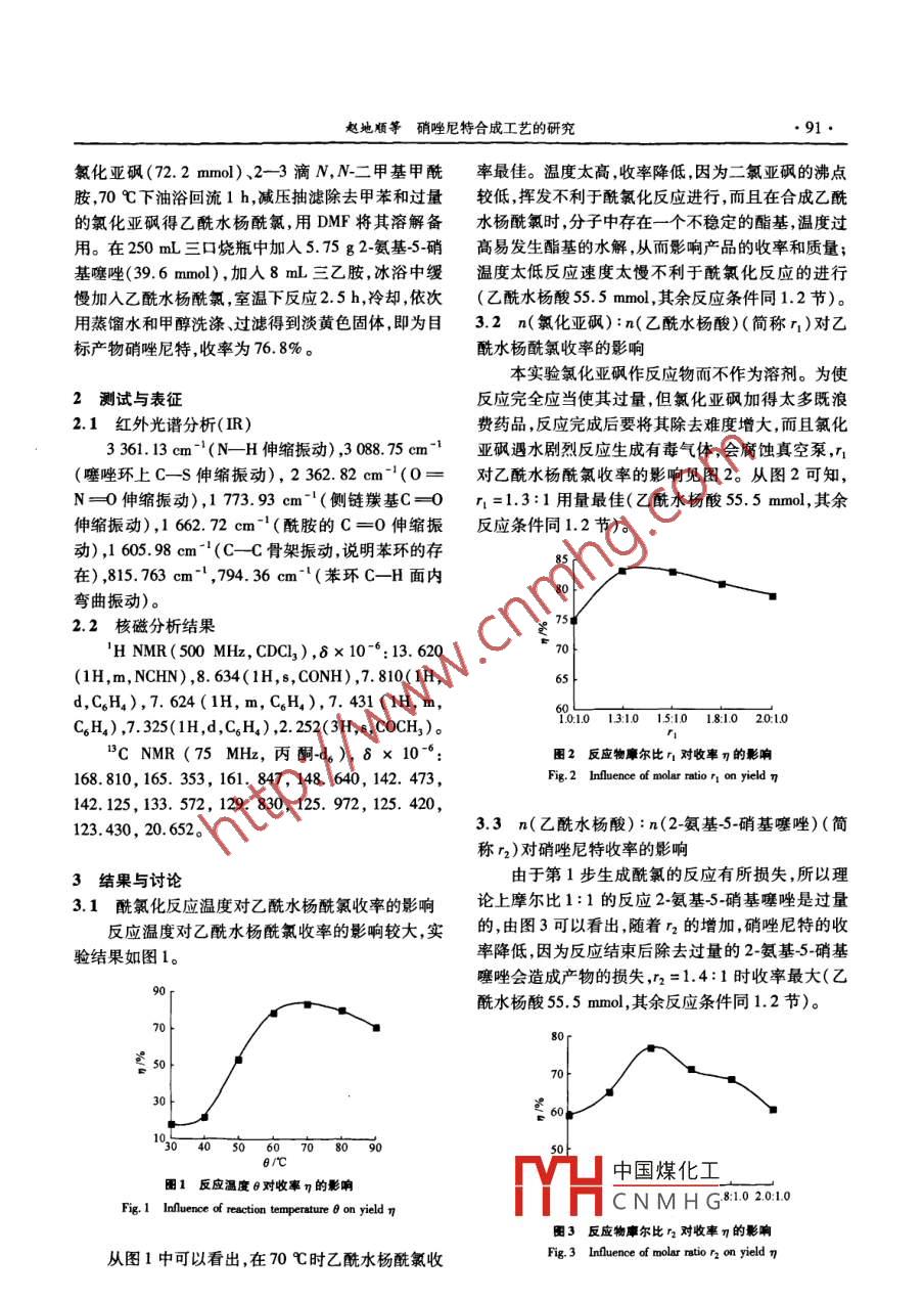第38卷第11期化學(xué)工程Vol 38 No 112010年11月CHEMICAL ENGINEERING( CHINA)Nov.2010硝唑尼特合成工藝的研究趙地順,呂斌2,段二紅,張娟,中曉冰(河北科技大學(xué)1.化學(xué)與制藥工程學(xué)院;2.理學(xué)院;3.環(huán)境工程與科學(xué)學(xué)院,河北石家莊050018)摘要:由乙酰水楊酸和2氨基5-硝基噻唑?yàn)樵?選用NN二甲基甲酰胺和三乙胺分別作為催化劑和縛酸劑,經(jīng)酰胺化反應(yīng)生成一種抗寄生蟲新藥一硝唑尼特,其較佳的工藝條件:酰氯化反應(yīng)溫度70℃氯化亞砜與乙酰水楊酸的摩爾比為1.3:1,乙酰水楊酸與2氨基5-硝基噻唑的摩爾比為14:1,酰胺化反應(yīng)時間25h,收率達(dá)768%。該工藝簡單,收率高具有較好的應(yīng)用價值。關(guān)鍵詞:乙酰水楊酸;2-氨基5-硝基噻唑;酰胺化;硝唑尼特中圖分類號:0626.1文獻(xiàn)標(biāo)識碼:A文章編號:1005-9954(2010)1100903Research on synthesis of nitazoxanideZHAO Di-shun', LU Bin, DUAN Er-hong ZHANG Juan', SHEN Xiao-bing(1. College of Chemistry and Pharmaceutical Engineering; 2. College of Sciences3. College of Environmental Science and Engineering, Hebei University ofcience and Technology, Shijiazhuang 050018, Hebei Province, ChinaAbstract: A new-type antiparasitic drug, nitazoxanide, was synthesized through amidation from acetylsalicylic acidand 2-amino-5-nitrothiazole in the presence of N, N-dimethylform amide as catalyst and triethylamine as acidacceptor.The optimal conditions were as follows: the temperature of acyl chloride is 70 C, the molar ratio ofsOCI2 to acetylsalicylic acid is 1.3: 1, the molar ratio of acetylsalicylic acid to 2-amino-5-nitrothiazole is 1.4:1the reaction time of amidation is 2.5 h. Under such optimal reaction conditions, the conversion can reach 76.8%Owning to its simple process and high yield, the development of nitazoxanide synthesis has an excellent prospect.Key words: acetylsalicylic acid; 2-amino-5-nitrothiazole; amidation; nitazoxanide硝唑尼特是一種用于治療線蟲、絳蟲、吸蟲等體1實(shí)驗(yàn)部分內(nèi)寄生蟲病的新藥,由于其特效抗原蟲、較強(qiáng)的11主要儀器和試劑抗腸道寄生蟲作用2,能有效治療嚴(yán)重輪狀病毒感DF1型集熱式磁力攪拌器,江蘇省榮華儀器制染性腹瀉),也可用于治療艾滋病(AIDs)患者的造有限公司;H3型恒溫磁力攪拌器江蘇醫(yī)疔儀隱孢子蟲病'。最近科學(xué)家還發(fā)現(xiàn)了硝唑尼特有器廠;F3型三用紫外儀,上海市安亭電子儀器廠治療慢性乙肝的作用??梢?開發(fā)此藥具有極AL204型電子天平梅特勒托利多儀器(上海)有限好的前景和重要的意義。公司;SHB-Ⅲ型循環(huán)水式多用真空泵,鄭州長城科李少華等叫對硝唑尼特的合成做了一定的研工貿(mào)有限公司,52A型旋轉(zhuǎn)蒸發(fā)器,上海亞榮生究,收率不到70%,并且反應(yīng)步驟多,中間產(chǎn)物不穩(wěn)甲苯,乙酰水楊酸氯化亞砜,N,N-二甲基甲酰胺定,乙酸酐的腐蝕性較大不利于工業(yè)化生產(chǎn)。目2.氨基5硝基噻唑,三乙胺以上藥品均為分析純。前,國內(nèi)還沒有成熟的合成工藝。1.2實(shí)驗(yàn)過程和方法本文以乙酰水楊酸和2氨基5-硝基噻唑?yàn)樵谘b有電動攪拌器、溫度計(jì)和冷凝管(頂端附料,確定了硝唑尼特的最優(yōu)合成路線探索并優(yōu)化了有氯H中國煤化工瓶中依次加入反應(yīng)條件。10CNMHGL甲苯525mL作者簡介:趙地順(1945-),男教授博士生導(dǎo)師,主要從事清潔能源化工與工業(yè)催化的研究電話:(0311)88632009,Eml: dishunzhao趙地順等硝唑尼特合成工藝的研究91氯化亞砜(72.2mmol)、2-3滴N,N-二甲基甲酰率最佳。溫度太高,收率降低,因?yàn)槎葋嗧康姆悬c(diǎn)胺,70℃下油浴回流1h減壓抽濾除去甲苯和過量較低,揮發(fā)不利于酰氯化反應(yīng)進(jìn)行,而且在合成乙酰的氯化亞砜得乙酰水楊酰氯,用DMF將其溶解備水楊酰氯時,分子中存在一個不穩(wěn)定的酯基,溫度過用。在250mL三口燒瓶中加人5.75g2氨基-硝高易發(fā)生酯基的水解,從而影響產(chǎn)品的收率和質(zhì)量;基噻唑(39.6mmo),加入8mL三乙胺,冰浴中緩溫度太低反應(yīng)速度太慢不利于酰氯化反應(yīng)的進(jìn)行慢加入乙酰水楊酰氯,室溫下反應(yīng)25h,冷卻依次(乙酰水楊酸55.5mmol,其余反應(yīng)條件同12節(jié))用蒸餾水和甲醇洗滌過濾得到淡黃色固體,即為目32n(氯化亞砜):n(乙酰水楊酸)(簡稱r1)對乙標(biāo)產(chǎn)物硝唑尼特,收率為76.8%。酰水楊酰氯收率的影響本實(shí)驗(yàn)氯化亞砜作反應(yīng)物而不作為溶劑。為使2測試與表征反應(yīng)完全應(yīng)當(dāng)使其過量,但氯化亞砜加得太多既浪2.1紅外光譜分析(IR)費(fèi)藥品,反應(yīng)完成后要將其除去難度增大,而且氯化3361.13cm(NH伸縮振動),308875亞砜遇水劇烈反應(yīng)生成有毒氣體,會腐蝕真空泵,r1(噻唑環(huán)上C-S伸縮振動),2362.82cm-1(0對乙酰水楊酰氯收率的影響見圖2。從圖2可知N=0伸縮振動),1773.93cm-(側(cè)鏈羰基C=0n1=1.3:1用量最佳(乙酰水楊酸55.5mml,其余伸縮振動),1662.72cm-1(酰胺的C=0伸縮振反應(yīng)條件同1.2節(jié))。動),1605.98cm1(C—C骨架振動,說明苯環(huán)的存在),815.763cm-1,794.36cm(苯環(huán)C一H面內(nèi)彎曲振動)。2.2核磁分析結(jié)果HNMR(500MHz,CDC3),8×106:13.620(1H,m,NCHN),8.634(1H,s,CONH),7.810(1H,d,C6H4),7.624(1H,m,C6H),7.431(1H,m,C6H4),7325(1H,d,C6H4),2.252(3H,s,COCH3)。010131015:1018:102010CNMR(75MH,丙酮-d),8×106圖2反應(yīng)物摩爾比r1對收率n的影響168.810,165.353,161.847,148.640,142.473Fig. 2 Influence of molar ratio r, on yield n142.125,133.572,129.830,125.972,125.420,3.3n(