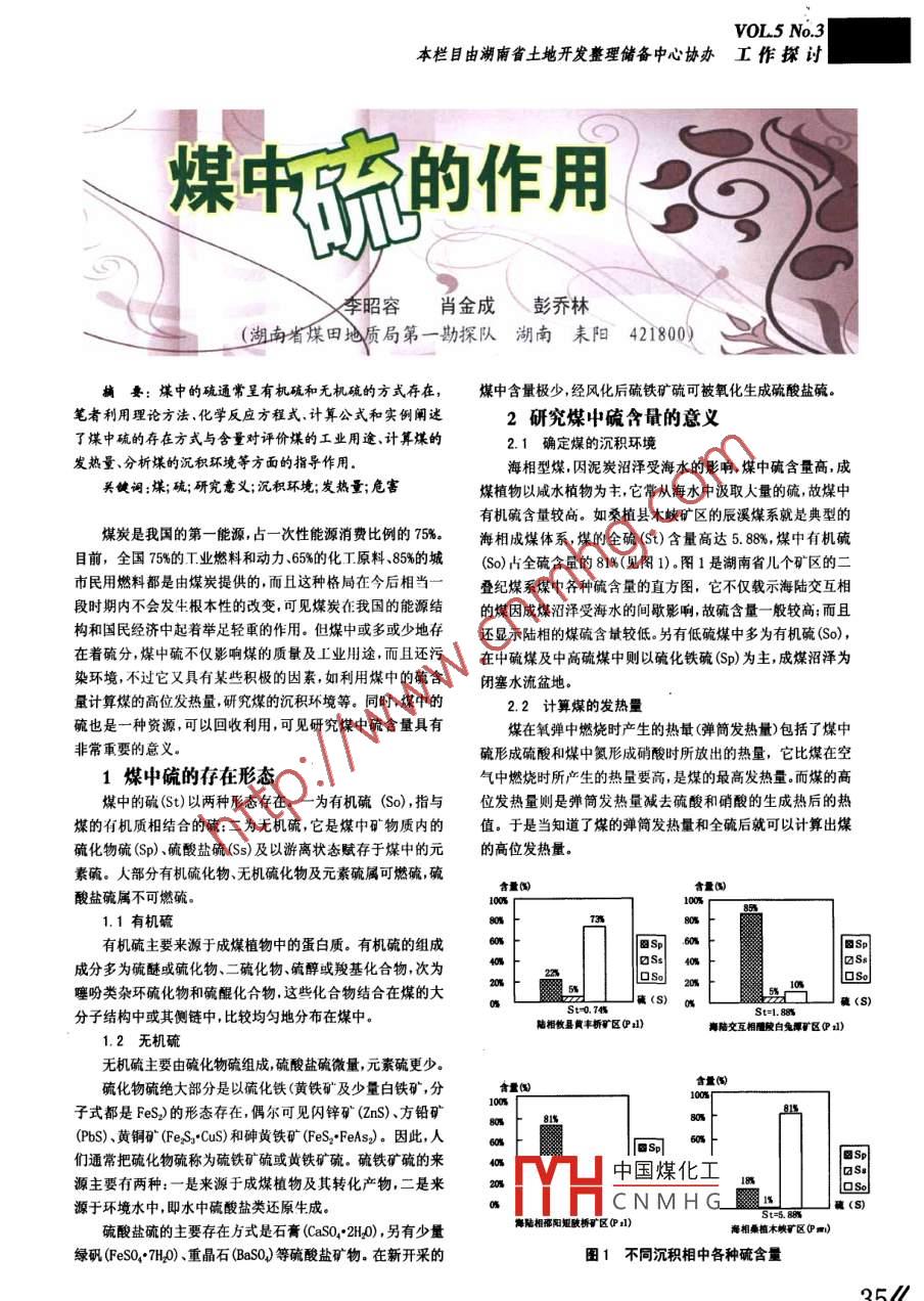 VOL.5 No.3本欄目由湖南省土地開發(fā)整理儲備中心協(xié)辦工 作探討煤中空的作,用! 38李昭容肖金成、 彭喬林(湖南省煤田地質(zhì)局第一-勘探隊湖南耒陽421800)摘要: 煤中的硫通常呈有機硫和無機硫的方式存在,煤中含量極少,經(jīng)風(fēng)化后硫鐵礦硫可被氧化生成硫酸鹽硫。筆者利用理論方法.化學(xué)反應(yīng)方程式.計算公式和實例闡述2研究煤中硫含量的意義了煤中硫的存在方式與含量對評價煤的工業(yè)用途、計算煤的2.1 確定煤的沉積環(huán)境發(fā)熱量、分析煤的沉積環(huán)境等方面的指導(dǎo)作用。海相型煤,囚泥炭沼澤受海水的影響,煤中硫含量高,成關(guān)鍵詞:煤;硫;研究意義;沉積環(huán)境;發(fā)熱量;危害煤植物以咸水植物為主,它常從海水中汲取大量的硫,故煤中有機硫含量較高。如桑植縣木峽礦區(qū)的辰溪煤系就是典型的煤炭是我國的第一能源, 占- -次性能源 消費比例的75%。海相成煤體系,煤的全硫(St)含量高達5. 88%,煤中有機硫目前,全國75%的.T.業(yè)燃料和動力、65%的化工原料、85%的城(So)占全硫含量的81%(見圖1).圖1是湖南省幾個礦區(qū)的二市民用燃料都是由煤炭提供的,而且這種格局在今后相當(dāng)一疊紀(jì)煤系煤中各種硫含量的直方圖,它不僅載示海陸交互相段時期內(nèi)不會發(fā)生根本性的改變,可見煤炭在我國的能源結(jié)的煤因成煤沼澤受海水的間歇影響,故硫含量一-般較高; 而且構(gòu)和國民經(jīng)濟中起著舉足輕重的作用。但煤中或多或少地存還顯示陸相的煤硫含量較低。另有低硫煤中多為有機硫(So),在著硫分,煤中硫不僅影響煤的質(zhì)最及工業(yè)用途,而且還污在中硫煤及中高硫煤中則以硫化鐵硫(Sp)為主,成煤沼澤為染環(huán)境,不過它又具有某些積極的因素,如利用煤中的硫含閉塞水流盆地。量計算煤的高位發(fā)熱量,研究煤的沉積環(huán)境等。同時,煤中的2.2計算煤的發(fā)熱量硫也是一種資源,可以回收利用,可見研究煤中硫含量具有煤在氧彈中燃燒時產(chǎn)生的熱最(彈簡發(fā)熱量)包括了煤中非常重要的意義。硫形成硫酸和煤中氨形成硝酸時所放出的熱量,它比煤在空1煤中硫的存在形態(tài)氣中燃燒時所產(chǎn)生的熱量要高,是煤的最高發(fā)熱量。而煤的高煤中的硫(St)以兩種形態(tài)存在。-為有機硫(So) ,指與位發(fā)熱量則是彈筒發(fā)熱量減去硫酸和硝酸的生成熱后的熱煤的有機質(zhì)相結(jié)合的硫:二為無機硫,它是煤中礦”物質(zhì)內(nèi)的值。于是當(dāng)知道了煤的彈筒發(fā)熱量和全硫后就可以計算出煤硫化物硫(Sp)、硫酸鹽硫(Ss)及以游離狀態(tài)賦存于煤中的元的高位發(fā)熱量。素硫。大部分有機硫化物、無機碗化物及元素硫?qū)倏扇剂?硫含量閶含量闖酸鹽硫?qū)俨豢扇剂颉?.1有機硫808C有機硫主要來源于成煤植物中的蛋白質(zhì)。有機硫的組成60國Sp成分多為硫醚或硫化物、二硫化物、硫醇或羧基化合物,次為40Ss 40|口SsOSo20噻吩類雜環(huán)硫化物和硫醌化合物,這些化合物結(jié)合在煤的大分子結(jié)構(gòu)中或其側(cè)鏈中,比較均勻地分布在煤中。0St-0.74病(S) oxSt=1. 88硫(S)陸相牧縣黃豐橋礦區(qū)(P1)海陸交互相酬陵白兔潭礦區(qū)01)1.2無機硫無機硫主要由硫化物硫組成,硫酸鹽硫微量,元素硫更少。含量閻硫化物硫絕大部分是以硫化鐵(黃鐵礦及少量白鐵礦,分10%量閣子式都是FeS)的形態(tài)存在,偶爾可見閃鋅礦(ZnS)、方鉛礦81%0% F(PbS)、黃銅礦(FeSs.CuS)和砷黃鐵礦(FeS,+FeAs).因此,人sp|們通常把硫化物硫稱為硫鐵礦硫或黃鐵礦硫。硫鐵礦硫的來8SpaSa源主要有兩種:一是來源于成煤植物及其轉(zhuǎn)化產(chǎn)物,二是來中國煤化工18aSs源于環(huán)境水中,即水中硫酸鹽類還原生成。HCNMHG_5t-5.8L-J硫(S)硫酸鹽硫的主要存在方式是石膏(CaSO.+2H20),另有少量海陸相邵陽矩敲橋礦區(qū)印1)海相桑植木峻礦區(qū)中四)綠礬(FeS0," 7H0) .重晶石(BaSO)等硫酸鹽礦物。在新開采的圖1不同沉積相中各種硫含量35《<2008年第3期Land & Resources Herald高位發(fā)熱量的計算公式為:2.4研究硫與灰分的關(guān)系Qe.FQ.- (22. 5Ss.u+a Qe)(Kcal/kg) (1)煤中全硫含量高,灰分產(chǎn)率也高。這是因為煤燃燒后,非..0..-(94. ISua.Qm.n) (MJ/kg)2)可燃硫只散失結(jié)晶水,其余部分殘留在煤灰中:可燃硫僅少部式中:Q分析煤樣的高位發(fā)熱量:Qow分析煤樣的彈簡分呈揮發(fā)物逸出,絕大部分以三氧化二鐵殘存于煤渣中。煤發(fā)熱量;So由彈筒洗液測得的煤中硫含量(%);當(dāng)煤中全硫燃燒時非可燃硫、可燃硫發(fā)生變化的化學(xué)反應(yīng)式為:(S.) <4%或煤的彈簡發(fā)熱量(.)>16.7 MJ/kg(或> 3500①非i可燃硫石膏失去結(jié)晶水:CaS0,.2H0≌CaS0.+2H20↑Kcal/kg) 時,可用全硫或可燃硫代替S.:. 22.5.94.1煤中硫②可燃硫黃鐵礦、白鐵礦燃燒時生成二氧化硫和三氧化含量的校正值: a硝酸校正系數(shù)。二鐵:(1)式按煤類確定,貧煤、無煙煤、天然焦和石煤取0.0010,4FeS+110,=2Fe202+8S02↑其它煤取0.0015。(2) 式按彈簡發(fā)熱量確定,即Q0w≤16.7③S2與煤中的碳酸鈣和氧作用即生成硫酸鈣:MJ/kg時, a =0.001;當(dāng)25. 1≤>16.7 MJ/kg時,a =0.0012;2CaC0.+2S02+O2→2CaS0,+2C02 ↑當(dāng).>25.1 MJ/kg時, a =0.0016。煤中硫化鐵含量高,煤灰中三氧化二鐵含量也高,煤灰呈2.3 確定硫?qū)γ旱睦糜绊懗潭壬罴t色,煤灰熔融溫度一般較低(煤灰熔融溫度與三氧化二鐵煤的全
