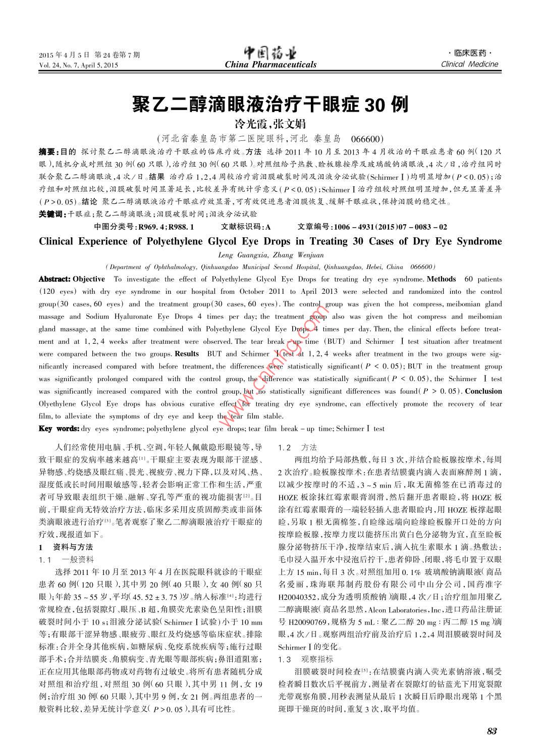 2卷第7期2015年4月5日第24卷第7其中國藥業(yè)·臨床醫(yī)藥 Vol. 24, No. 7, April 5,2015 China Pharmaceuticals Clinical Medicine聚乙二醇滴眼液治療干眼癥30例冷光霞,張文娟(河北省秦皇島市第二醫(yī)院眼科,河北秦皇島066600)摘要:目的探討聚乙二醇滴眼液治療干眼癥的臨床療效。方法選擇2011年10月至2013年4月收治的干眼癥患者60例(120只眼),隨機分成對照組30例(60只眼),治療組30例(60只眼)對照組給予熱敷、板腺按摩及玻璃酸鈉滴眼液,4次/日,治療組同時聯(lián)合聚乙二醇滴眼液,4次/日。結(jié)果治療后1,2,周較治療前淚膜破裂時間及淚液分泌試驗(Schirmer)均明顯增加(P<0.05);治療組和對照組比較,淚膜破裂時間顯延長,比較差異有統(tǒng)計學(xué)意(P0.05)治療組較對照紐明顯增加,但無顯著差異(P>0.05)結(jié)論聚乙二醇滴眼液治療干眼癥療效顯著,可有效促進患者淚膜恢復(fù)、緩解千眼癥狀,保持淚膜的穩(wěn)定性。關(guān)鍵詞:千眼癥;聚乙二醇滴眼液;淚膜破裂時間;淚液分泌試驗中圖分類號:R969.4R988.1文獻標(biāo)識碼:A文章編號:106-4931(201507-0083-0 Clinical Experience of Polyethylene Glycol Eye Drops in Treating 30 Cases of Dry Eye Syndrome Leng Guangxia, Zhang Wenjuan (Department of Ophthalmology, Qinhuangdao Municipal Second Hospital, Qinhuangdno, Hebei, China 066600) Abstract: Objective To investigate the effect of Polyethylene Glycol Eye Drops for treating dry eye syndrome. Methods 60 patients (120 eyes)with dry eye syndrome in our hospital from October 2011 to April 2013 were selected and randomized into the control group(30 cases, 60 eyes) and the treatment group30 cases, 60 eyes). The control group was given the hot compress, meibomian gland massage and Sodium Hyaluronate Eye Drops 4 times per day: the treatment group also was given the hot compress and meibomian gland massage, at the same time combined with Polyethylene Glycol Eye Drops 4 times per day. Then, the clinical effects before treat- ment and at 1, 2, 4 weeks after treatment were observed. The tear break-up time (BUT) and Schirmer I test situation after treatment were compared between the two groups. Results BUT and Schirmer I test at 1, 2. 4 weeks after treatment in the two groups were sig nificantly increased compared with before treatment the differences were statistically significant( 0.05: BUT in the treatment group was significantly prolonged compared with the control group, the difference was stically significant (P 0.05), the Schirmer I test was significantly increased compared with the control group, but no statistically significant differences was found(P >0.05). Conclusion Olyethylene Glycol Eye drops has obvious curative effect for treating dry eye syndrome, can effectively promote the recovery of tear film, to alleviate the symptoms of dry eye and keep the tear film stable Key words: dry eyes syndrome; polyethylene glycol eye drops; tear film break-up time; Schirmer I test人們經(jīng)常使用電腦、手機、空調(diào),年輕人佩戴隱形眼鏡等,導(dǎo)1.2方法致干眼癥的發(fā)病率越來越高。干眼癥主要表現(xiàn)為眼部干澀感、兩組均給予局部熱敷,每日3次,并結(jié)合臉板腺按摩術(shù),每周異物感、灼燒感及眼紅痛、畏光、視疲勞、視力下降,以及對風(fēng)、熱、2次治療。臉板腺按摩術(shù):在患者結(jié)膜囊內(nèi)滴入表面麻醉劑1滴濕度低或長時間用眼敏感等,輕者會影響正常工作和生活,嚴(yán)重以減少按摩時的不適,3~5min后,取無菌棉簽在已消毒過的者可導(dǎo)致眼表組織干燥、融解、穿孔等嚴(yán)重的視功能損害21目HOZE板涂抹紅霉素眼膏潤滑,然后翻開患者眼瞼,將HOZE板前,干眼癥尚無特效治療方法,臨床多采用皮質(zhì)固醇類或非甾體涂有紅霉素眼膏的一端輕輕插入患者眼瞼內(nèi),用HOZE板撐起眼類滴眼液進行治療3筆者觀察了聚乙醇滴眼液治療干癥的瞼,另取1根無菌棉簽,自瞼緣遠端向瞼緣瞼板腺開口處的方向療效,現(xiàn)報道如下。按摩瞼板腺,按摩力度以能擠壓出黃白色分泌物為宜,直至瞼板1資料與方法腺分泌物擠壓干凈,按摩結(jié)束后,滴入抗生素眼水1滴。熱敷法:1.1一般資料毛巾浸入溫開水中浸泡后擰干,患者仰臥、閉眼,將毛巾置于雙眼選擇2011年10月至2013年4月在醫(yī)院眼科就診的干眼癥上方15min,每日3次對照組加用0.1%玻璃酸鈉滴眼液(商品患者60例(120只眼),其中男20例(40只眼),40例(80只名愛麗,珠海聯(lián)邦制藥股份有限公司中山分公司,國藥準(zhǔn)字眼);年齡35~55歲,平均(45.52±3.75)歲入標(biāo)準(zhǔn)1:均進行H20040352,成分為透明質(zhì)酸鈉滴眼,4次/日;治療組加用聚乙常規(guī)檢查,包括裂隙燈、眼壓、B超,角膜熒光素染色呈陽性;淚膜二醇滴眼液(商品名思然, Alcon Laboratories Inc進口藥品注冊證破裂時間小于10s;淚液分泌試驗 Schirmer試驗)小于10mm號20070規(guī)格為5聚乙等;有眼部干澀異物感、眼疲勞、眼紅及灼燒感等臨床癥狀。排除眼,4次/日。觀察兩組治療前及治療后1,2,4周淚膜破裂時間及標(biāo)準(zhǔn):合并全身其他疾病,如糖尿病、免疫系統(tǒng)疾病等;施行過眼 Schirmer的變化。部手術(shù);合并結(jié)膜炎、角膜病變、青光眼等眼部疾病;鼻淚道阻塞;1.3觀察指標(biāo)正在應(yīng)用其他眼部藥物或?qū)λ幬镉羞^敏史將所有患者隨機分成淚膜破裂時間檢查5:在結(jié)膜囊內(nèi)滴入熒光素鈉溶液,囑受對照組和治療組,對照組30例(60只眼),其中男11例,女19檢者瞬目數(shù)次后平視前方,測量者在裂隙燈的鈷藍光下用寬裂隙例;治療組30例(60只眼),其中男9例,女2例。兩組患者的一光帶