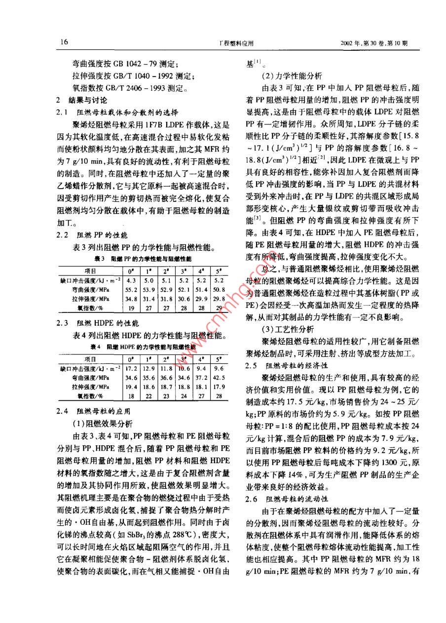周健,等:聚始烴阻燃母粒的制造及應(yīng)用試驗(yàn)15聚烯烴阻燃母粒的制造及應(yīng)用試驗(yàn)周健李(常州技術(shù)師范學(xué)院應(yīng)用化學(xué)系,常州213001)Q32 A摘要采用復(fù)合阻燃劑與 聚烯烴通過擠出造粒法制得聚烯烴(聚丙烯、聚乙烯)阻燃母粒,考察了聚烯烴阻燃母粒用量對阻燃聚丙烯、阻燃聚乙烯力學(xué)性能、流動性、阻燃性的影響。實(shí)驗(yàn)結(jié)果表明,聚烯烴阻燃母粒在生產(chǎn)阻燃聚烯烴制品中具有使用便利、阻燃效果和經(jīng)濟(jì)效益好等特點(diǎn)。關(guān)鍵詞阻燃母粒力學(xué)性能流動性阻燃性隨著國家經(jīng)濟(jì)建設(shè)的不斷發(fā)展,阻燃聚烯烴塑55% ~65%的復(fù)合阻燃劑十溴聯(lián)苯醚- Sb2O3和料的用途日益廣泛。如阻燃聚丙烯( PP)、阻燃聚乙5% ~ 10%的分散劑聚乙烯蠟按- 定次序倒入高速烯( PE)常被用來生產(chǎn)要求阻燃性能的各種管道、板捏合機(jī)中進(jìn)行高速混合約20min,通過高速捏合機(jī)材、通訊電纜、電器零件裝飾材料等。聚烯烴阻燃產(chǎn)生的摩擦熱使LDPE發(fā)粘、分散劑融化.使復(fù)合阻母粒具有使用方便、對阻燃塑料制品的力學(xué)性能影燃劑均勻地粘附在載體上,在約100C下出料。然響小、經(jīng)濟(jì)實(shí)惠等特性。因此筆者研制了聚烯烴阻后將物料與PP(或PE)裝人065擠出造粒機(jī)組,在燃母粒并對其進(jìn)行了應(yīng)用研究。表1的工藝條件下擠出造粒,擠出料條經(jīng)水槽冷卻、1實(shí)驗(yàn)部分空氣冷卻,引人切粒機(jī)切粒、包裝.分別制得PP阻1.1 基本原料燃母粒和PE阻燃母粒。PP:5014,市售;表|阻燃母粒擠出造粒工藝條件高密度聚乙烯( HDPE) :5000S,揚(yáng)子石化公司;項(xiàng)目數(shù)據(jù)低密度聚乙烯( LDPE):1F7B,北京燕山石化公機(jī)簡溫度/C 1區(qū)60-80螺桿轉(zhuǎn)速/r● min-' 500 -750I區(qū)125 -135主機(jī)電流/A25-30司;皿區(qū)135 ~ 145|切粒機(jī)轉(zhuǎn)速/r●min-'I 100 ~1400十溴聯(lián)苯醚;江陰利港化工廠;機(jī)頭溫度/C 130Sb2O,:市售;(2)試樣制備引發(fā)劑:市售;將PP阻燃母粒與PP按表2中阻燃PP各配方聚乙烯蠟:市售;的比例混合,用注塑機(jī)在加料段80~100C、壓縮段光亮劑:TS -2A,吳縣國光化學(xué)助劑有限公司。160~ 180C、均化段180 ~ 200C、噴嘴180C、注塑1.2 主要設(shè)備壓力6~7 MPa下注塑成不同配比的PP標(biāo)準(zhǔn)試樣。065擠出造粒機(jī)組:上海擠出機(jī)廠;阻燃HDPE試樣也按表2中阻燃HDPE各配方高速捏合機(jī):10 L,阜新塑料機(jī)械廠;制備,T藝過程與阻燃PP試樣相同。注塑機(jī):XS -ZY - 125型,杭州塑料機(jī)械廠;t2 阻燃PP與阻燃HDPE試樣配方簡支梁沖擊試驗(yàn)機(jī):UJ-40型,承德市試驗(yàn)機(jī)PP阻燃母粒試樣PE阻燃母粒/PP質(zhì)量比廠:純PP0純HIDPE電子式萬能試驗(yàn)機(jī):WD-1型,吉林長春第二1:91:8材料試驗(yàn)機(jī)廠;:71:熔體流動速率(MFR)測定儀:XR -400型,吉.:6林大學(xué)科教儀器廠;1:5氧指數(shù)測定儀:HC -2型,江寧縣分析儀器廠。1.4 性能測試1.3阻燃聚烯烴母 粒及試樣的制備缺口沖擊強(qiáng)度按GB/T 1043 - 1993測定;(1)阻燃聚烯烴母粒的制造按配方將20%~30%的LDPE(作載體)與收稿日期:2002-07-3016I程塑料應(yīng)用2002年,第30卷.第10期彎曲強(qiáng)度按CB 1042 -79測定;基"。拉伸強(qiáng)度按GB/T 1040 - 1992測定;(2)力學(xué)性能分析氧指數(shù)按CB/T 2406 - 1993測定。由表3可知,在PP中加人PP阻燃母粒后,隨;2結(jié)果與討論著PP阻燃母粒用量的增加,阻燃PP的沖擊強(qiáng)度明2.1阻燃母粒載體和分散 劑的選擇顯提高,這是由于阻燃母粒中的載體LDPE對阻燃聚烯烴阻燃母粒采用1F7B LDPE作載體,這是.PP有一定增韌作用。眾所周知,LDPE分子鏈的柔因?yàn)槠滠浕瘻囟鹊?在高速混合過程中易軟化發(fā)粘順性比PP分子鏈的柔順性好,其溶解度參數(shù)[15.8而使粉狀顏料均勻地分散在其表面,加之其MFR約~17.1(J/cm)"2]與PP的溶解度參數(shù)[16.8 ~為7g/10min,具有良好的流動性,有利于阻燃母粒18.8(J/cm' )"2]相近2,因此LDPE在微觀上與PP的制造。同時,在阻燃母粒中還加入了一定量的聚具有良好的相容性,能彌補(bǔ)因加入復(fù)合阻燃劑而降乙烯蠟作分散劑,它與其它原料一起被高速混合時,低PP沖擊強(qiáng)度的影響,當(dāng)PP與LDPE的共混材料因受剪切作用產(chǎn)生的剪切熱而被完全熔化使復(fù)合受到外來沖擊時在PP與LDPE的共混區(qū)域形成局阻燃劑均勻分散在載體中,有助于阻燃母粒的制造部形變核心,產(chǎn)生大量銀紋或剪切帶而吸收沖擊加T。能[”]。但阻燃PP的彎曲強(qiáng)度和拉伸強(qiáng)度有所下2.2阻燃PP的性能降。由表4可知,在HDPE中加入PE阻燃母粒后,表3列出阻燃PP的力學(xué)性能與阻燃性能。隨PE阻燃母粒用量的增大,阻燃HDPE的沖擊強(qiáng)褒3阻繼PP的力學(xué)性能與阻燃性能度有所降低,彎曲強(qiáng)度提高,拉伸強(qiáng)度變化不大。項(xiàng)目I 0" 122345總之,與普通阻燃聚烯烴相比,使用聚烯烴阻燃缺口沖擊強(qiáng)度/J.m-2 4.35.0 I 5.1 5.2 5.2 5.2母粒的阻燃聚烯烴可以提高綜合力學(xué)性能。這是因彎曲強(qiáng)度/MPa55.253.952.952.151.4 50.拉伸強(qiáng)度/MPa34.831.4|31.830.629.929.8為普通阻燃聚烯烴在造粒過程中其基體樹脂(PP或氧指數(shù)/%19| 27272828 29PE)會因經(jīng)受一次高溫加熱而發(fā)生- -定程度的熱降解,從而對其制品的力學(xué)性能有- -定不良影響。2.3阻燃 HDPE的性能表4列出阻燃HDPE的