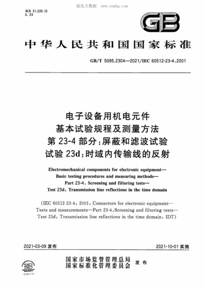 GB/T 5095.2304-2021電子設(shè)備用機(jī)電元件 基本試驗(yàn)規(guī)程及測(cè)量方法 第23-4部分:屏蔽和濾波試驗(yàn) 試驗(yàn)23d:時(shí)域內(nèi)傳輸線的反射Electromechanical components for electronic equipment—Basic testing procedures and measuring methods—Part 23-4: Screening and filtering tests—Test 23d:Transmission l