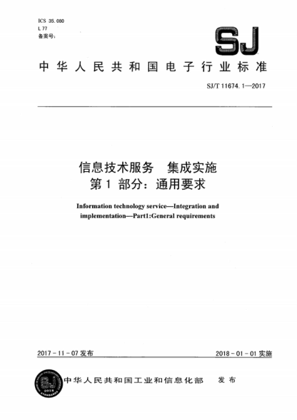 SJ/T 11674.1-2017 信息技術(shù)服務(wù) 集成實施 第1部分:通用要求 Information technology service-Integration and implementation-Part1:General requirements