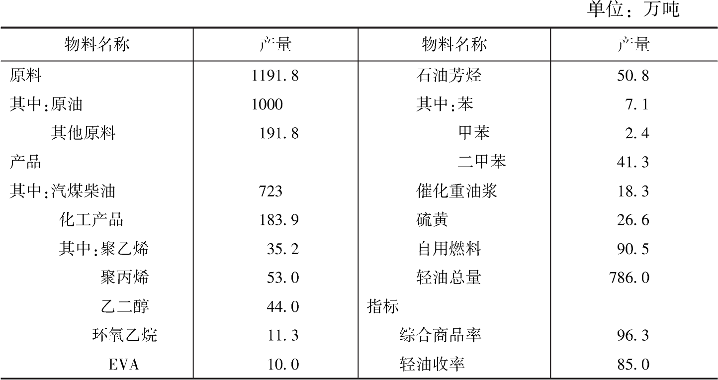 表3 煉化一體化1000萬噸/年投入產(chǎn)出情況