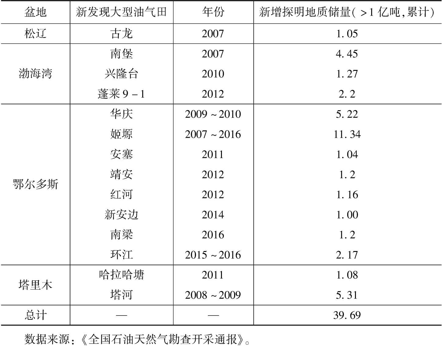 統(tǒng)計顯示,2007~2016年,先后獲得22個億噸級以上重大油氣發(fā)現(xiàn),新探明億噸級以上的大型油田或油氣區(qū)14個,合計新增探明石油地質(zhì)儲量39.7億噸(見表1)。其中,2007~2010年,主要石油勘探發(fā)現(xiàn)集中在渤海灣、鄂爾多斯、塔里木、松遼等盆地,相繼探明了塔河、華慶、南堡、姬塬(2次新增)、興隆臺和古龍6個億噸級油田。