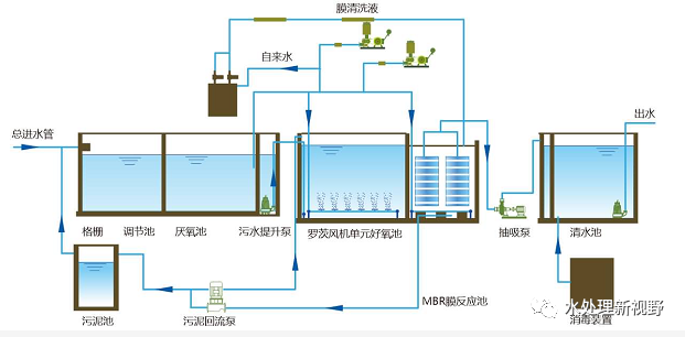 原水→格柵→調(diào)節(jié)池→提升泵→生物反應(yīng)器→循環(huán)泵→膜組件→消毒裝置→中水貯池→中水用水系統(tǒng)。