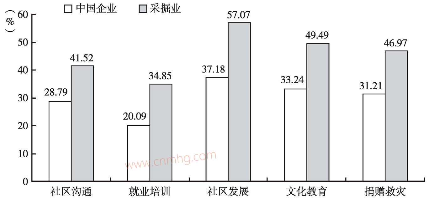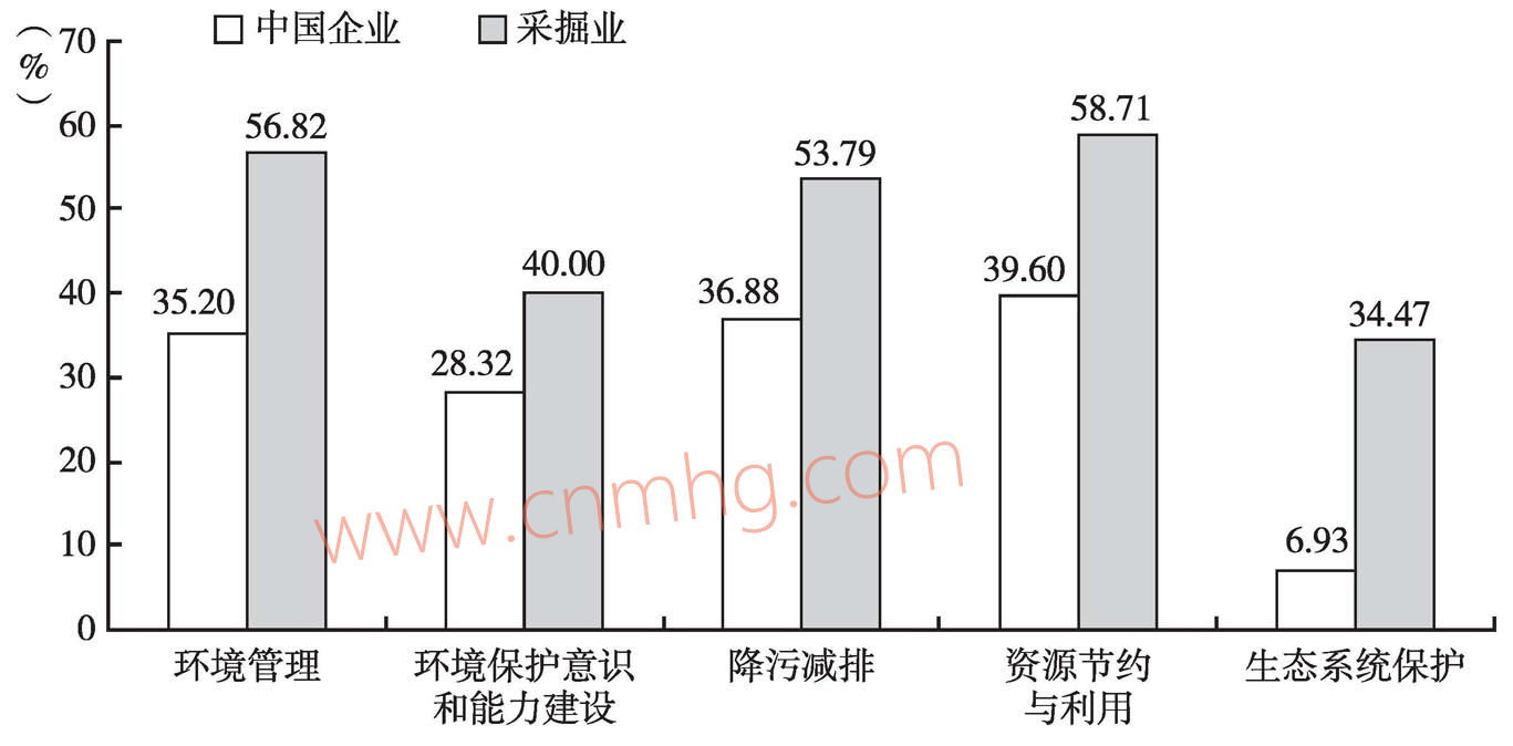 采掘行業(yè)報告對環(huán)境管理、環(huán)境保護意識和能力建設、降污減排、資源節(jié)約與利用和生態(tài)系統(tǒng)保護的信息披露整體高于中國企業(yè)平均水平,尤其是對生態(tài)系統(tǒng)保護的信息披露。采掘業(yè)報告中生態(tài)系統(tǒng)保護指標得分率為34.47%,是中國企業(yè)報告平均水平的5倍。采掘業(yè)報告重視對環(huán)境履責信息的披露,重視向各界利益相關方通報企業(yè)環(huán)境行動和績效,說明采掘業(yè)企業(yè)的經營理念正由“對股東負責”轉變?yōu)椤皩蓶|和環(huán)境負責”,對環(huán)境履責更加積極主動。