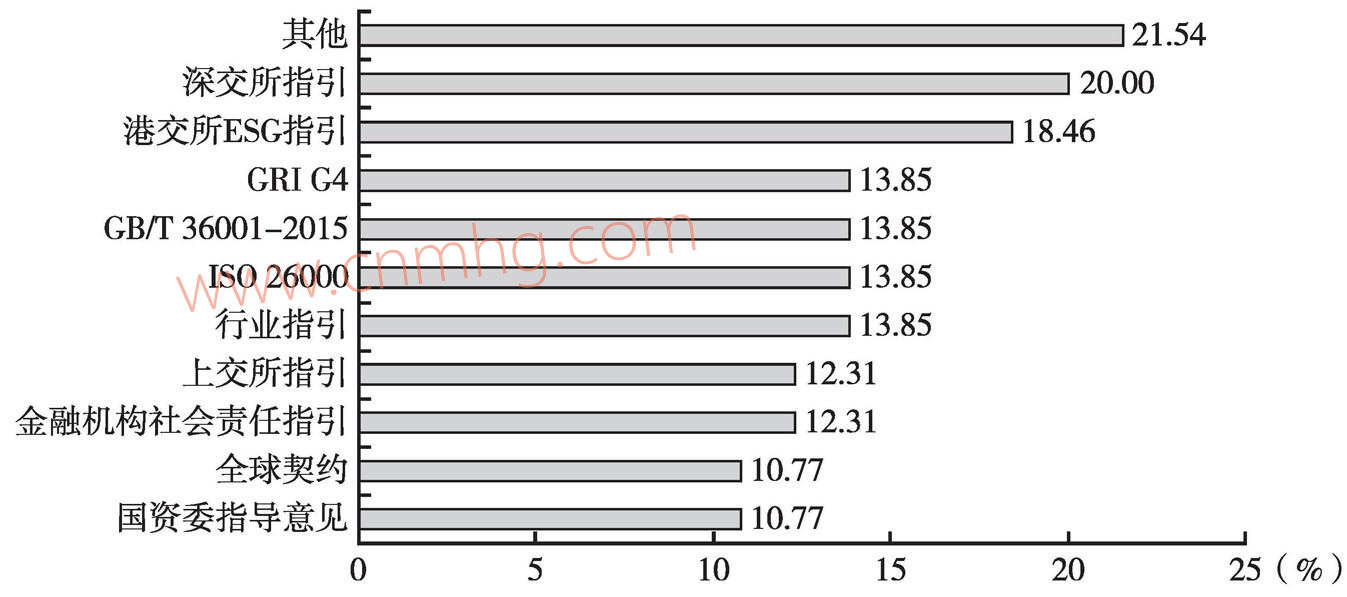過半數采掘業(yè)發(fā)布報告次數在5次及以上,占比為63.04%。65份報告中,有27份報告采用多種編制依據,占采掘業(yè)報告總數的41.54%;參考單一編制依據的報告有25份,占采掘業(yè)報告總數的38.46%。另有13份報告未說明對標的編制依據。深交所的“深圳證券交易所上市公司社會責任指引”引用率最高,為20%;位列前三的6種編制依據中有4種為本土行業(yè)指引,占比為66.16%。