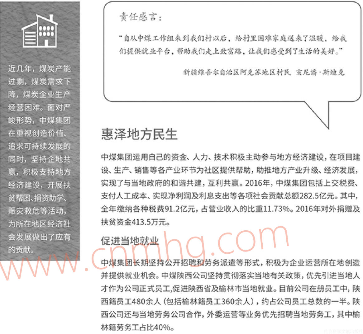 40%的采掘業(yè)報告中披露企業(yè)的負面信息,而中國企業(yè)僅有25.75%的報告提及企業(yè)的負面信息。采掘業(yè)勇于披露在安全生產、環(huán)境保護和社區(qū)和諧等方面的不足,認真反思和總結,并披露企業(yè)將采取的行動,顯示了采掘業(yè)真誠與各界利益相關方交流的態(tài)度以及解決問題的決心。此外,67.69%的企業(yè)報告中提及利益相關方評價,顯著高于中國企業(yè)報告的41.1%,說明采掘業(yè)與各界利益相關方互動良好,在編制報告過程中鼓勵利益相關方參與,如《中國中煤能源集團有限公司2016社會責任報告》。采掘業(yè)報告對負面信息和利益相關方評價的披露,大大增加了采掘業(yè)報告的可信性,加強了企業(yè)與利益相關方的有效溝通。
