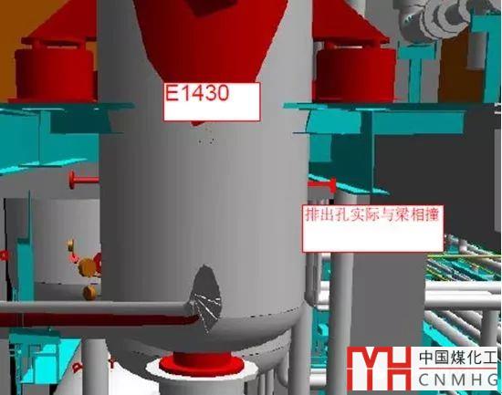 現(xiàn)場(chǎng)倉(cāng)庫(kù)中發(fā)現(xiàn)接管與耳座非常接近,之后提醒配管,發(fā)現(xiàn)梁與下面接管相碰,在模型審查中遺漏了此處。后通過(guò)更換較小的鋼結(jié)構(gòu)梁解決問(wèn)題。