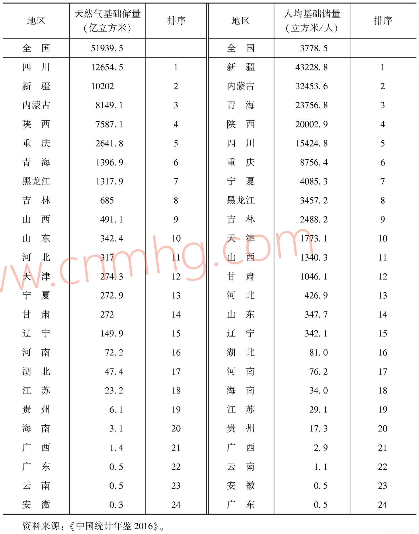 受地質(zhì)條件和生成環(huán)境影響,河南省天然氣資源非常有限,天然氣基礎(chǔ)儲量[1]及人均儲量在全國居于中等偏下水平。截至2015年底,河南省天然氣基礎(chǔ)儲量72.2億立方米,居全國第17位。人均基礎(chǔ)儲量76.2立方米,居全國第17位,遠(yuǎn)低于全國平均水平(3778.5立方米/人),僅為全國平均水平的2.0%(見表1)。