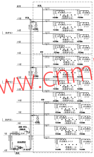 按照上述分區(qū)方案,會(huì)增加細(xì)水霧泵組至檔案庫(kù)房的管網(wǎng)長(zhǎng)度,必須兼顧分區(qū)控制閥至開(kāi)式區(qū)域閥組的管道長(zhǎng)度,避免管網(wǎng)充水時(shí)間過(guò)長(zhǎng),確保系統(tǒng)設(shè)計(jì)響應(yīng)時(shí)間不大于30 s。一般情況下,一路火災(zāi)報(bào)警后,分區(qū)控制閥打開(kāi)已經(jīng)開(kāi)始為管網(wǎng)預(yù)充水,待第二路報(bào)警時(shí),火災(zāi)信號(hào)確認(rèn),開(kāi)式區(qū)域閥組打開(kāi)。因此,只要保證開(kāi)式區(qū)域閥組后管網(wǎng)30 s內(nèi)充水,最不利細(xì)水霧噴頭出水即可。但是,在極端情況下,火災(zāi)報(bào)警的2路信號(hào)幾乎為同時(shí)報(bào)警,此情況下,分區(qū)控制閥、開(kāi)式區(qū)域閥組同時(shí)打開(kāi),設(shè)計(jì)流量下,分區(qū)控制閥后的管網(wǎng)必須在30 s內(nèi)完成充水。例如,在本項(xiàng)目標(biāo)準(zhǔn)層的高壓細(xì)水霧設(shè)計(jì)中,經(jīng)計(jì)算,最不利防護(hù)分區(qū)的開(kāi)式區(qū)域閥組至末端噴頭的充水時(shí)間約為14 s。則分區(qū)控制閥與最不利開(kāi)式區(qū)域閥組間管道的充水時(shí)間需不大于16 s。該管道管徑DN32,設(shè)計(jì)流量為420 L/min,流速7.4 m/s,則分區(qū)控制閥至最不利開(kāi)式區(qū)域閥組管道的最大長(zhǎng)度為118 m。根據(jù)這一計(jì)算結(jié)果,本項(xiàng)目設(shè)計(jì)采用1個(gè)分區(qū)控制閥控制不超過(guò)4層標(biāo)準(zhǔn)層的開(kāi)式區(qū)域閥組(見(jiàn)圖1)。