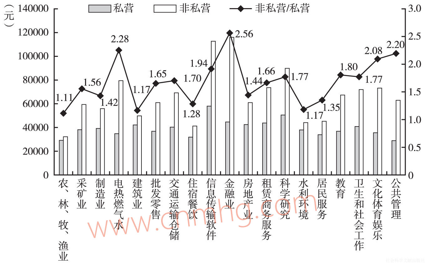 圖6-6 分行業(yè)城鎮(zhèn)私營(yíng)單位和非私營(yíng)單位平均工資對(duì)比(行業(yè)名稱(chēng)從簡(jiǎn),下同)
