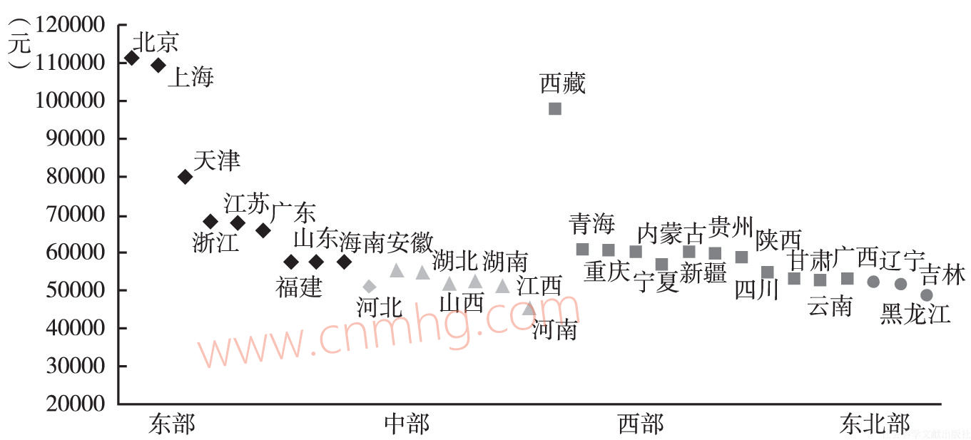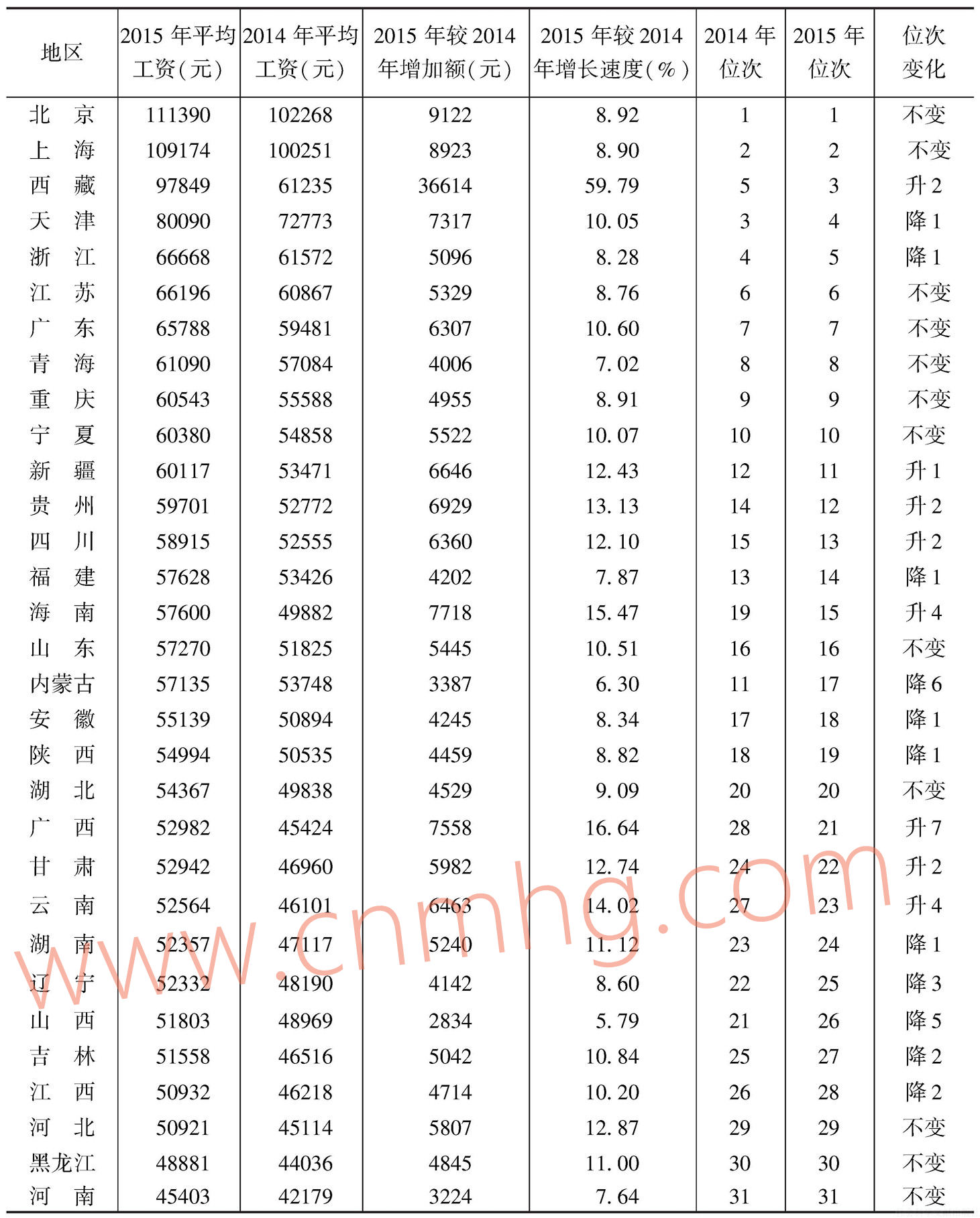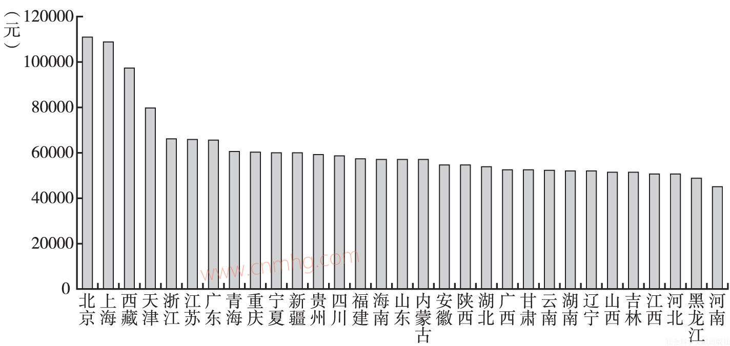 2015年各省份排列位次較2014年顯示出以下特點(diǎn):一方面,北京、上海、西藏、天津、浙江仍排列第一到第五位,西藏從第五位躍升至第三位;河南、黑龍江、湖北仍位列最后三位。另一方面,西部各省份的相對(duì)排名大大提前。新疆、貴州、四川、廣西、甘肅、云南排位均上升,尤其是廣西,上升了7位,從第28位上升到第21位,其他地區(qū)位次也有變化,內(nèi)蒙古下降6位,山西下降5位。