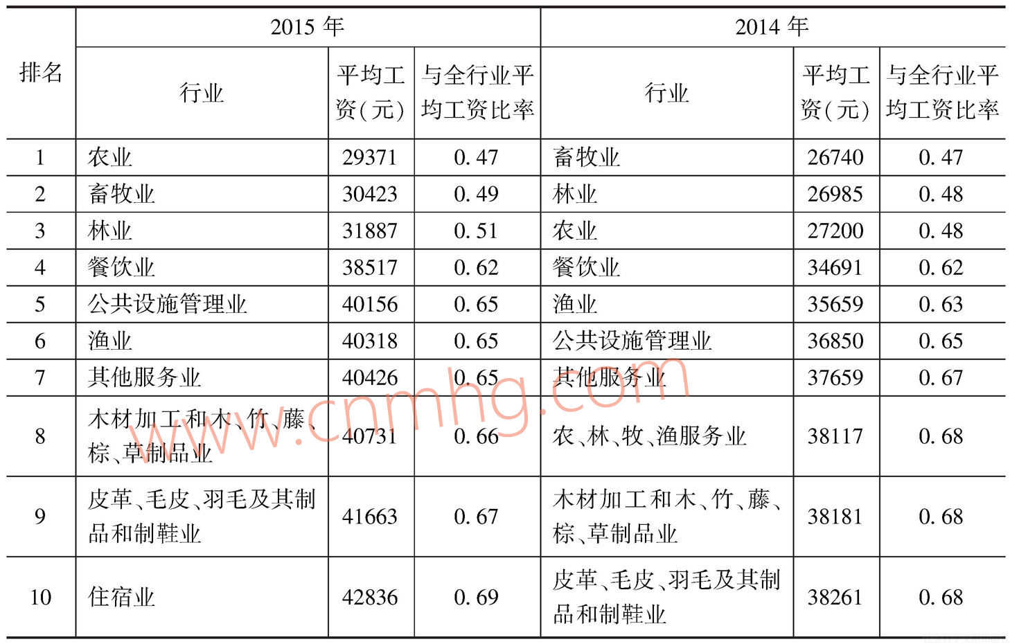 表6-3列示了平均工資排名在最后十位的大類(lèi)行業(yè)。與2014年相比,除了農(nóng)、林、牧、漁服務(wù)業(yè)退出倒數(shù)后十位,住宿業(yè)再一次排名倒數(shù)第十外,其他行業(yè)仍然排名后十位,且位次變化也很小。工資最低的是農(nóng)業(yè)、林業(yè)、畜牧業(yè),盡管農(nóng)業(yè)取代畜牧業(yè)排名工資水平最低,但二者的平均工資并不存在顯著差異;餐飲業(yè)仍排名第四;公共設(shè)施管理業(yè)、漁業(yè)、其他服務(wù)業(yè)平均工資水平比較接近,排位也相對(duì)穩(wěn)定。整體上看,排名后十位的行業(yè)其共同特征是都屬于勞動(dòng)密集型行業(yè),市場(chǎng)競(jìng)爭(zhēng)非常充分且在產(chǎn)業(yè)結(jié)構(gòu)變遷中處于不利位置,對(duì)從業(yè)人員專(zhuān)業(yè)水平要求也比較低,這就進(jìn)一步反映了行業(yè)特點(diǎn)和人力資本對(duì)就業(yè)人員工資水平的影響。